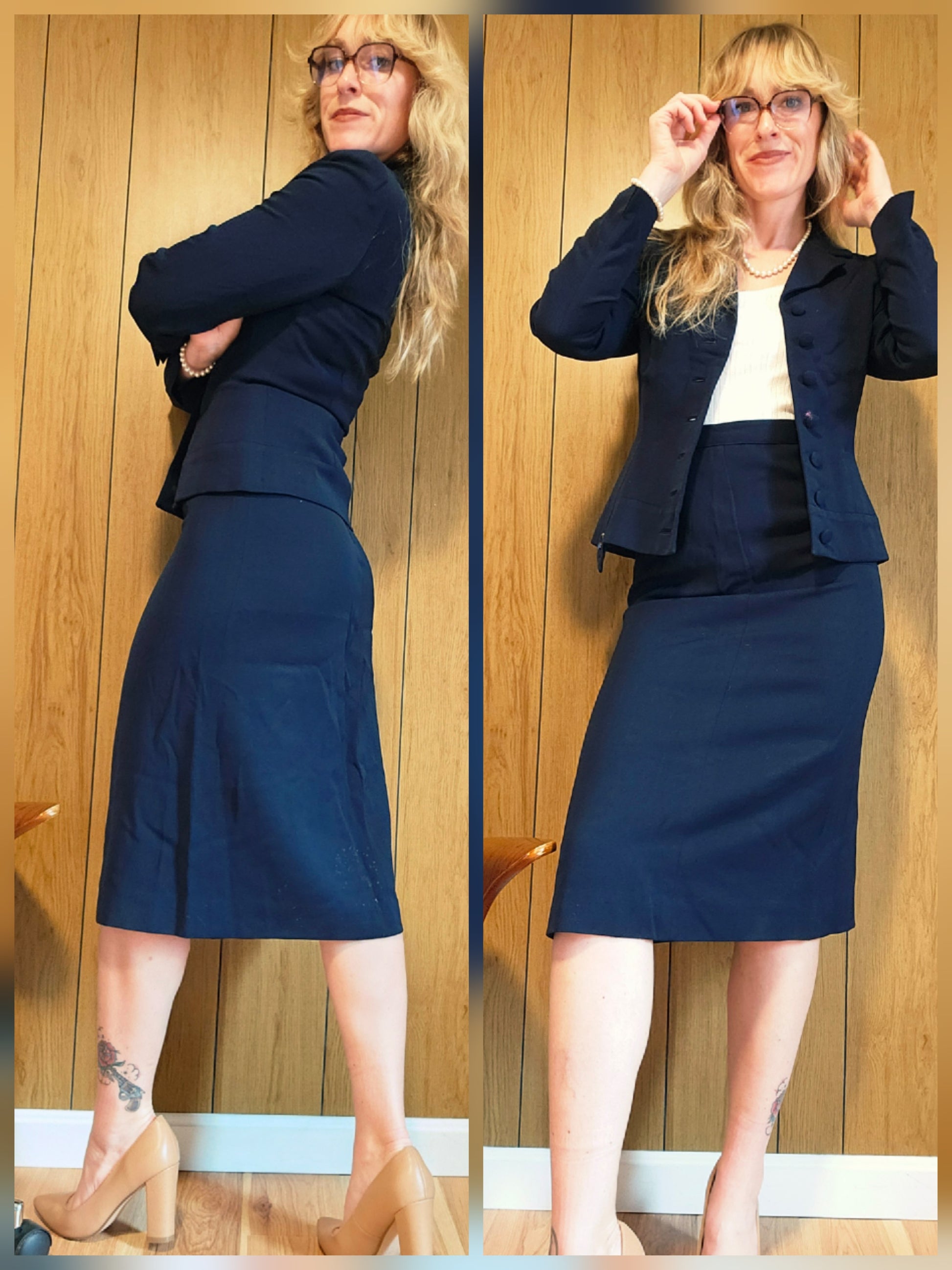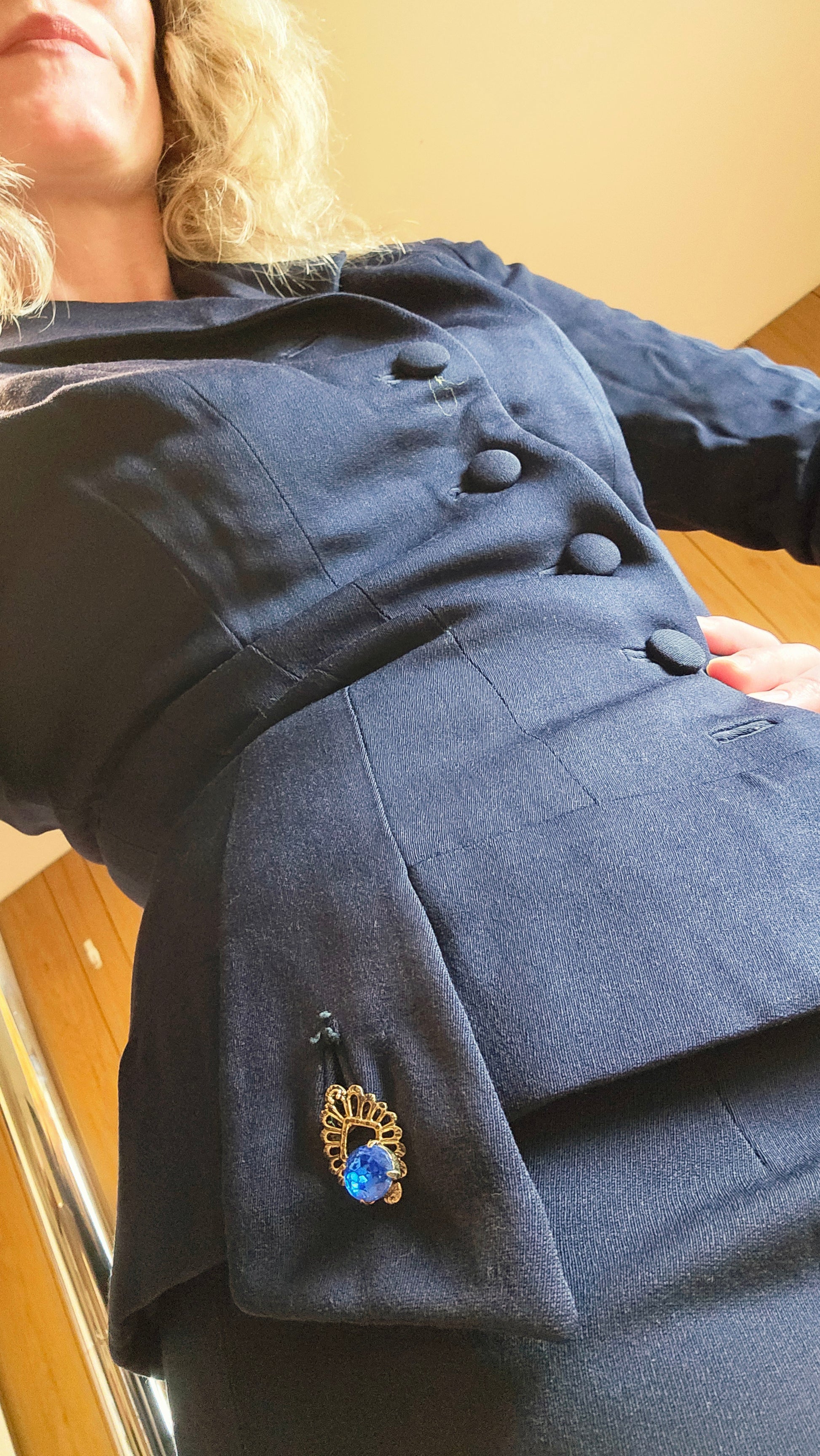Amazing 1950s navy blue skirt suit! Includes the akirt and jacket in this two piece set. The jacket is tapered and fitted to accent the waist, giving it a (powerful!) feminine touch! Fits like a modern XS/S in my opinion, please refer to measurements below taken laid flat, so please double where applicable. The jacket features a beautiful blue faux rhinestone brooch accent sewn in. The union made suit has a vintage union label from the Amalgamated Clothing Workers of America (ACWA), from the National Coat and Suit Industry Recovery Board.