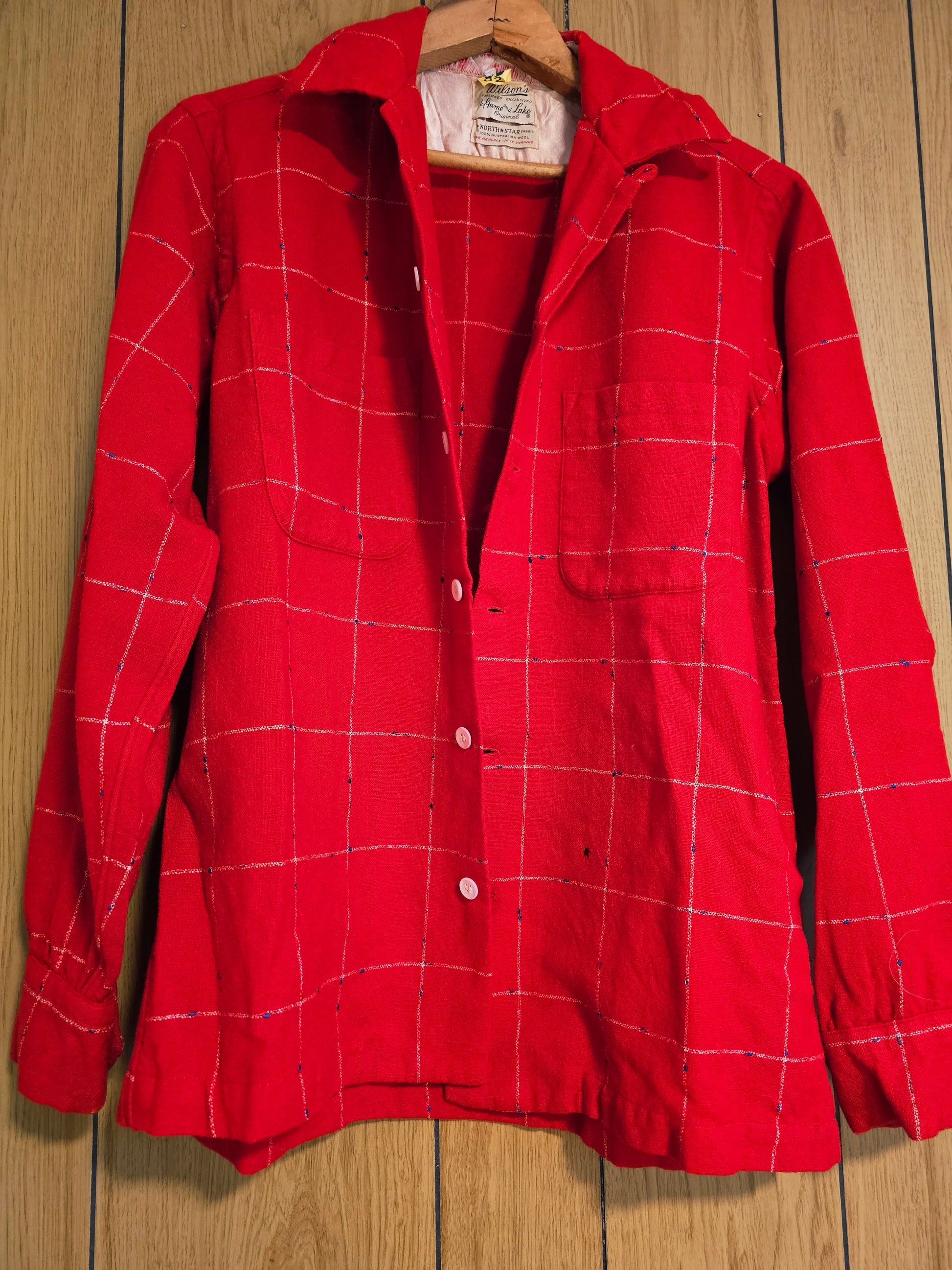 1950's Wilson's Game & Lake Australian wool flannel. Distressed style. Holes in left elbow, front lower left & on right armpit. Modeled here on a female medium. Measurements below taken laid flat: