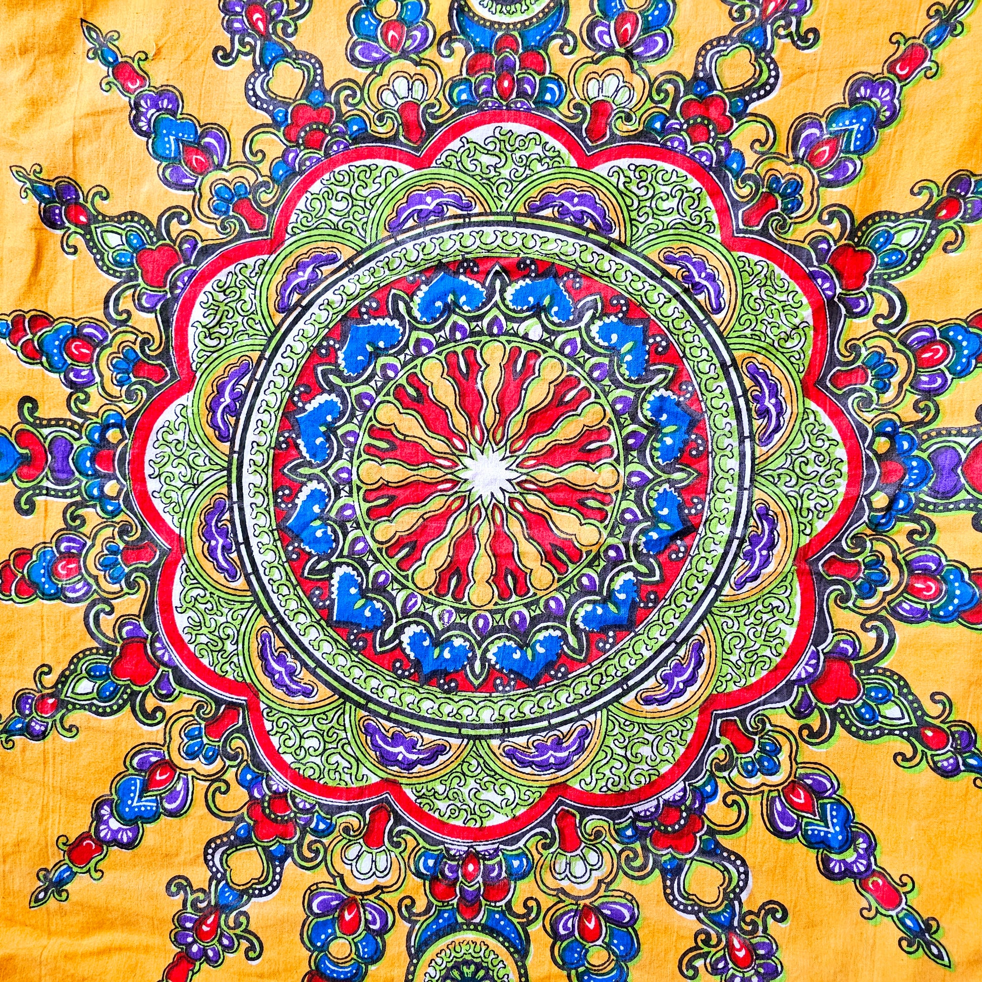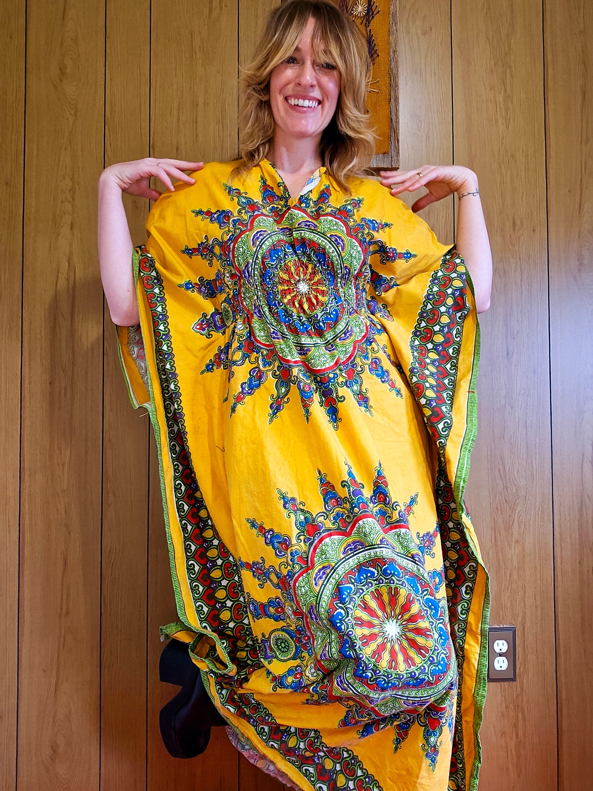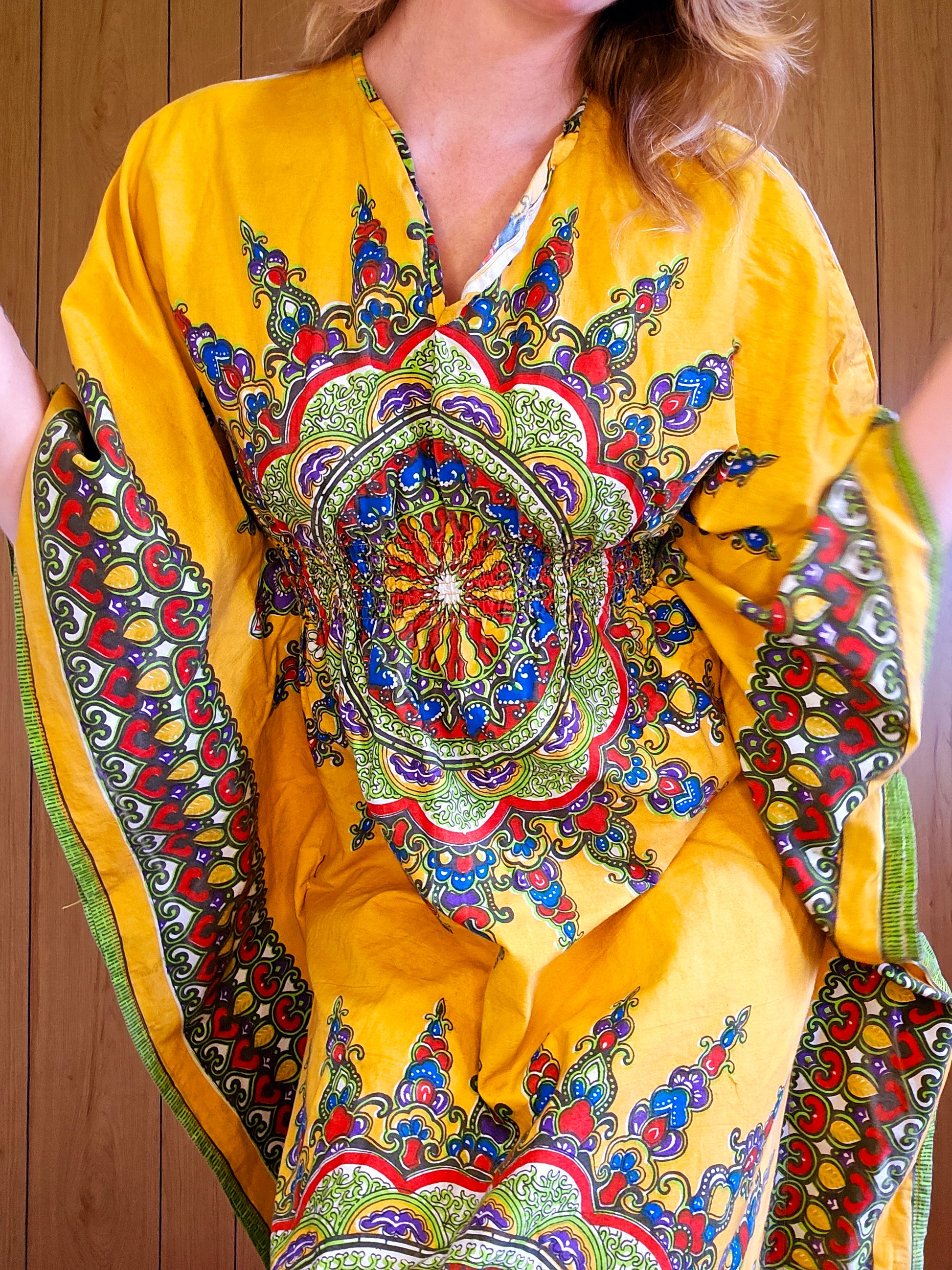 Beautiful golden yellow, red, blue and green Kaftan Dress from the 1960s/1970s. Elastic waist/under bust measures 24" at rest and 34" stretched, and total length of 55" long. I would describe this fitting well very generally as a small/medium.
