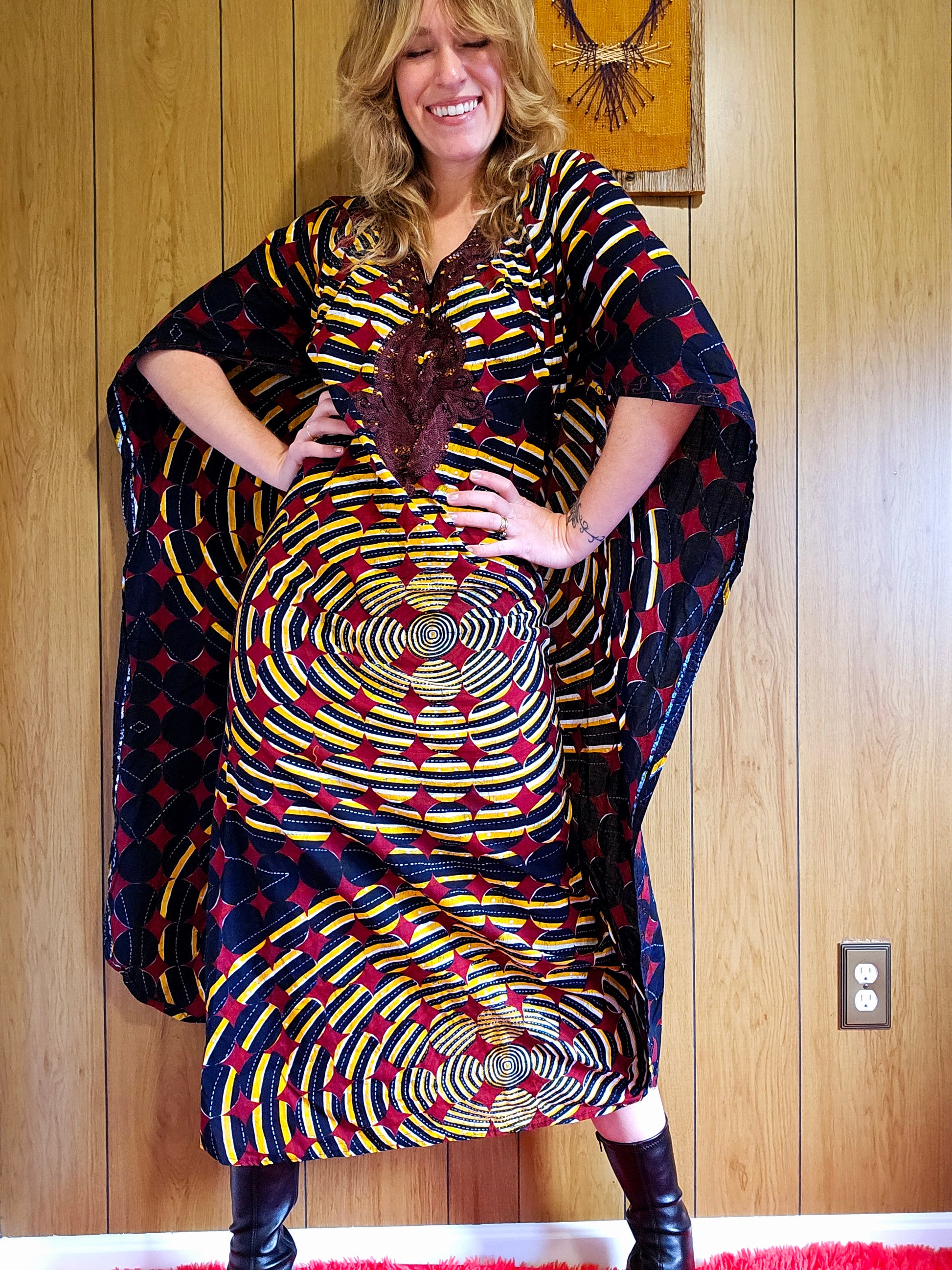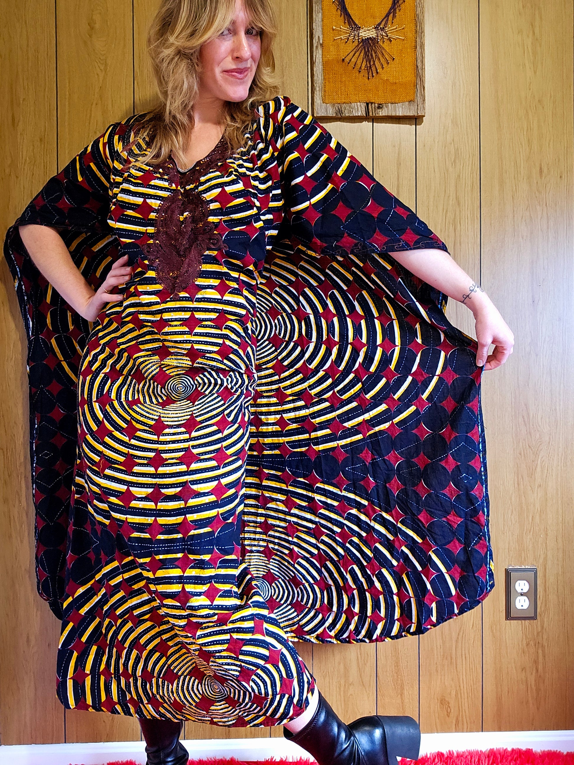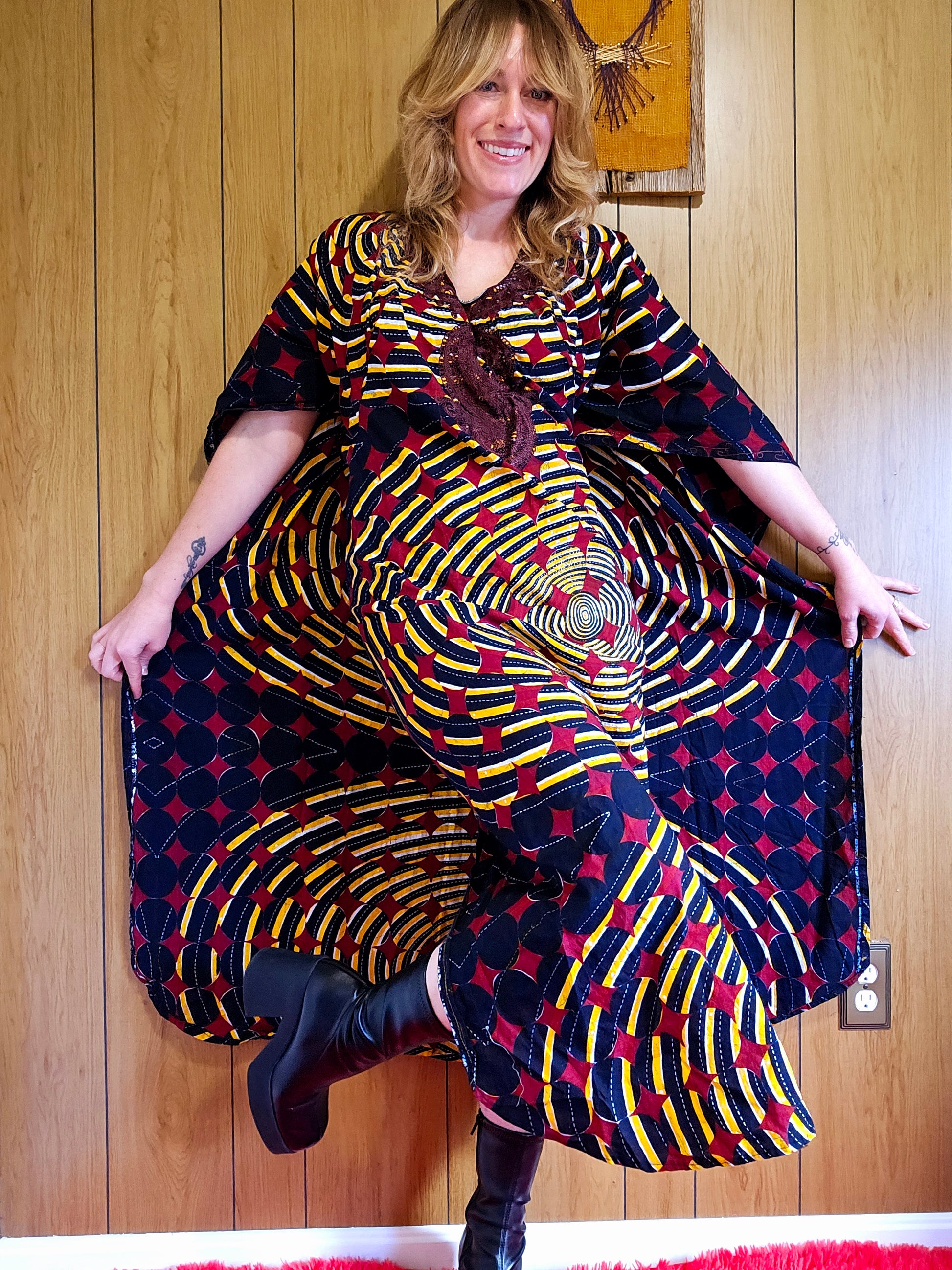 INCREDIBLE design! Elastic waist, difficult to measure but best fit small-medium based on my trying it on. 53" total length.