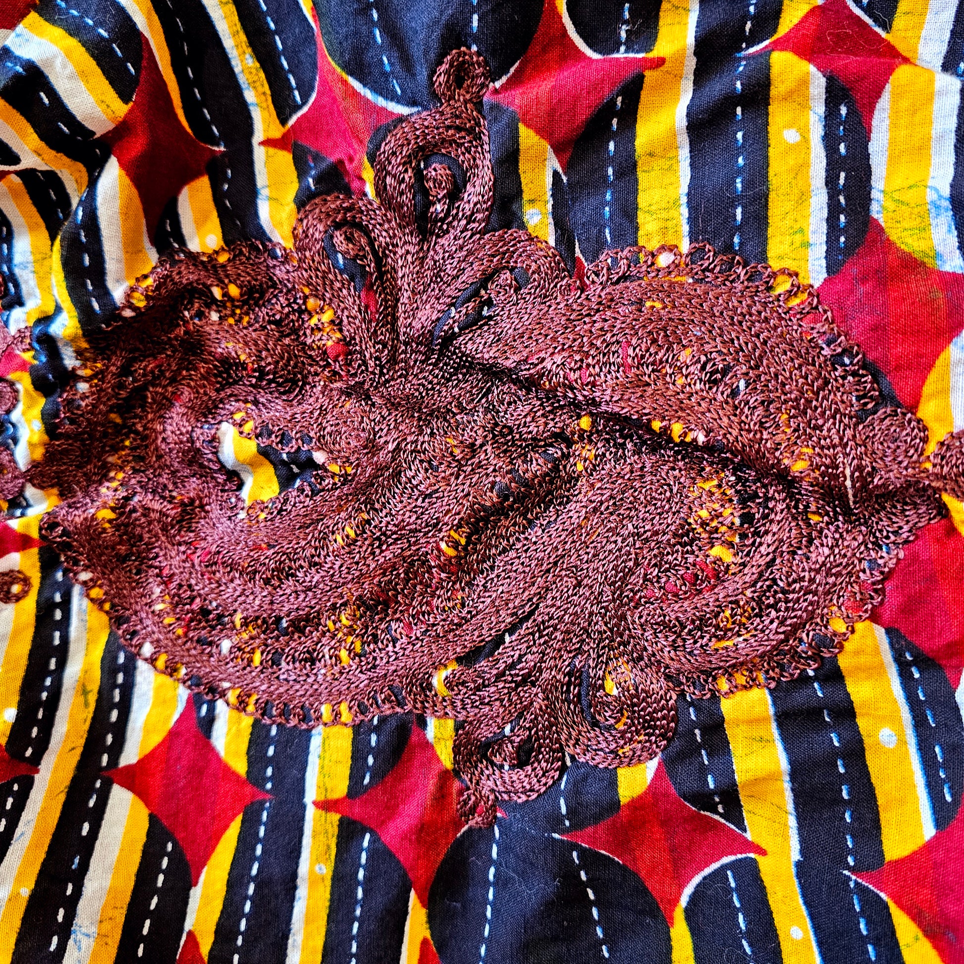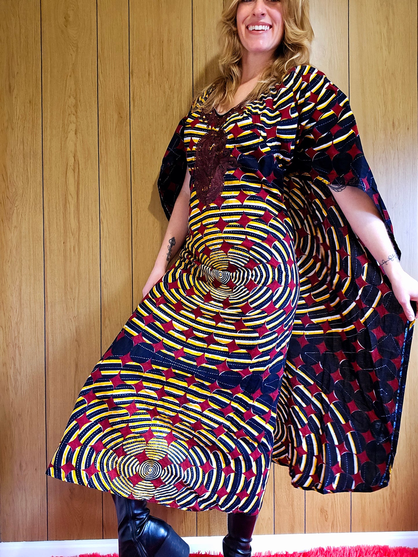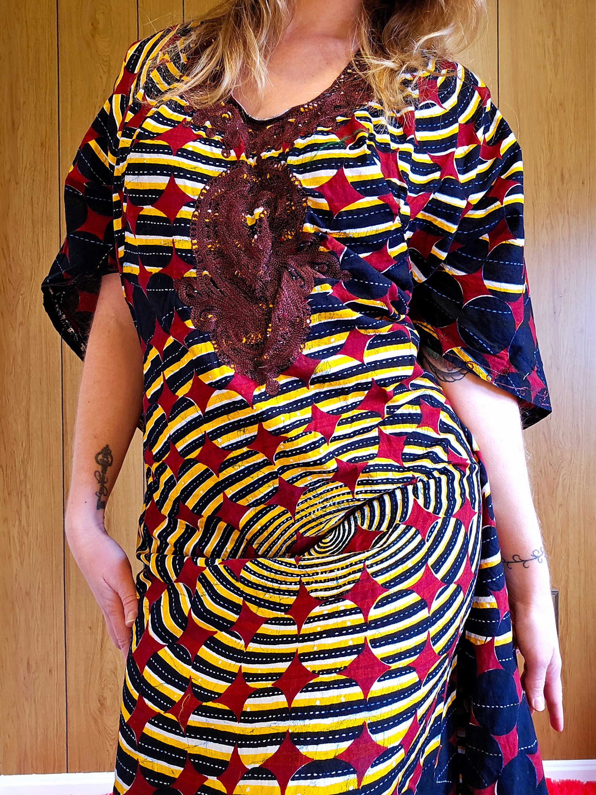 INCREDIBLE design! Elastic waist, difficult to measure but best fit small-medium based on my trying it on. 53" total length.