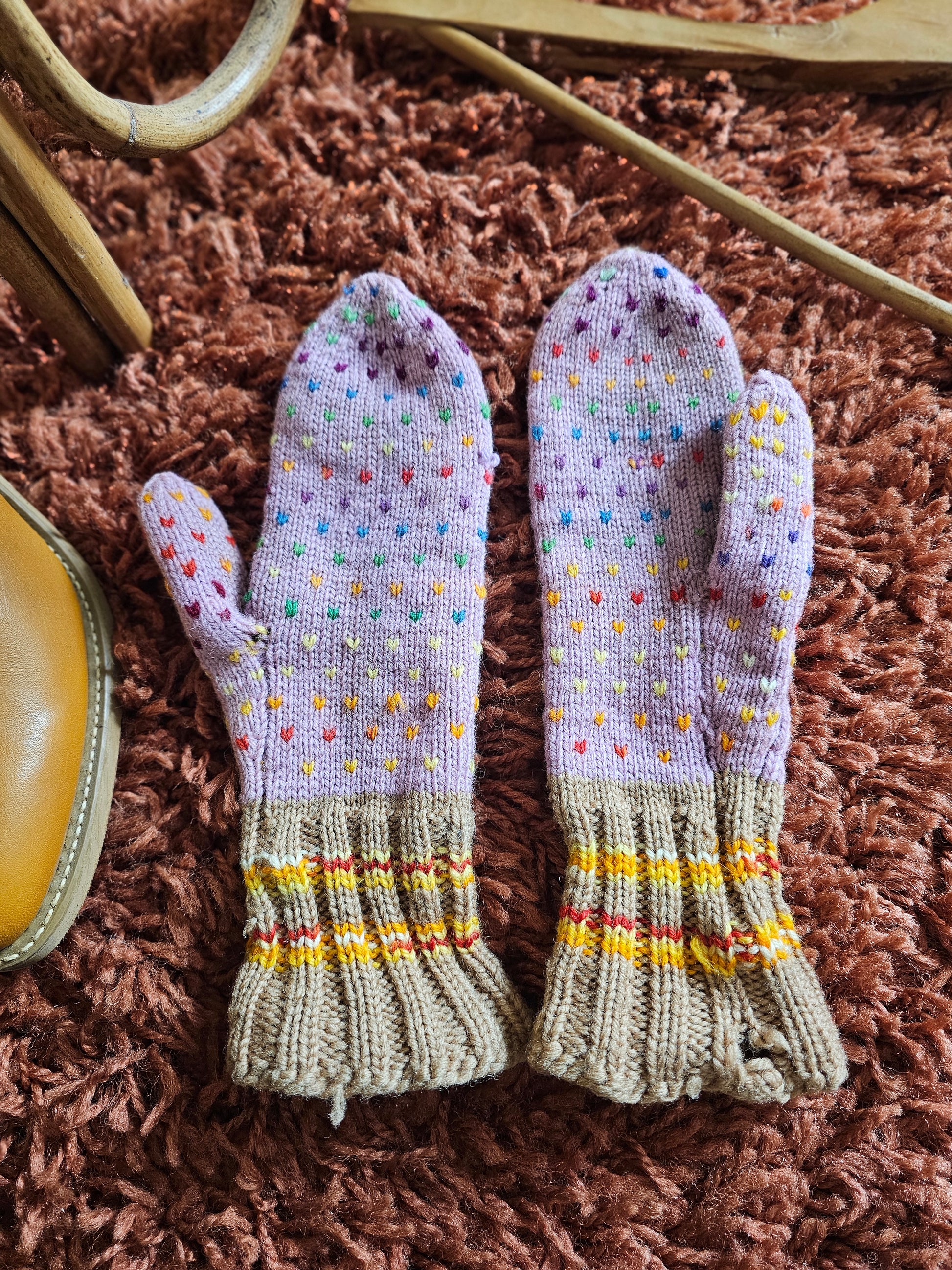 Light purple with colorful patterning! Knitted. 11" long total. Flaw shown in last picture.
