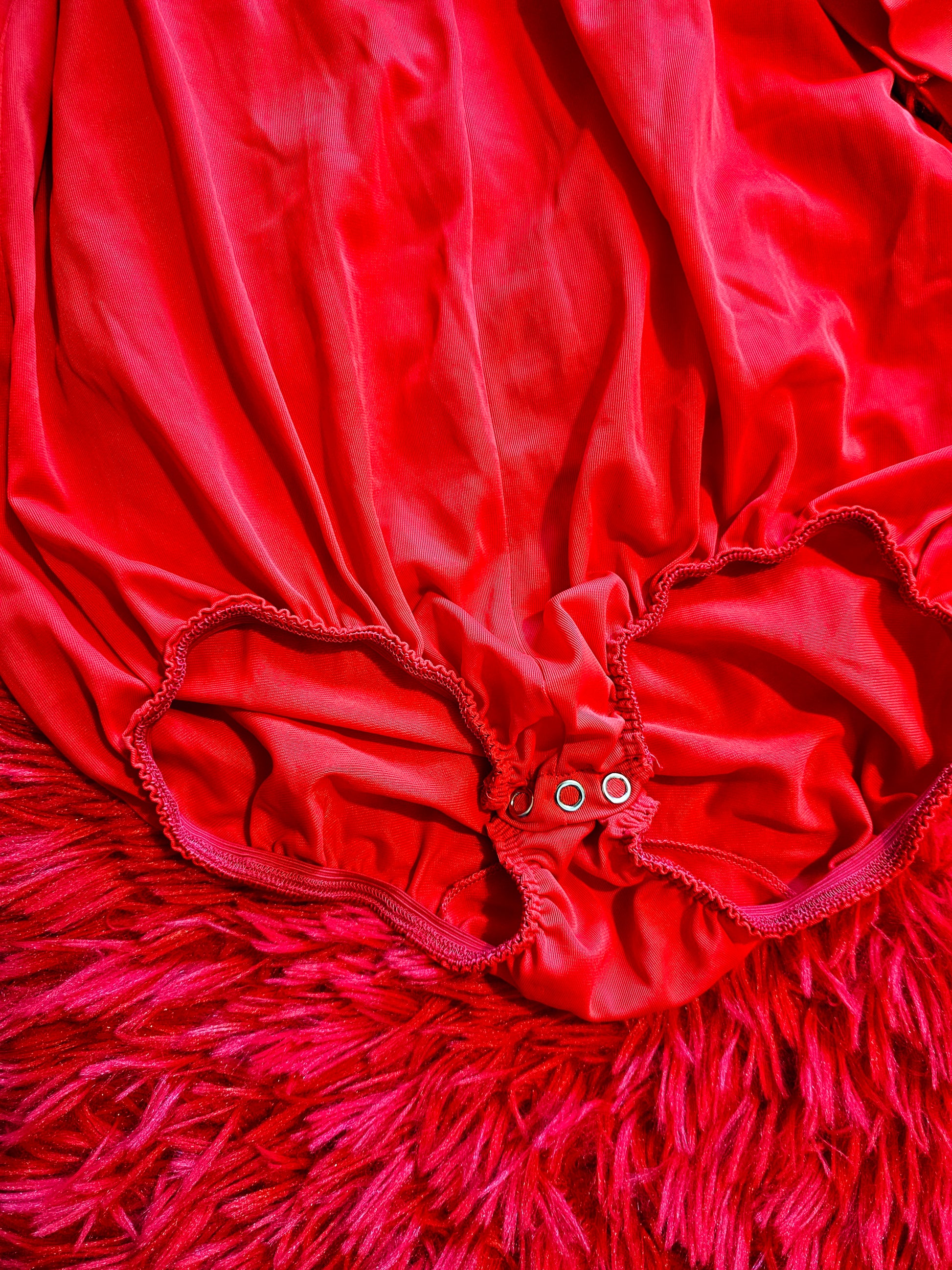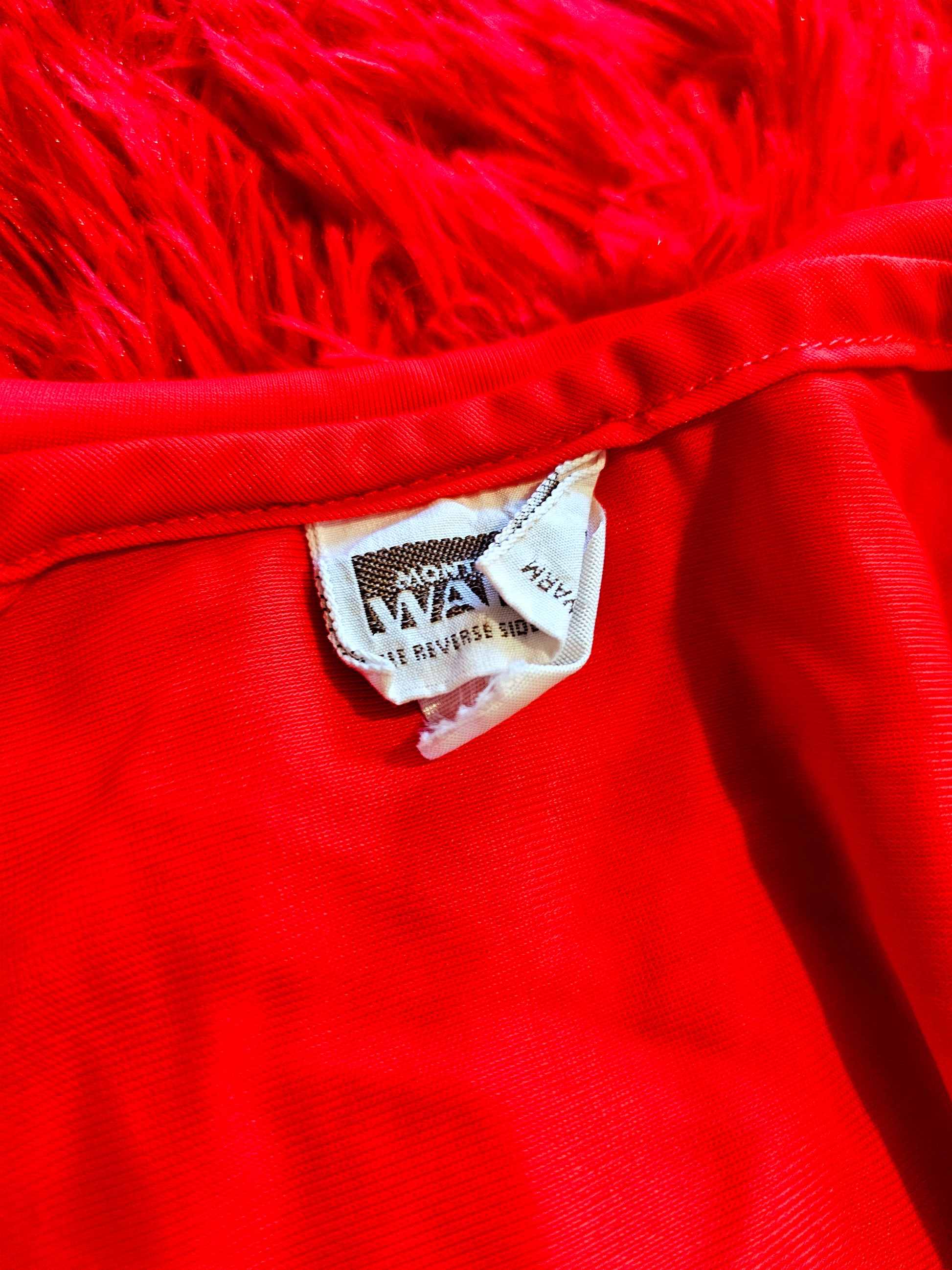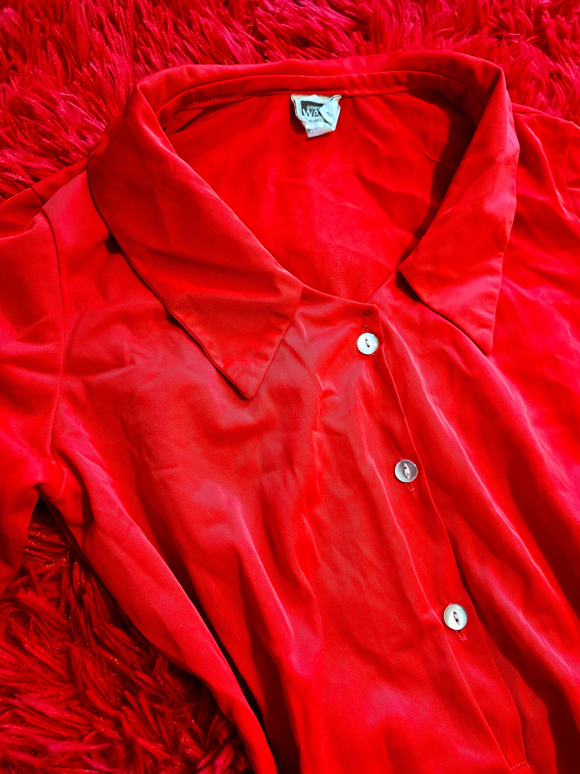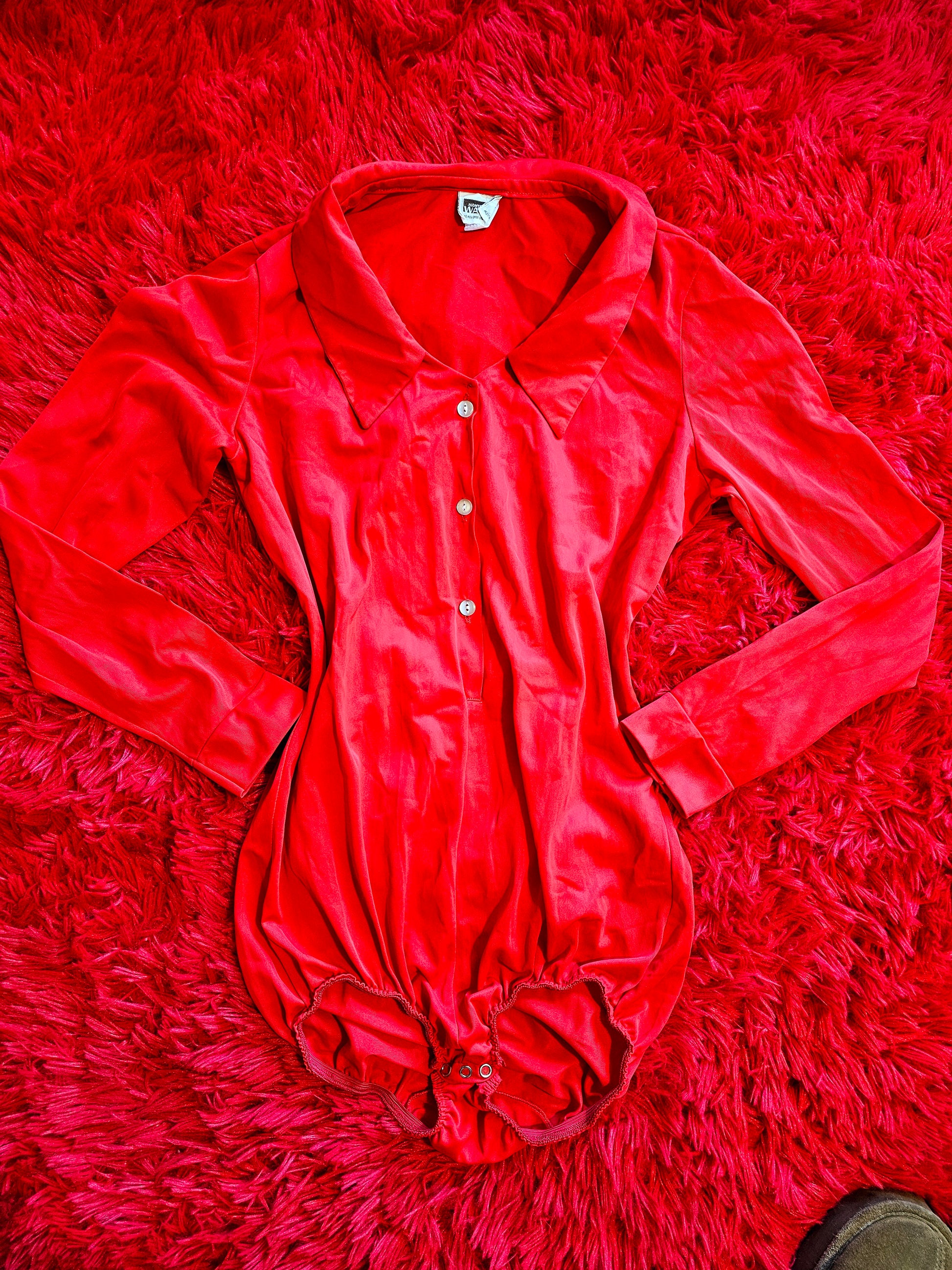 Beautiful red Montgomery Ward body suit top featuring collar, 3 buttons and button snap crotch. Modeled on a medium model. Best fit size small. Measurements below taken laid flat: Chest (armpit to armpit) 17", shoulders 13", Length shoulder to crotch 28"