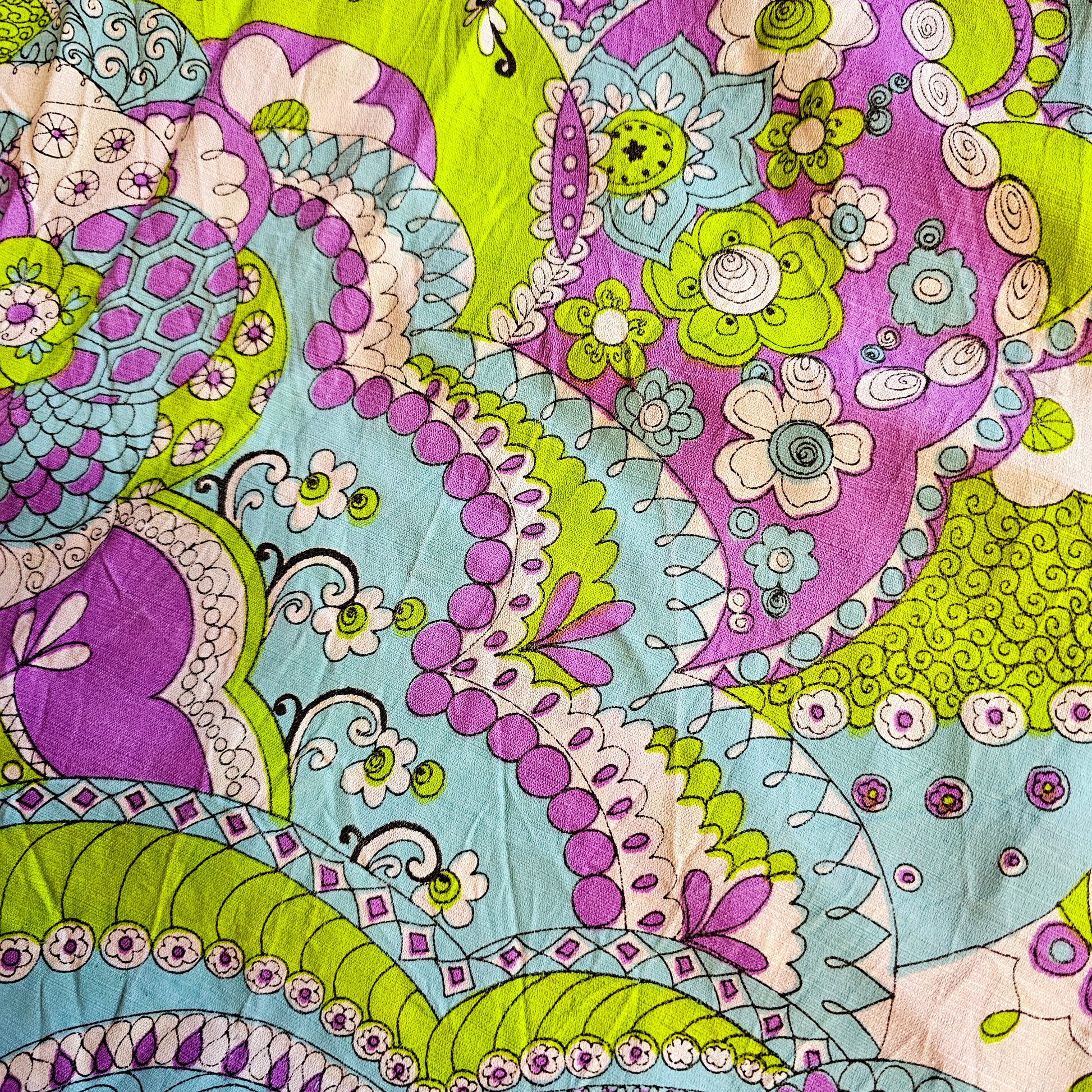 Handmade beauty! Bright fun colors of geometric paisley. Back zip. Shown here on a medium, estimated best fit L-XL. Measurements taken laid flat:
