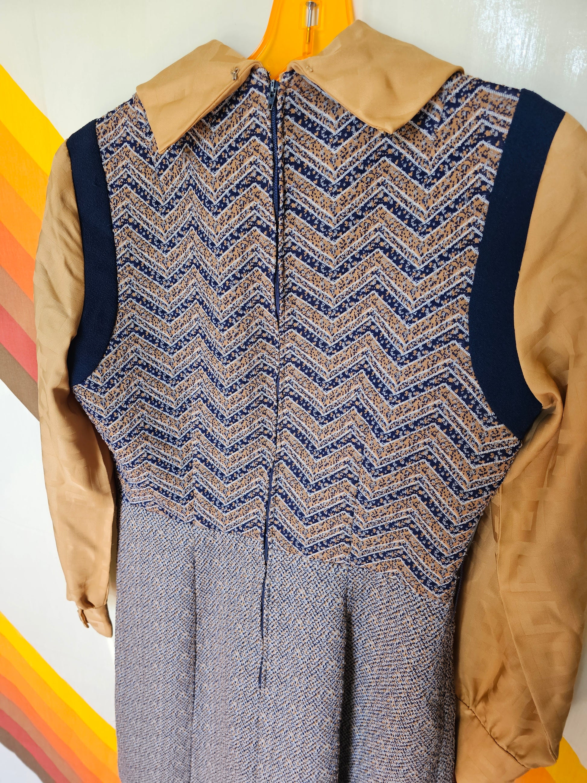 This one is too good! 60s/70s era. Pedestal Originals brand. Double knit with built in golden dagger collared shirt. No size tag remains, please refer to measurements below taken laid flat (not doubled):