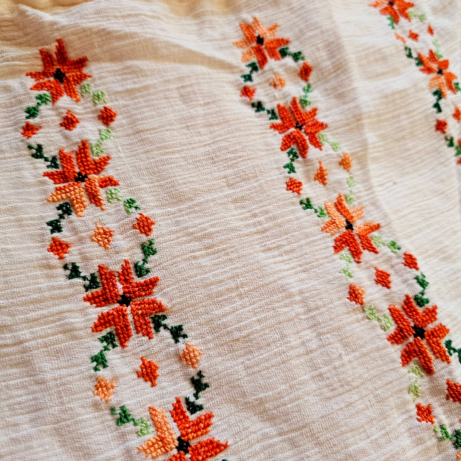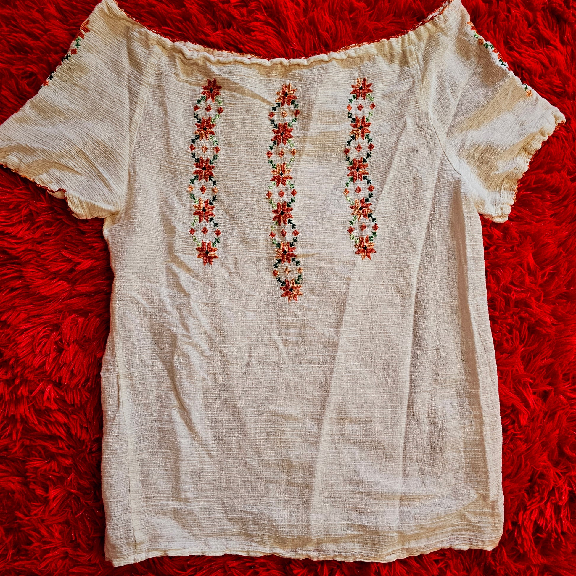 1960s beige gauzy top with embroidered orange and green tone florals! This came from Greece! Measurements below taken laid flat, please double where applicable: