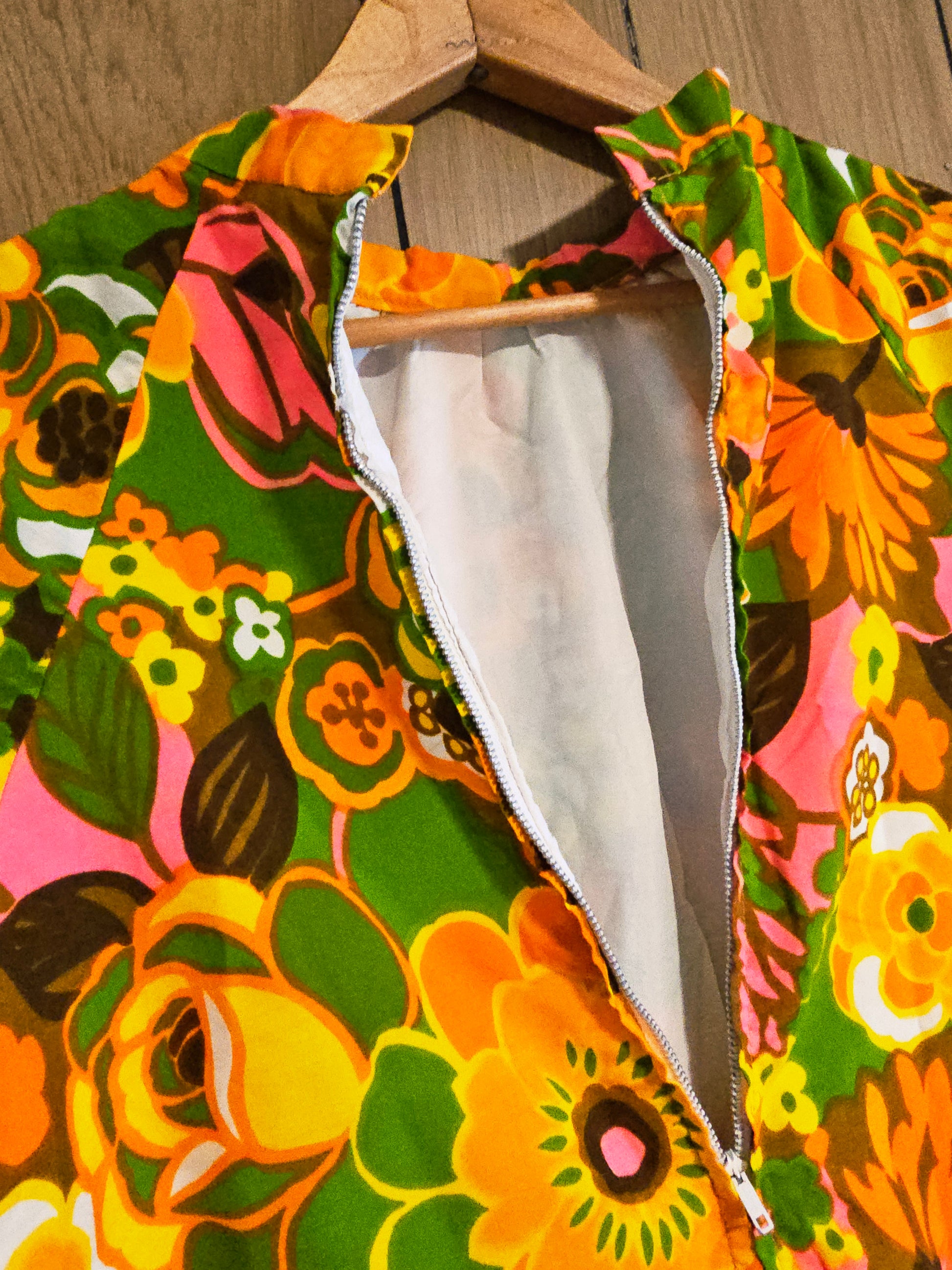 This COLORWAY! Truly groovy shift dress. Fits best like a medium in my opinion. Measurements below taken laid flat, so please double where applicable. I beleive this dress is hand made. It appears that the bottom may have been hemmed shorter at a later time. The inner lining layer is prone to being wrinkly but is thin and doesnt impact wear or appearance. Zipper fully functional. One small stain--barely discernable with this busy pattern (last pic).Chest (armpit to armpit)18" • Shoulders 16" • Waist 17"• Length 36"