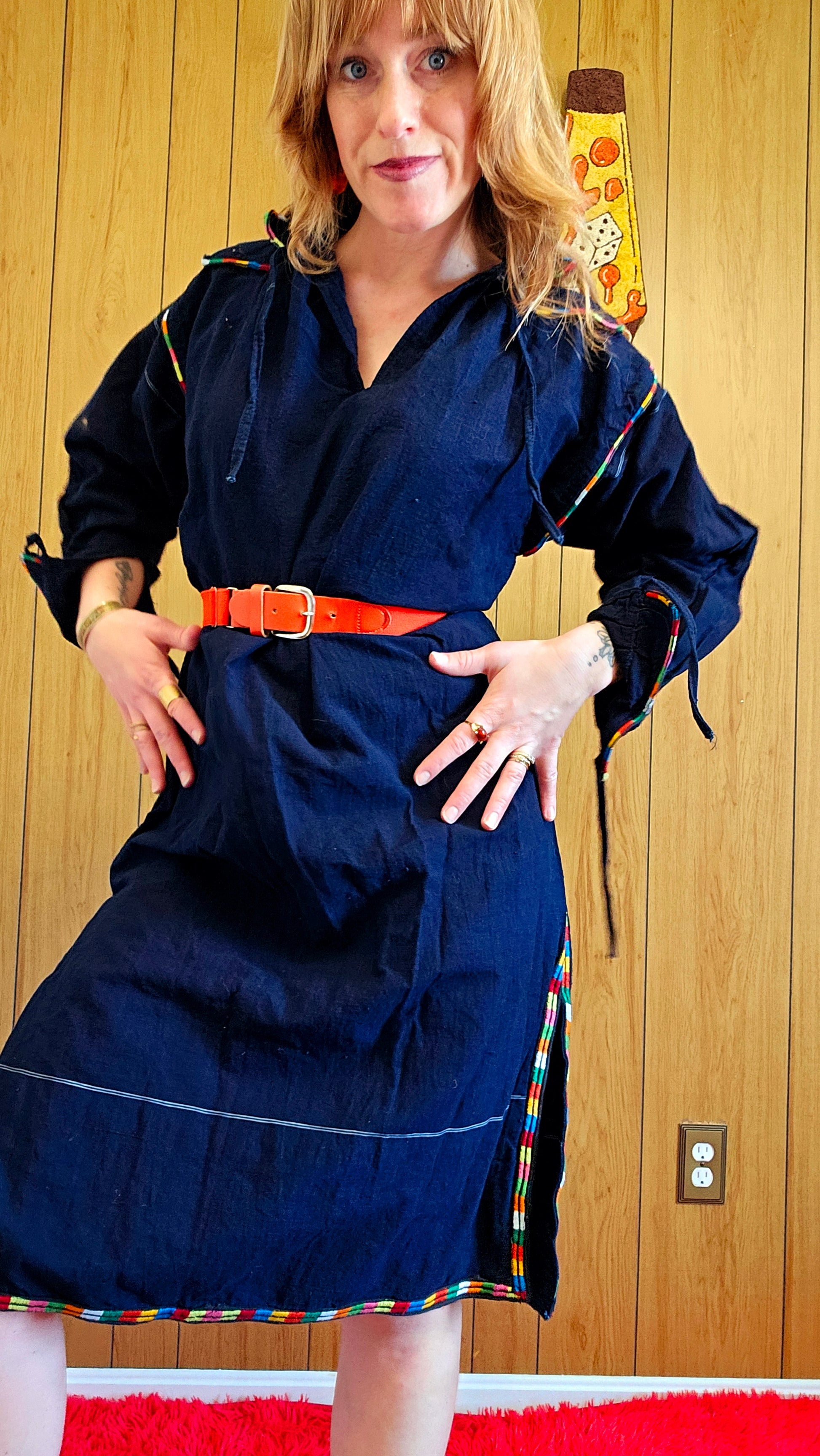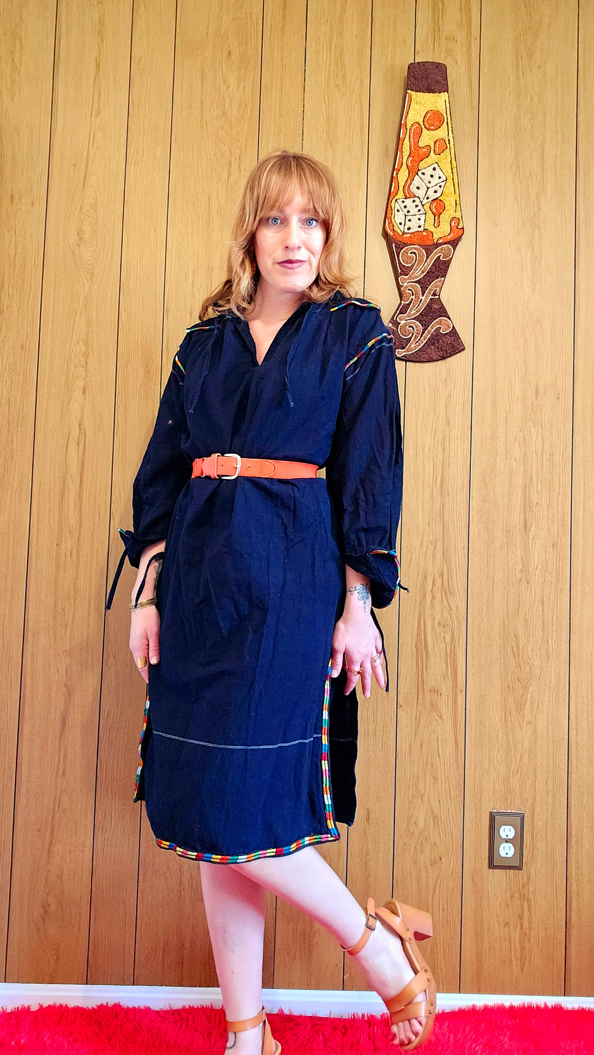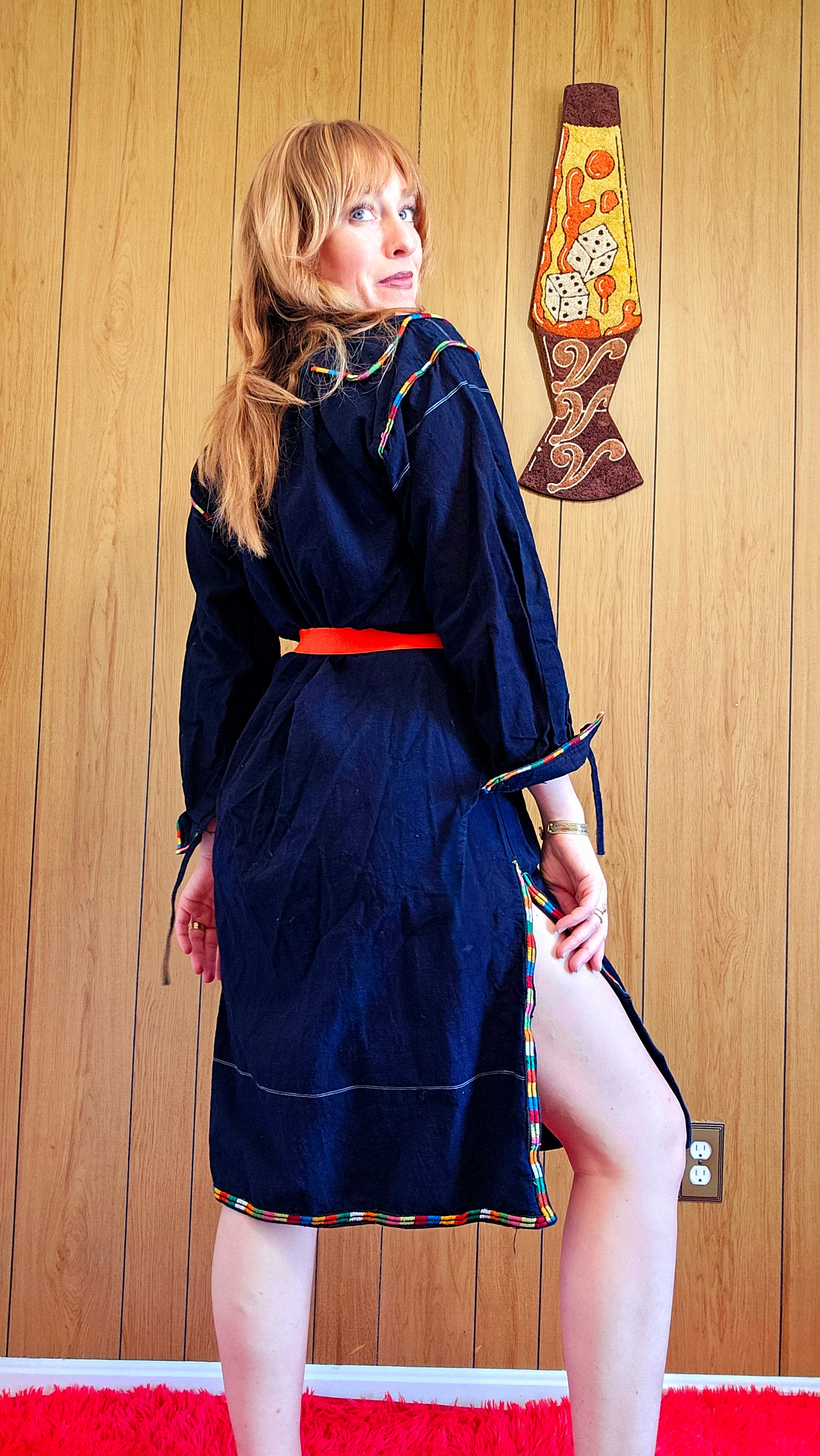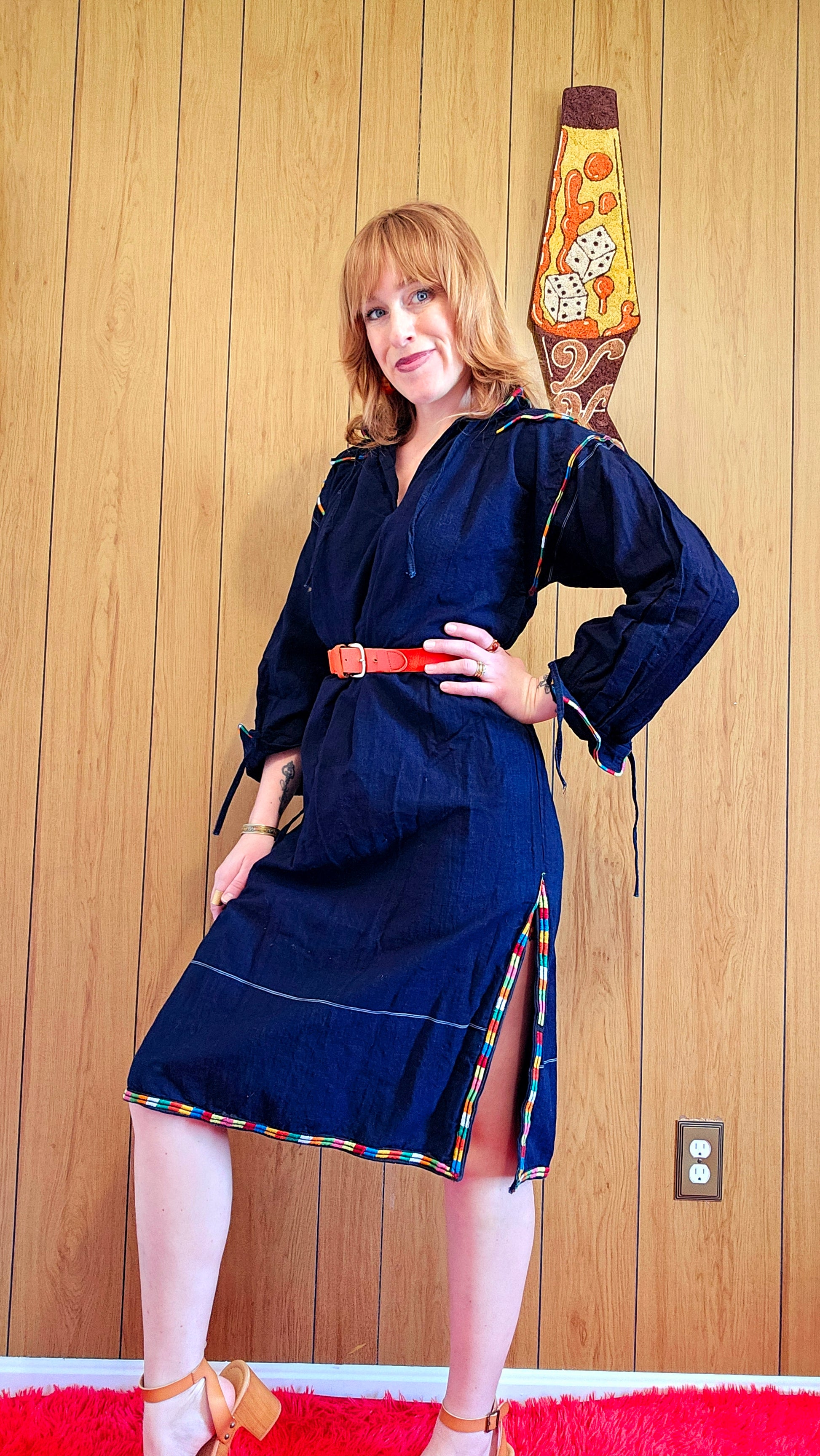 1960s navy blue dress with rainbow embroidery. Love these high thigh slits! Beautiful thicker weight cotton, like a thick linen or lightweight. Belt not included. Best fit M-L depending on desired fit. Modeled on a medium for reference in these pictures. Measurements taken laid flat, please double where applicable.