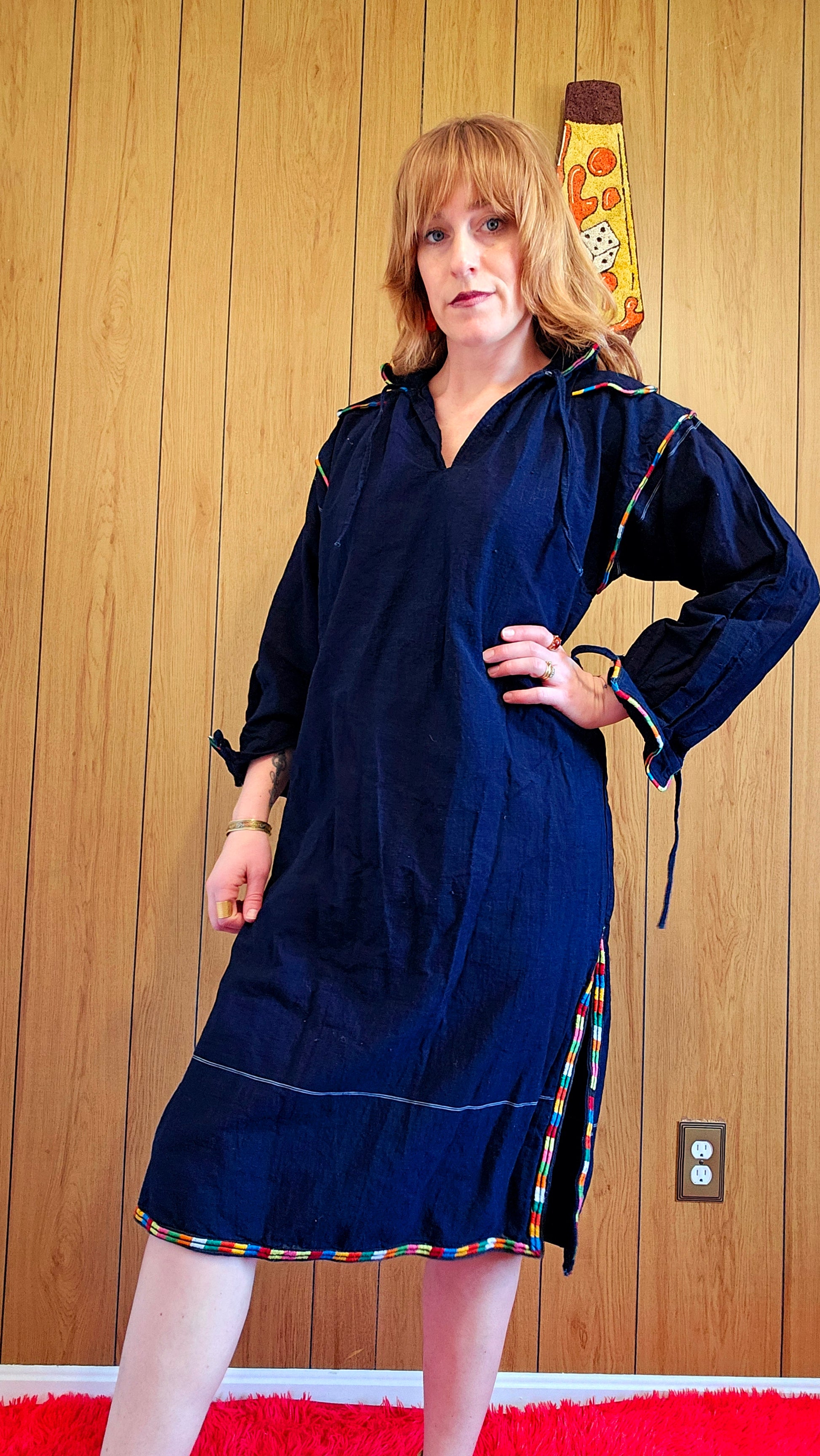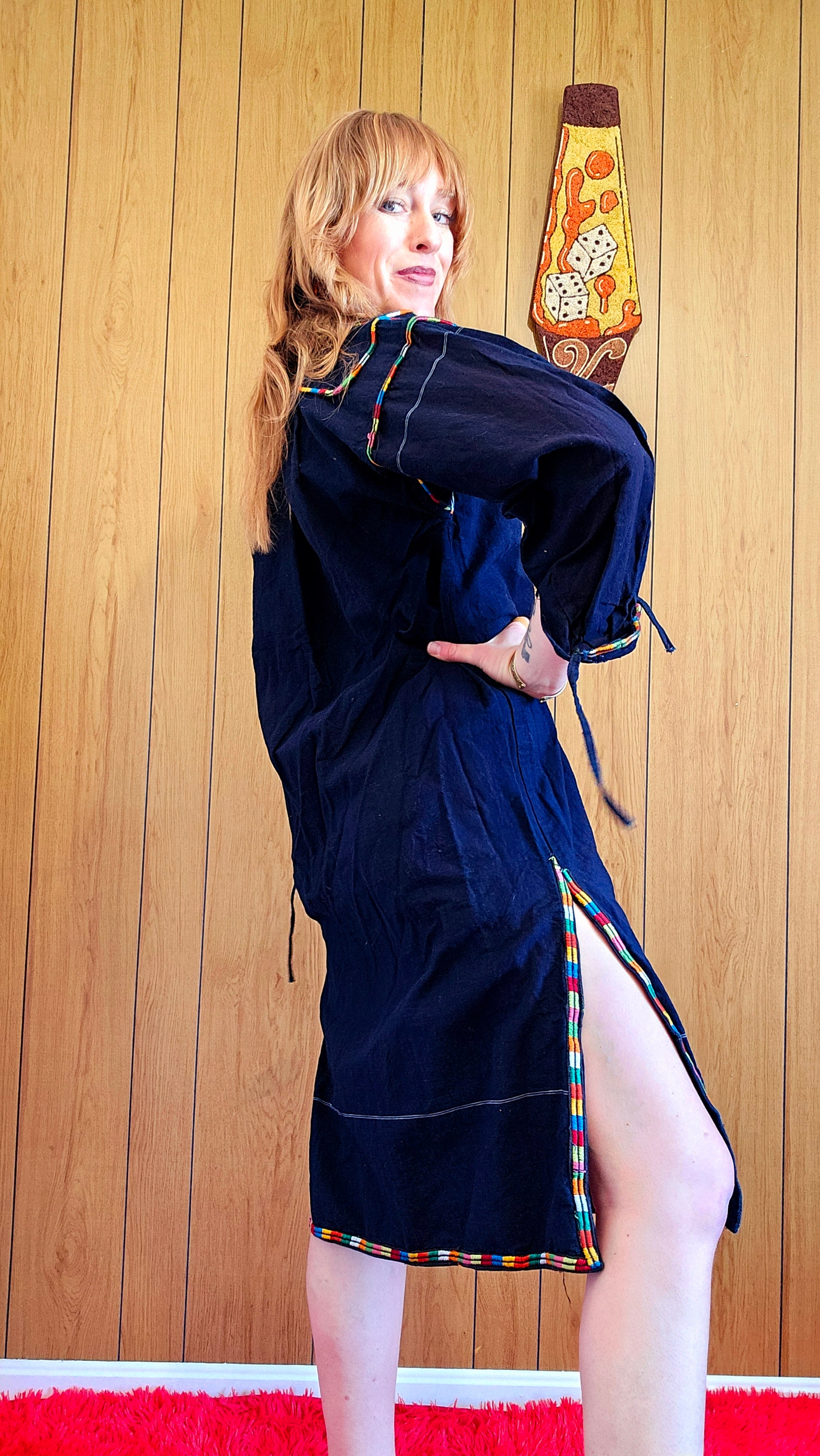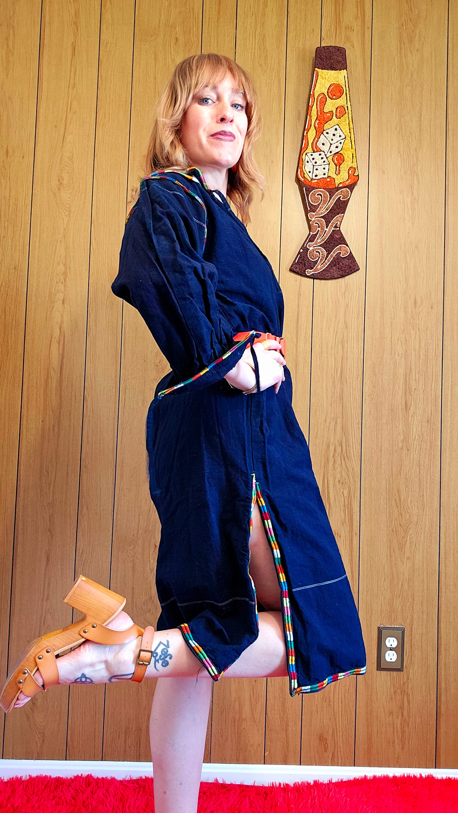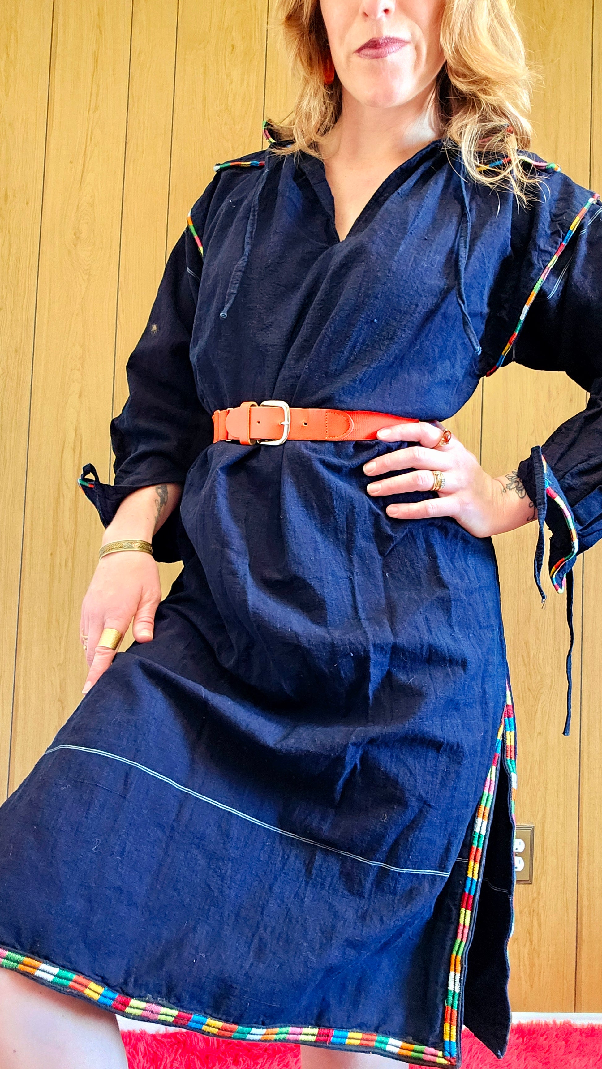 1960s navy blue dress with rainbow embroidery. Love these high thigh slits! Beautiful thicker weight cotton, like a thick linen or lightweight. Belt not included. Best fit M-L depending on desired fit. Modeled on a medium for reference in these pictures. Measurements taken laid flat, please double where applicable.