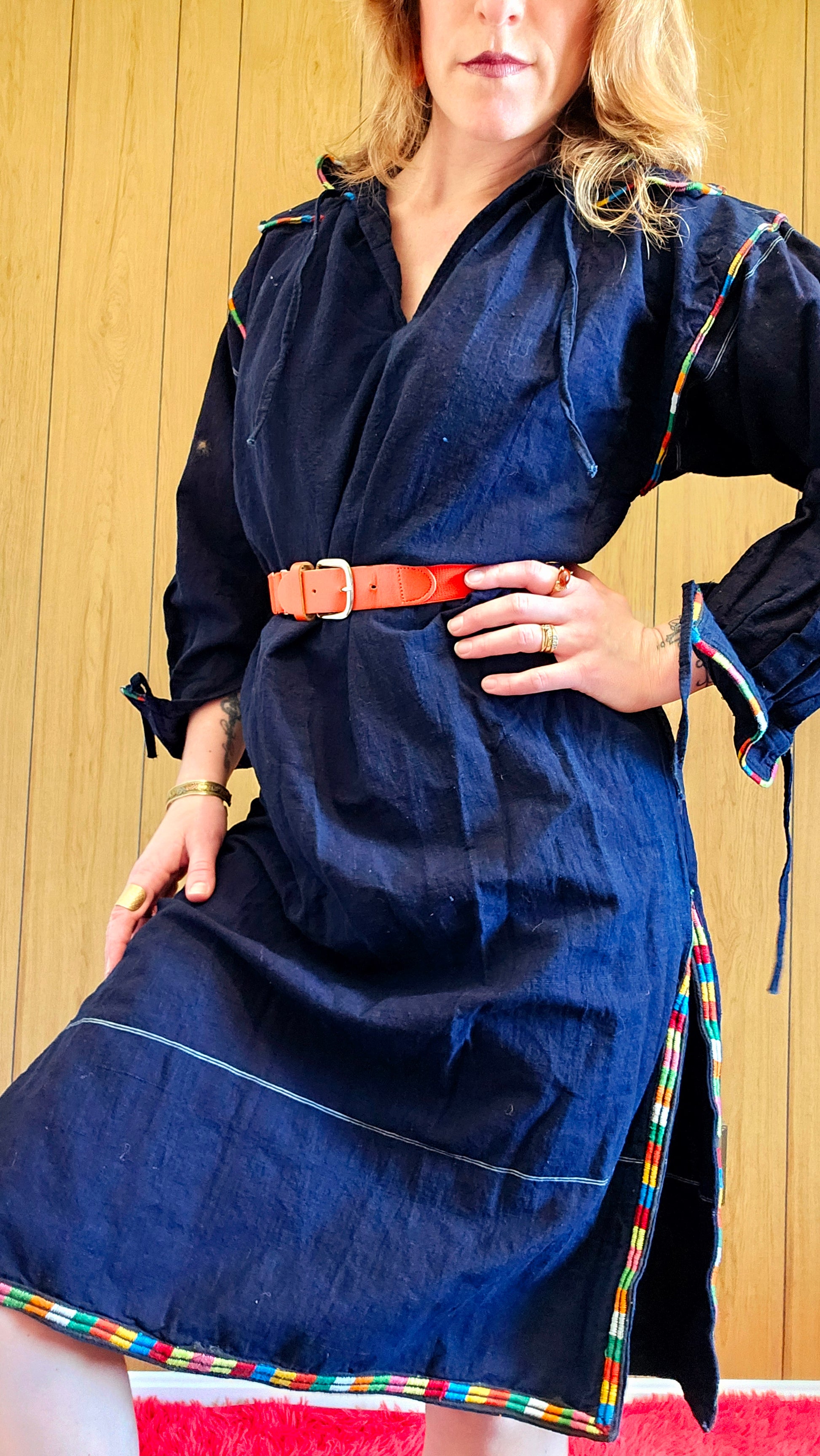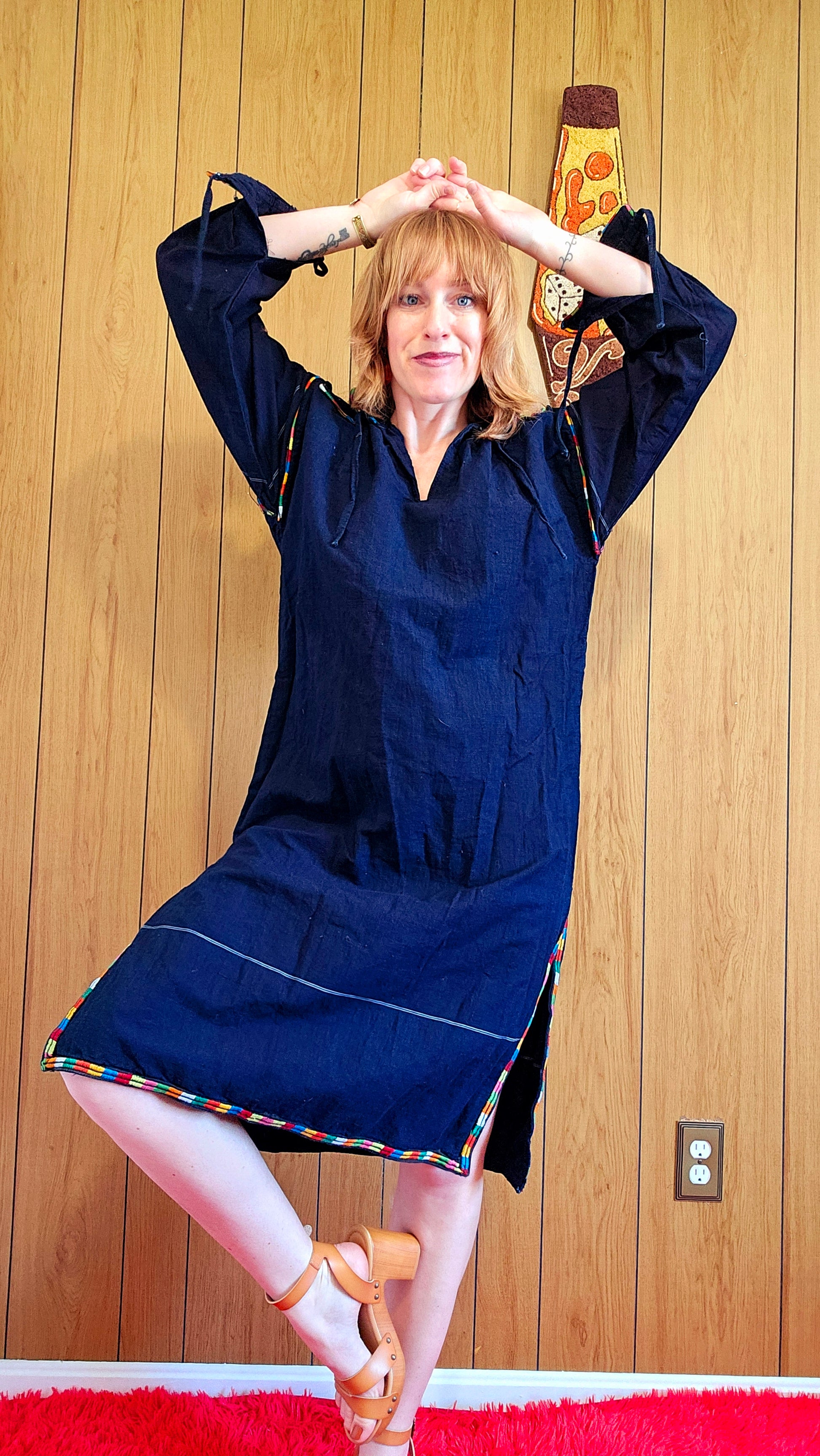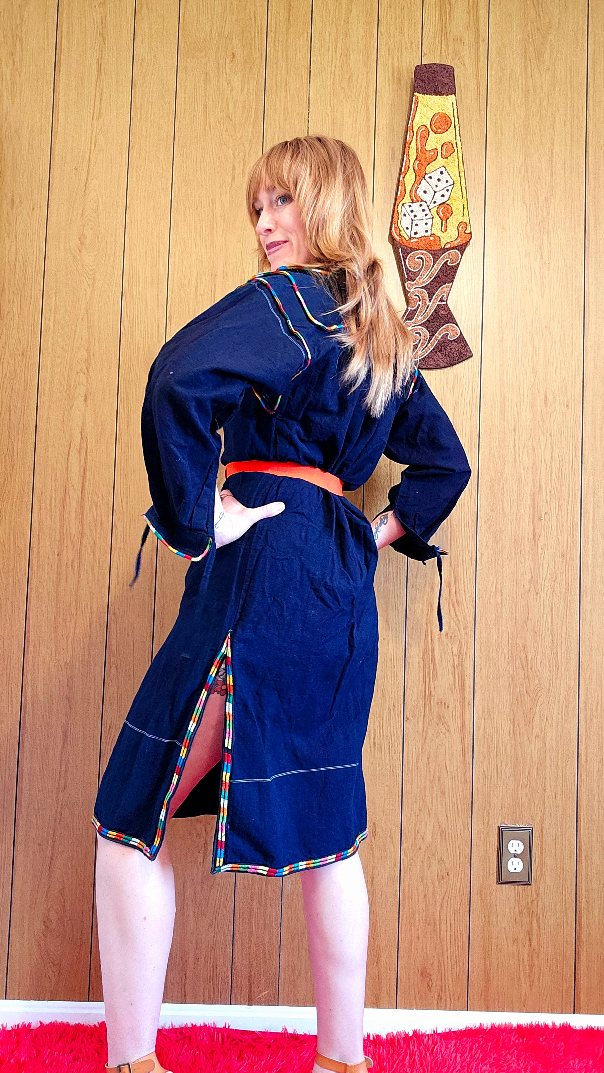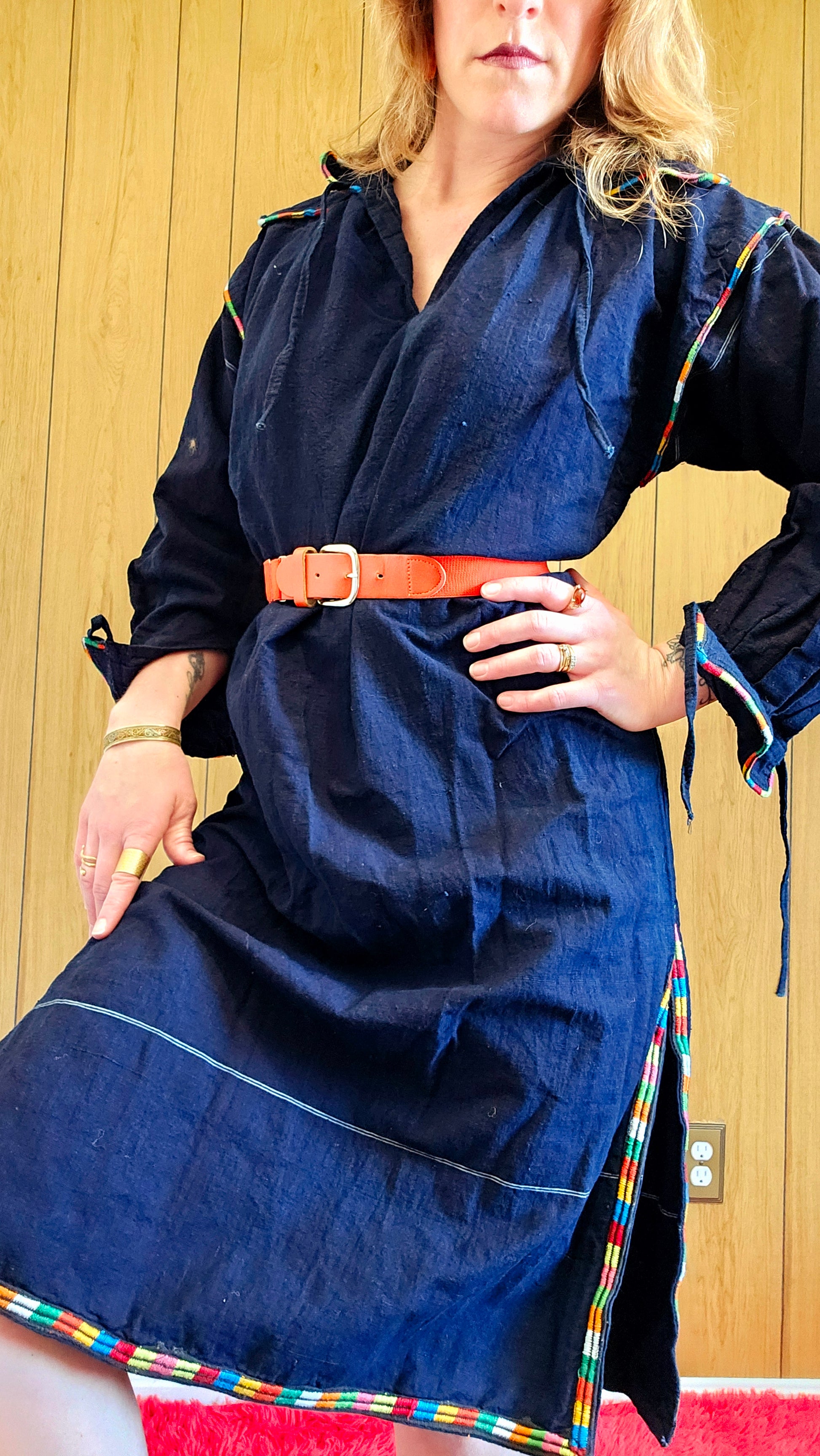 1960s navy blue dress with rainbow embroidery. Love these high thigh slits! Beautiful thicker weight cotton, like a thick linen or lightweight. Belt not included. Best fit M-L depending on desired fit. Modeled on a medium for reference in these pictures. Measurements taken laid flat, please double where applicable.