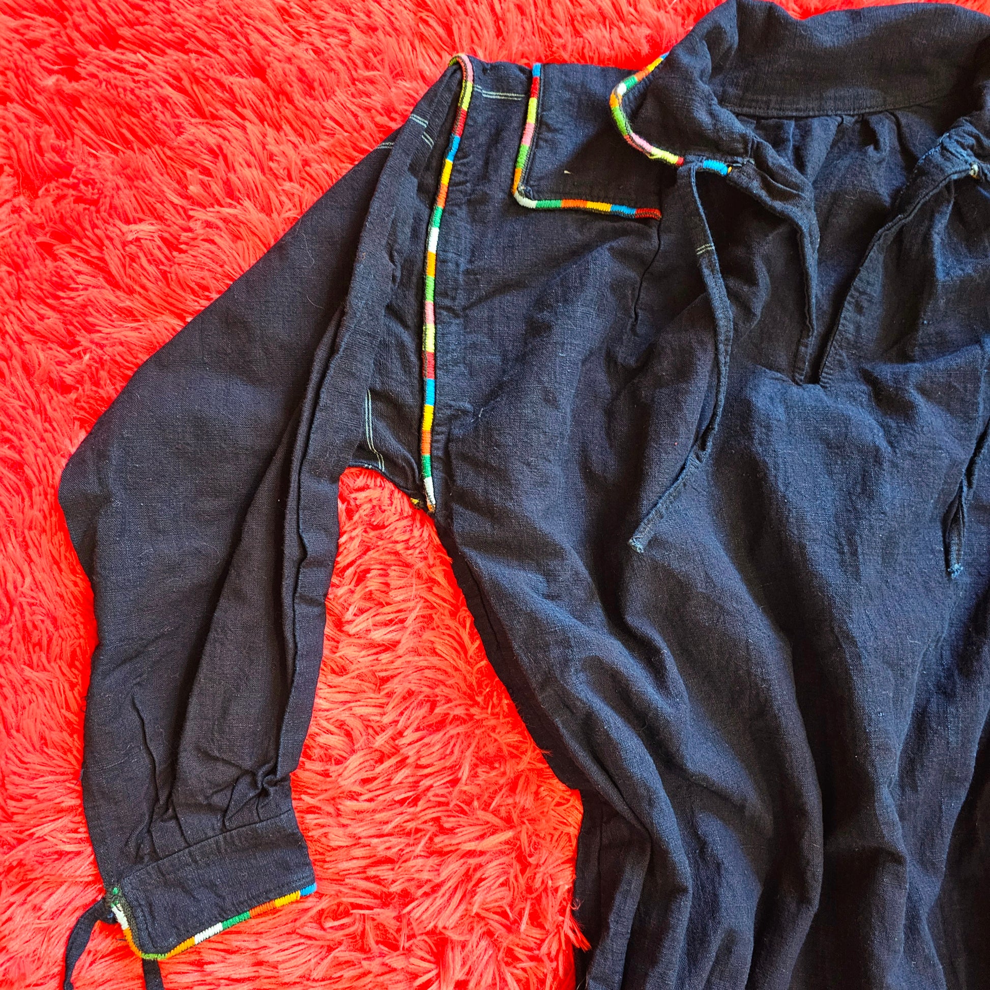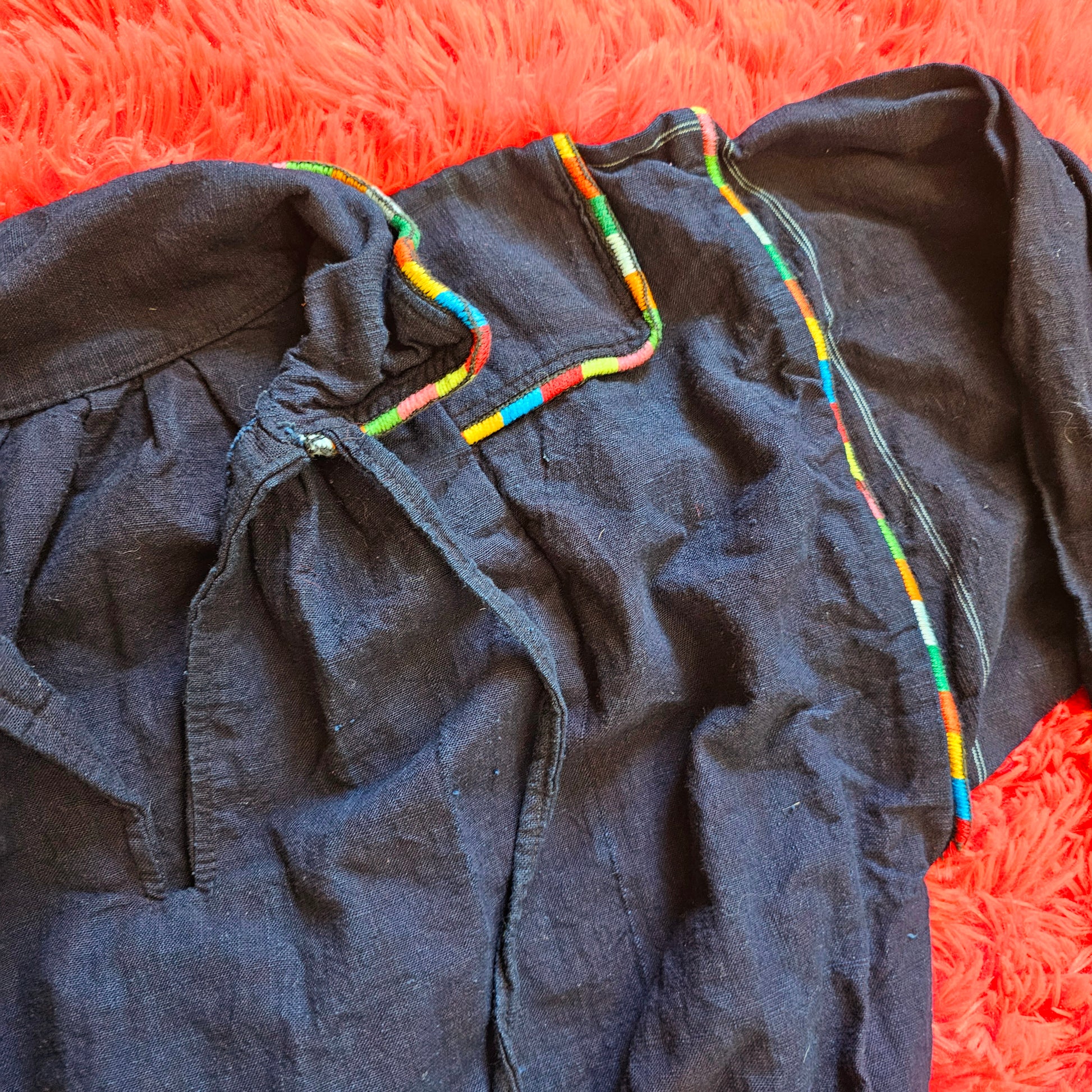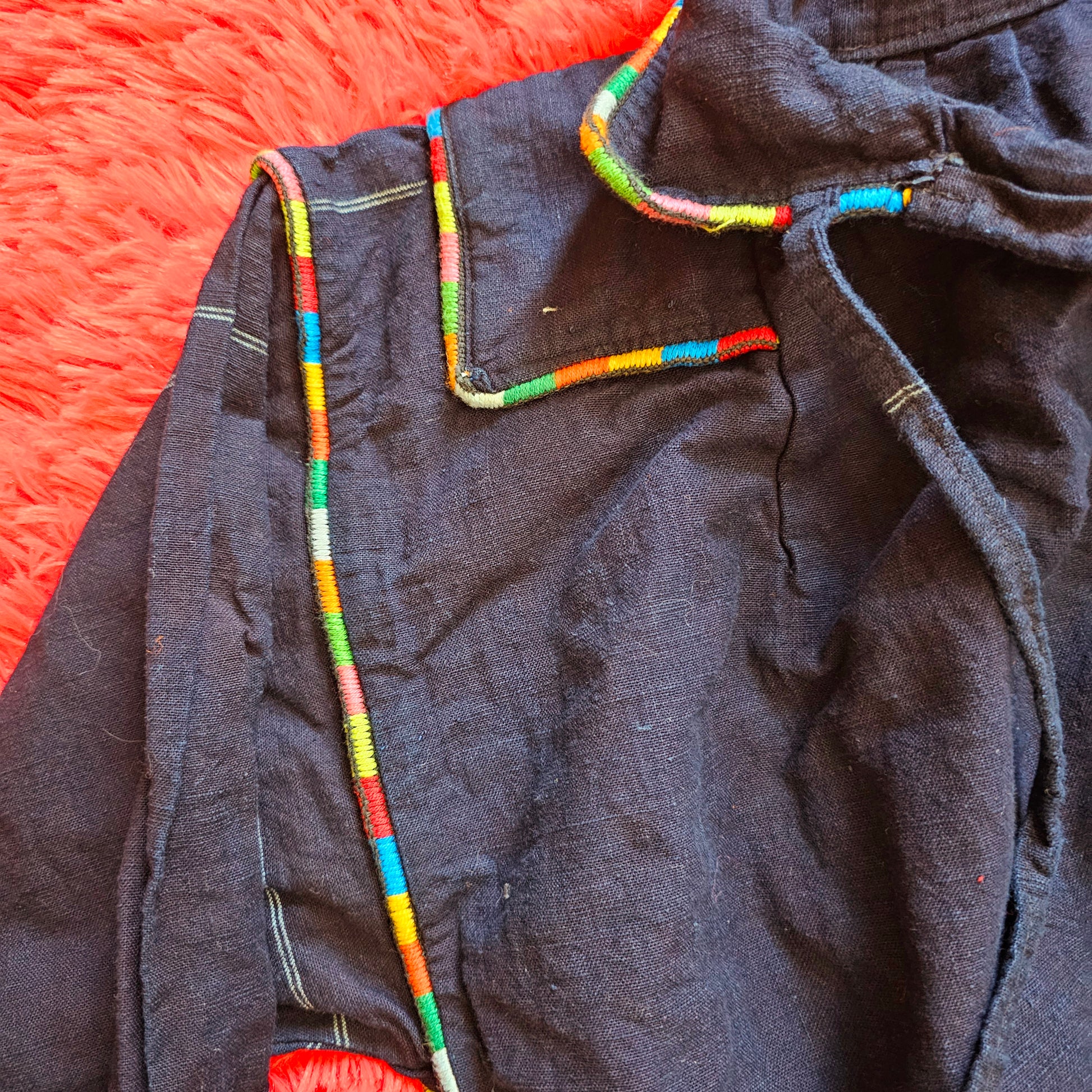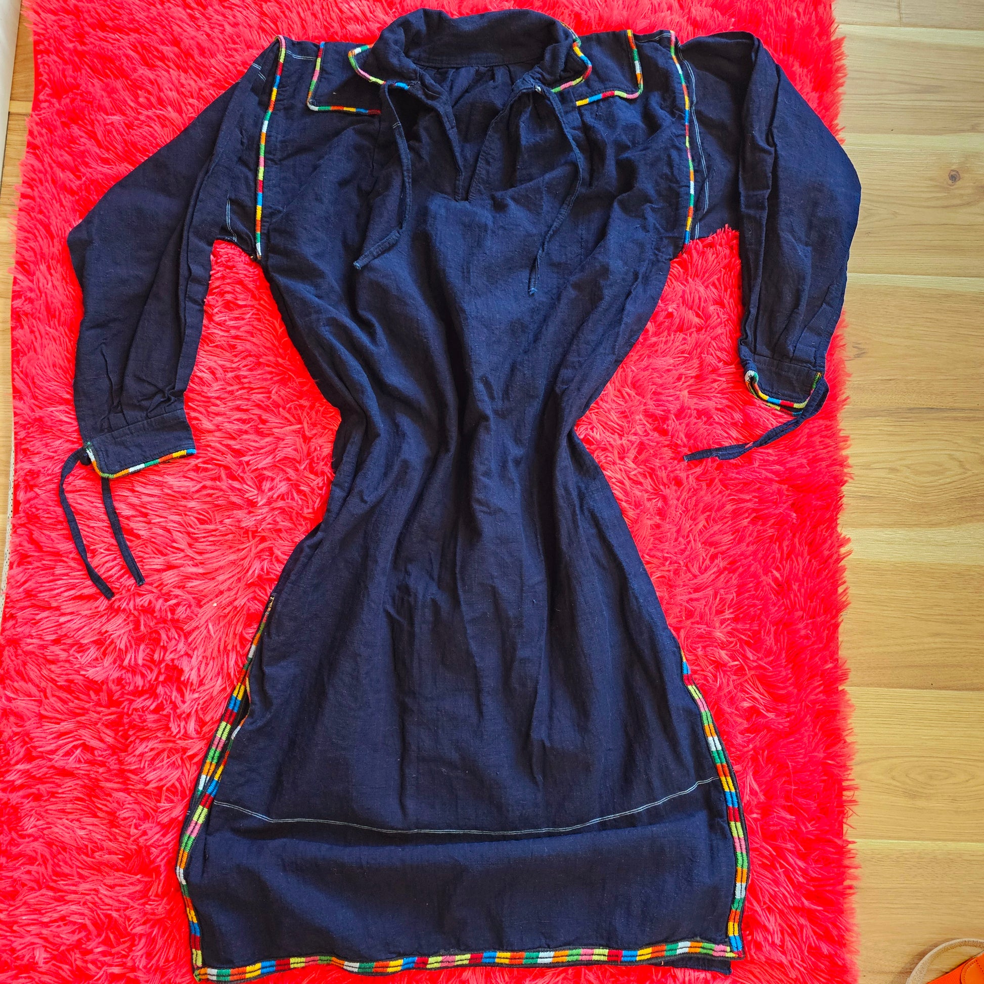 1960s navy blue dress with rainbow embroidery. Love these high thigh slits! Beautiful thicker weight cotton, like a thick linen or lightweight. Belt not included. Best fit M-L depending on desired fit. Modeled on a medium for reference in these pictures. Measurements taken laid flat, please double where applicable.