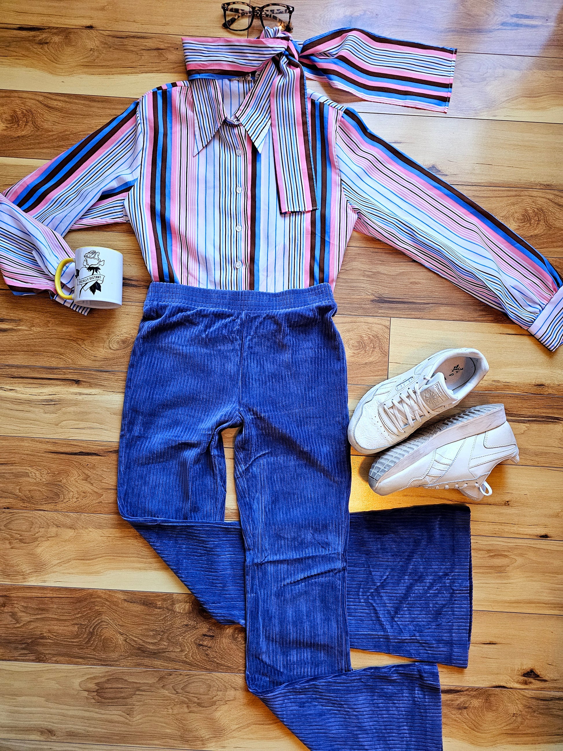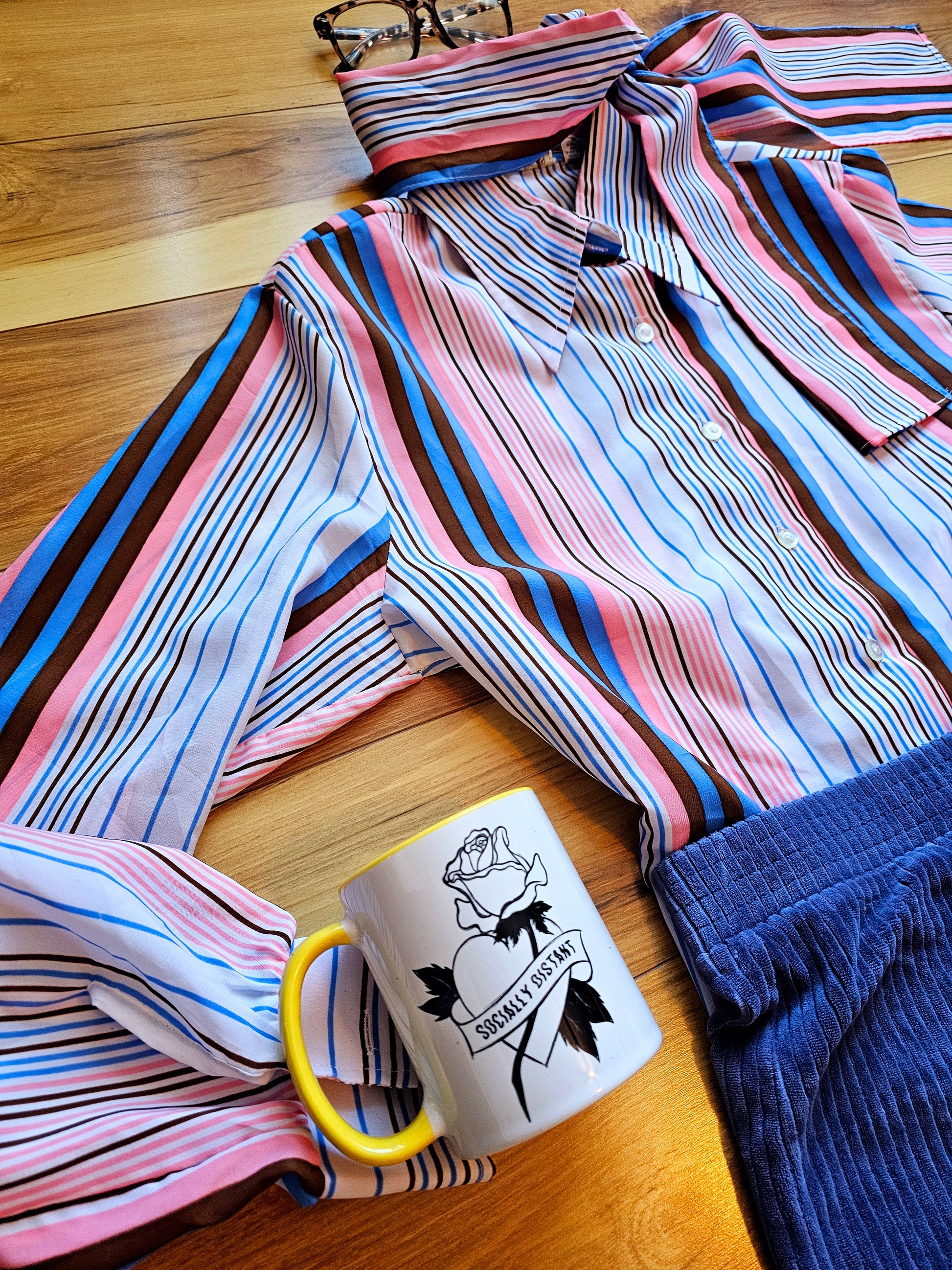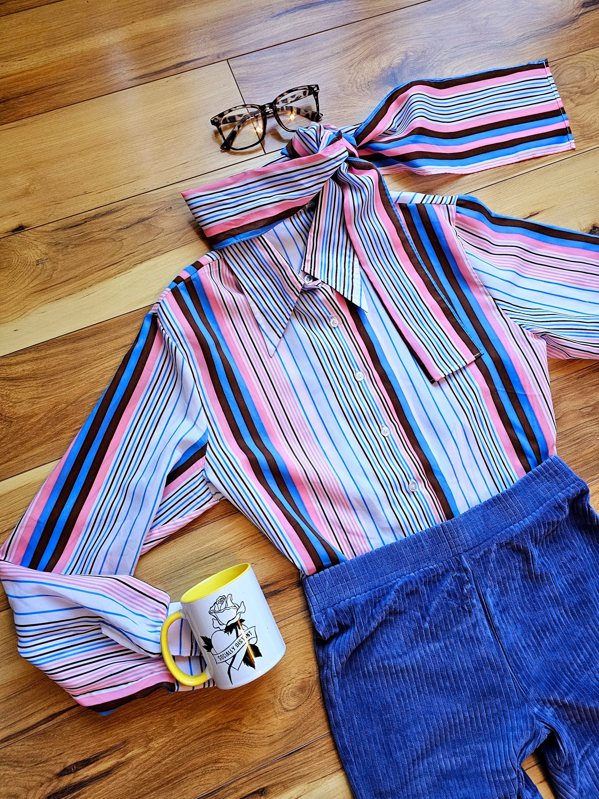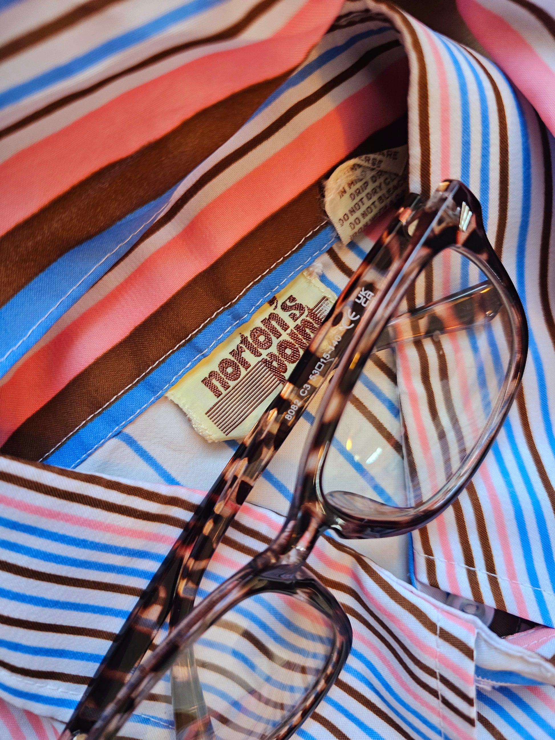 1960s pink, white, blue and brown button down top by Norton Point, with optional neck tie/sash. Labeled size large, fits like a M/L. Measurements below taken laid flat: