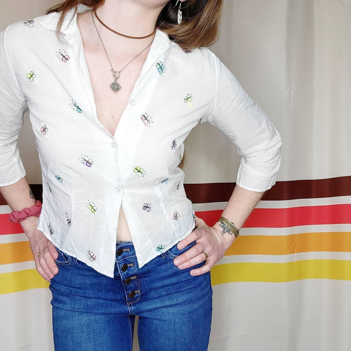 ULTIMATE spring vibes with this 1960's butterfly Rojay top in impeccable condition 🦋 Pastel colored stitched/embroidered butterflies. No size tag, but fits like a Small. No, it's not missing a bottom button, that's the design 😁
