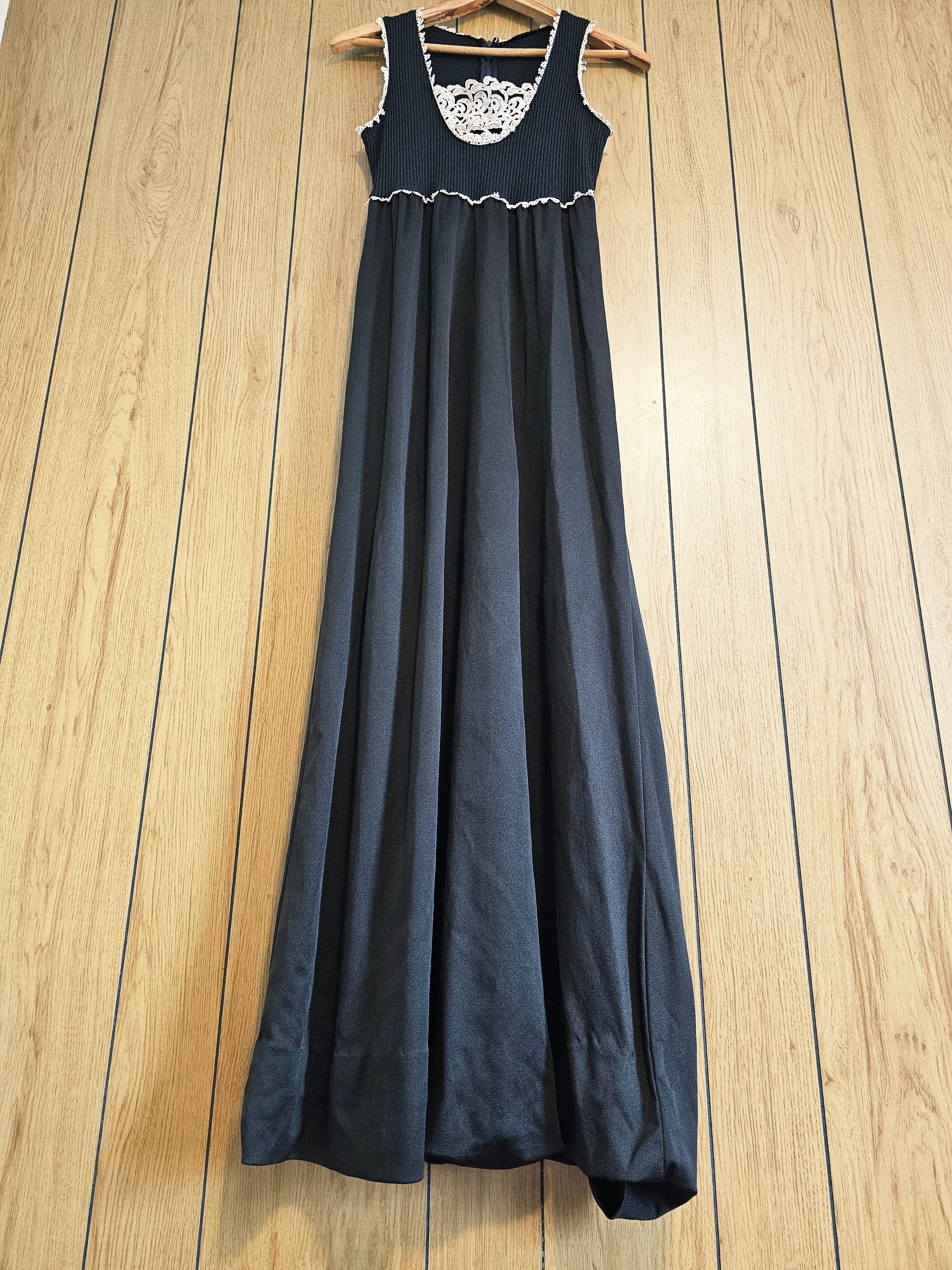 This beautiful 60s/70s romantic bohemian dress features a black ribbed knit bodice (stretchy!) trimmed in cream lace giving it almost a lingerie-inspired feel. Empire waist and ribbed bodice. Effortless, feminine, and versatile—perfect styled alone, layered with a cardigan or shawl, or worn with boots for a classic 70s look! Measurements below taken laid flat: Chest 26"- 34" • empire waist 26"-30" • length 52"