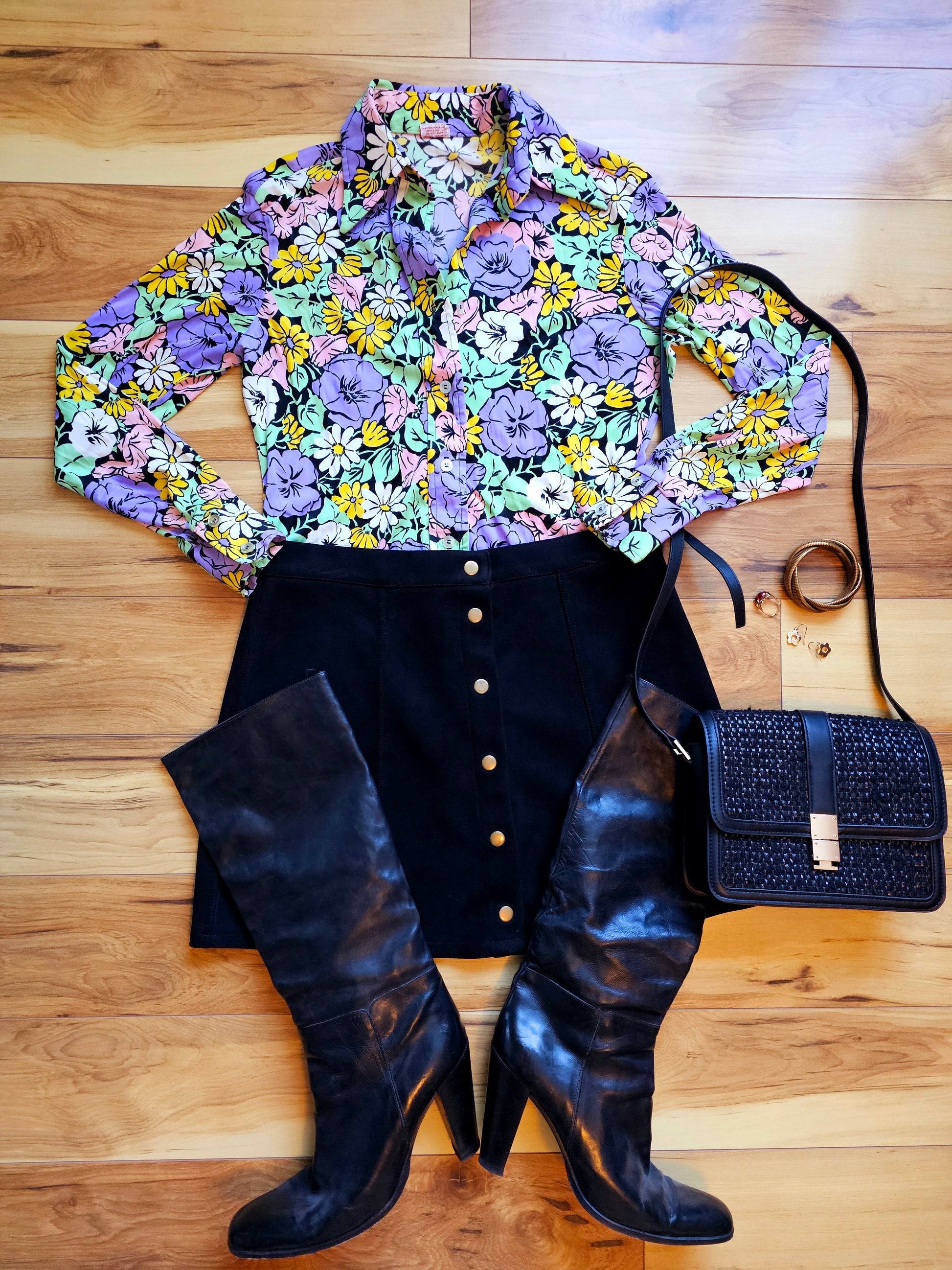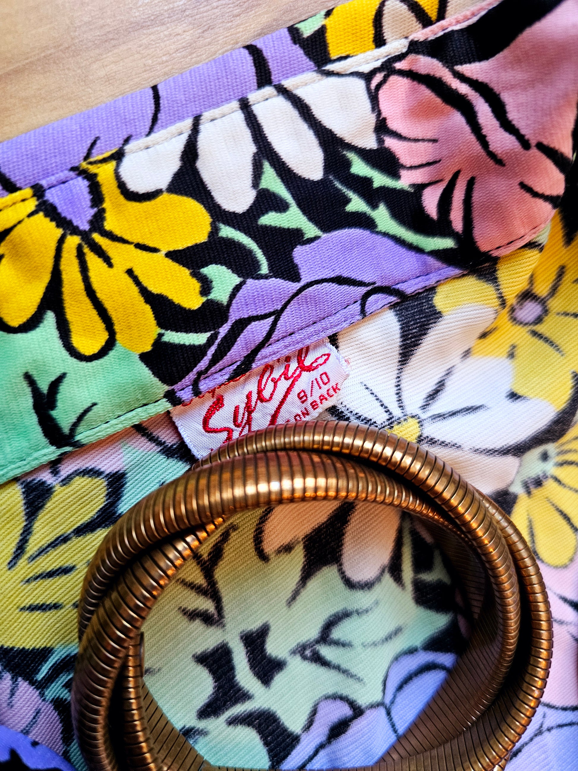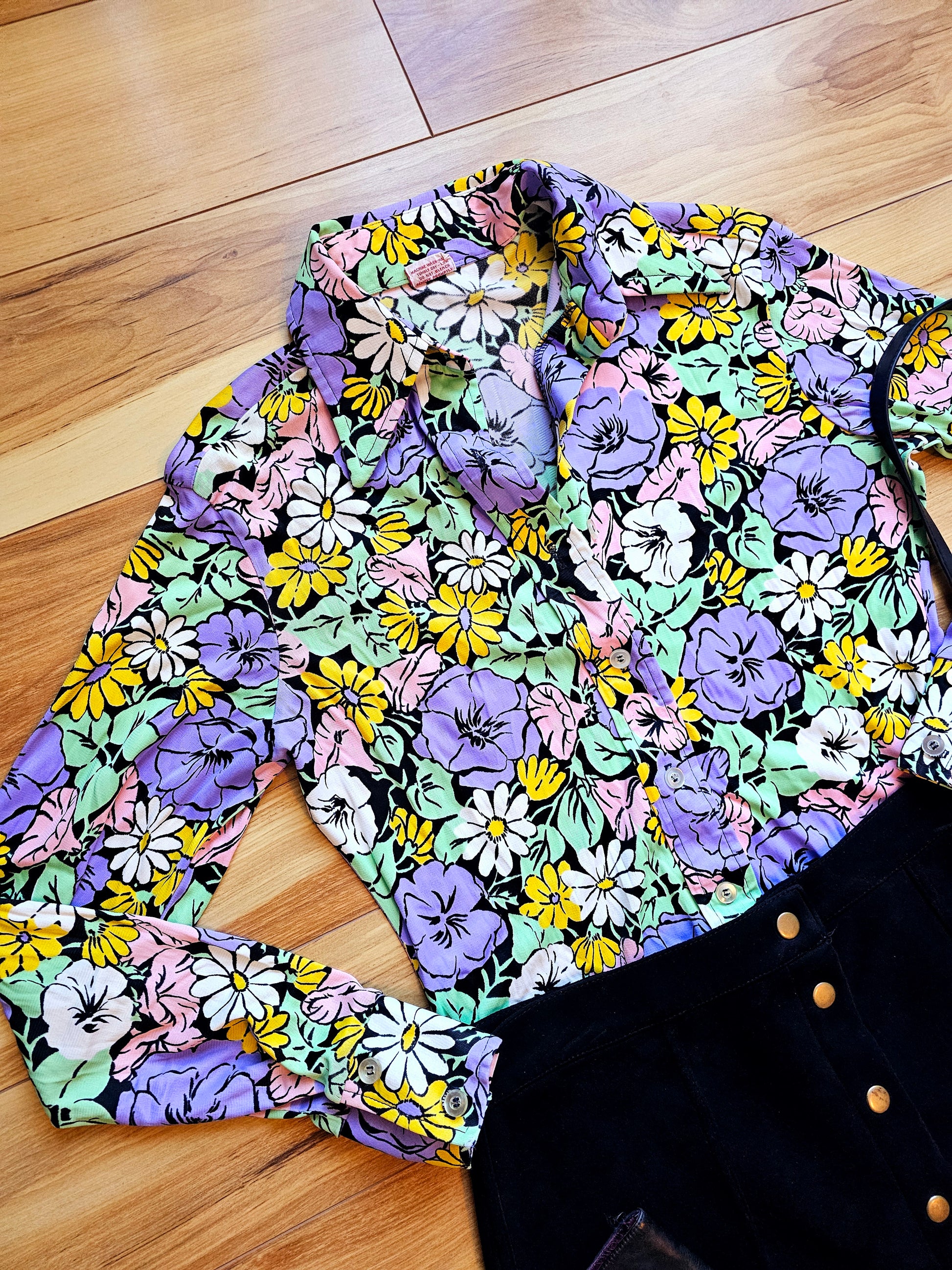 Fun 1960s blouse featuring full button down, dagger collar and pastel flowers on black. Labeled size 9/10, fits like a modern S. Measurements below taken laid flat: