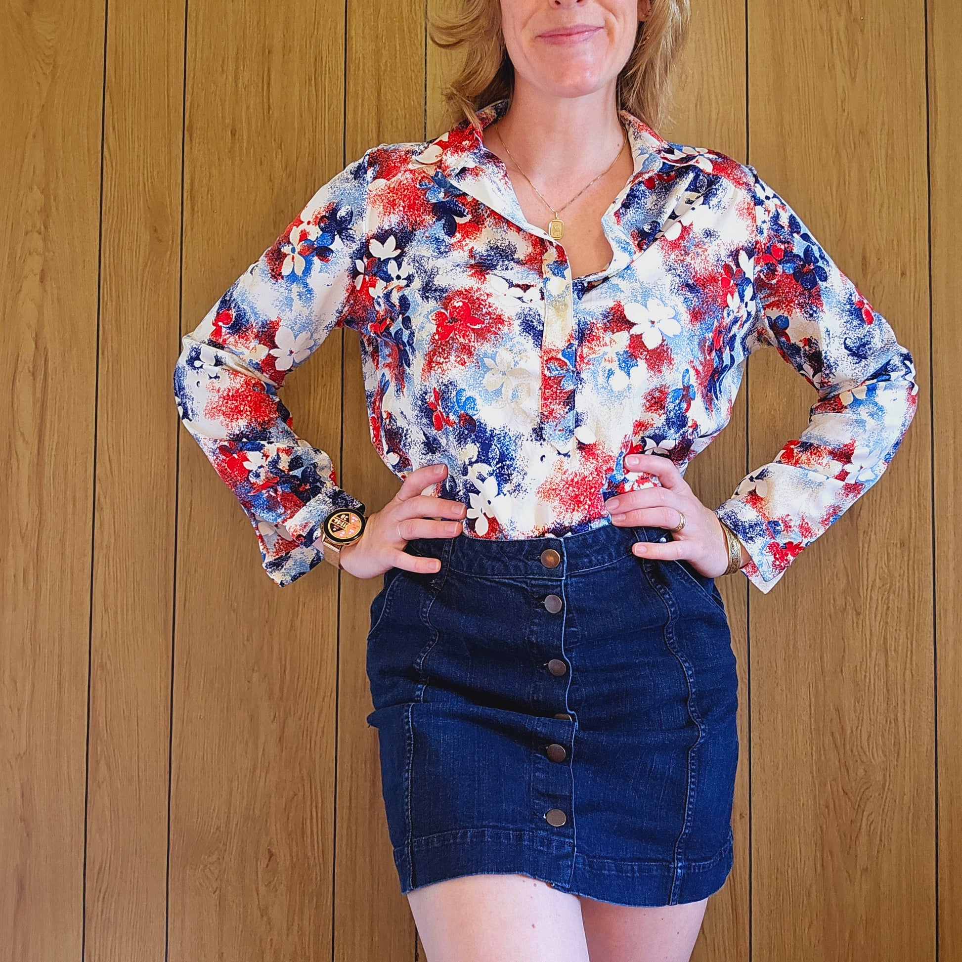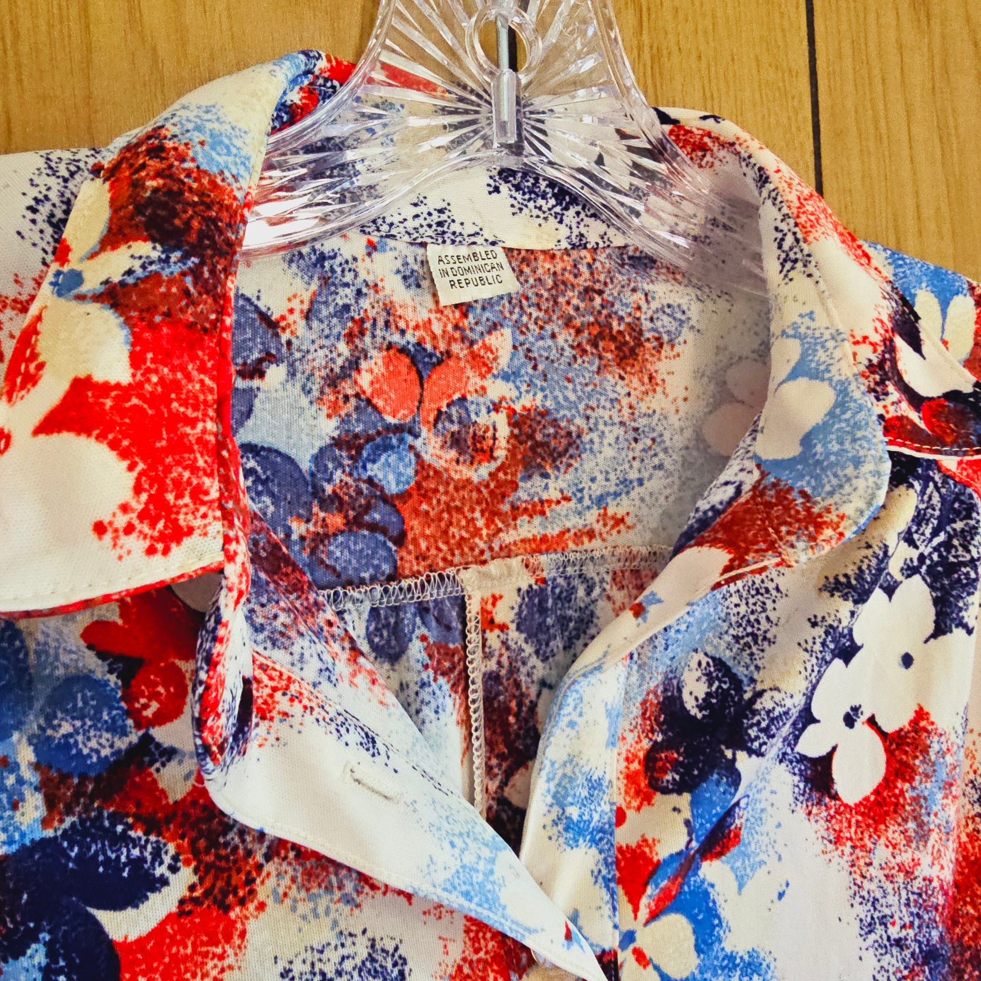 Red white blue floral button down! Best fit size large in my opinion but please refer to measurements below taken laid flat: