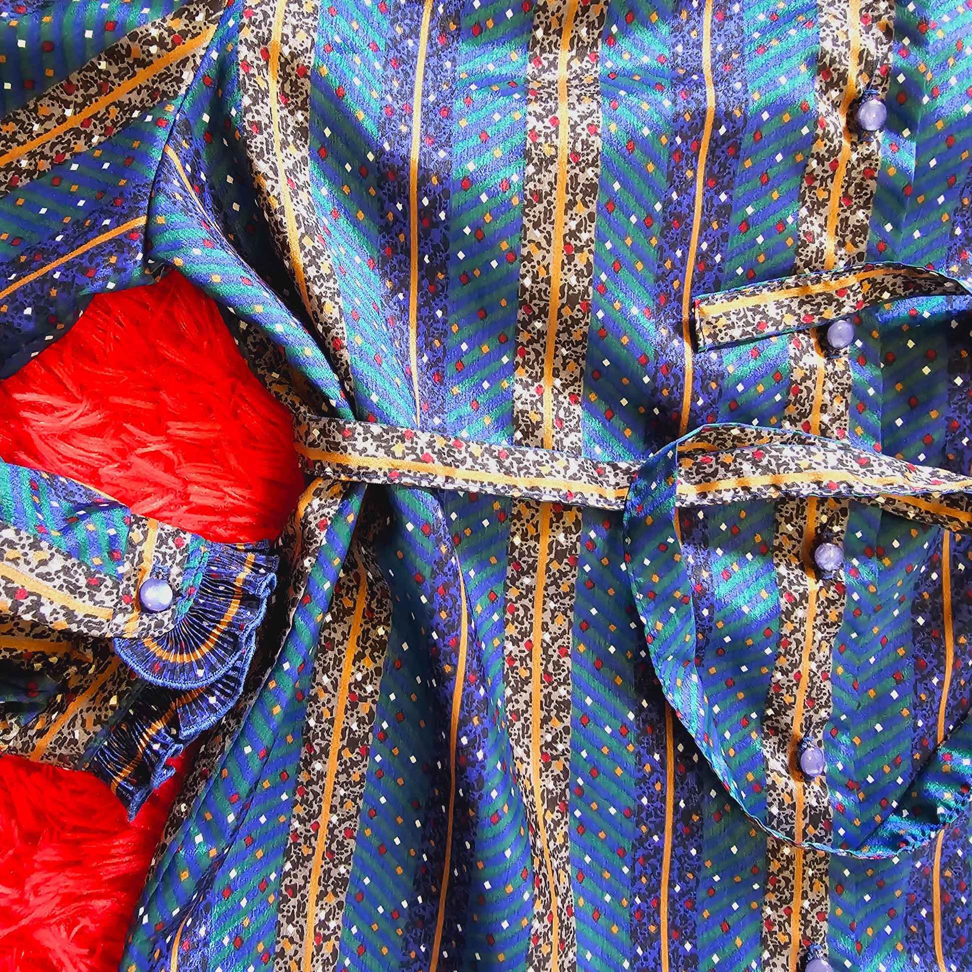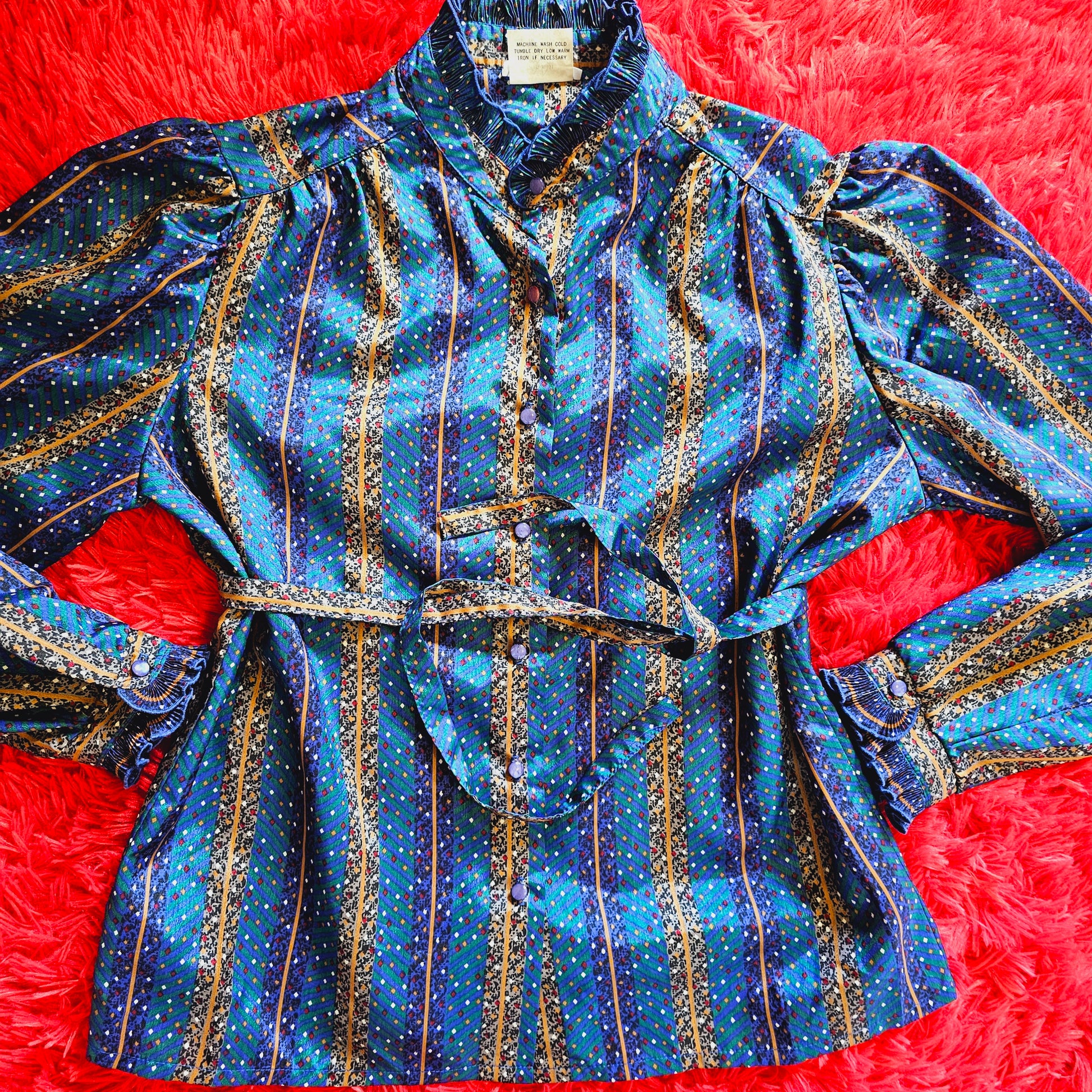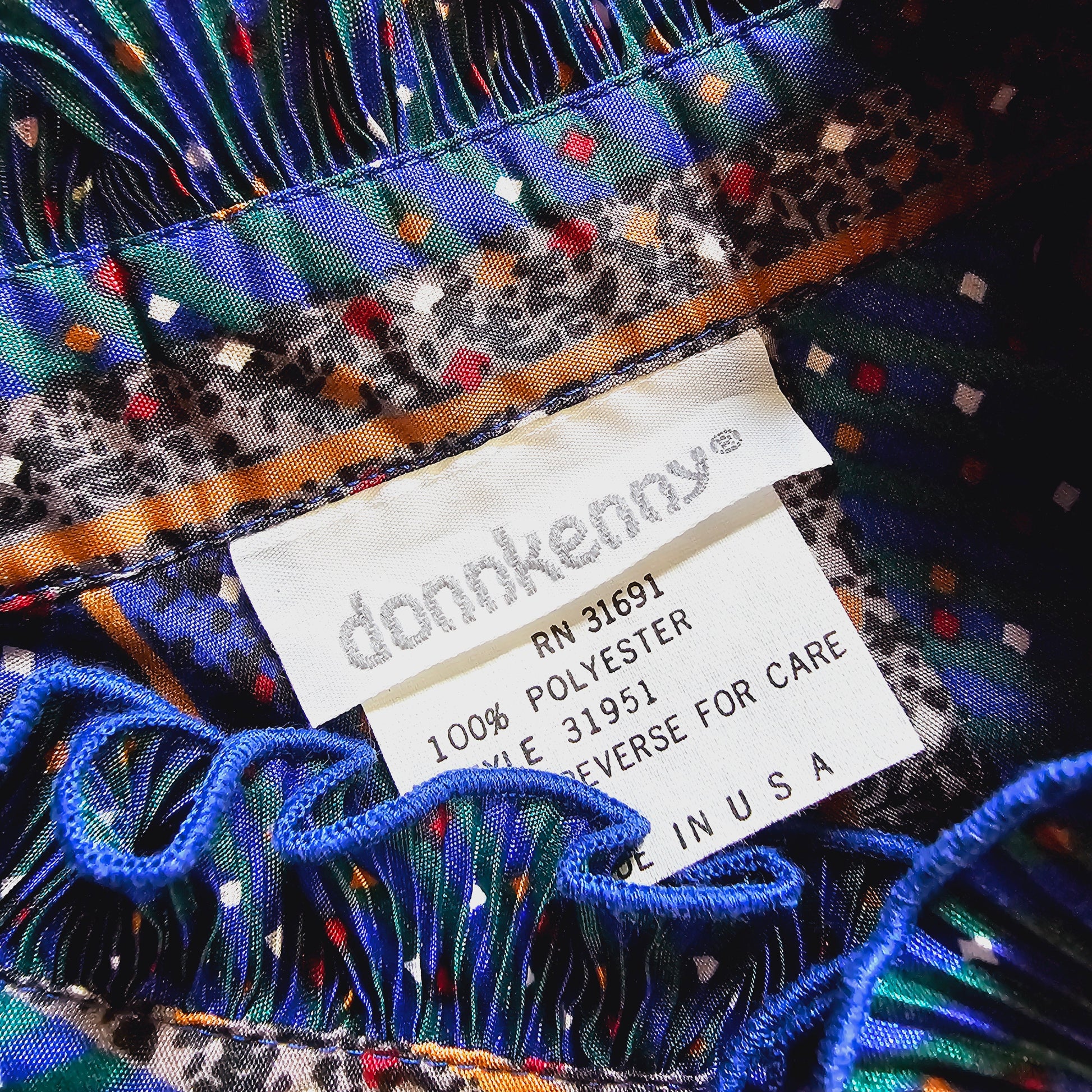 This vibrant 1970s Donnkenny Blouse is so eye catching! Labeled size 16, fits like a modern M/L depending on desired fit. Measurements below taken laid flat, please double where applicable. 100% polyester. Optional tie sash.