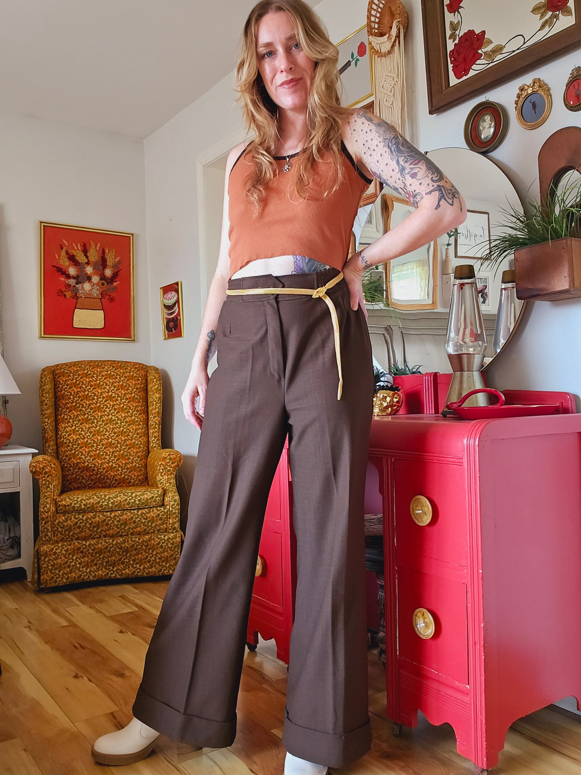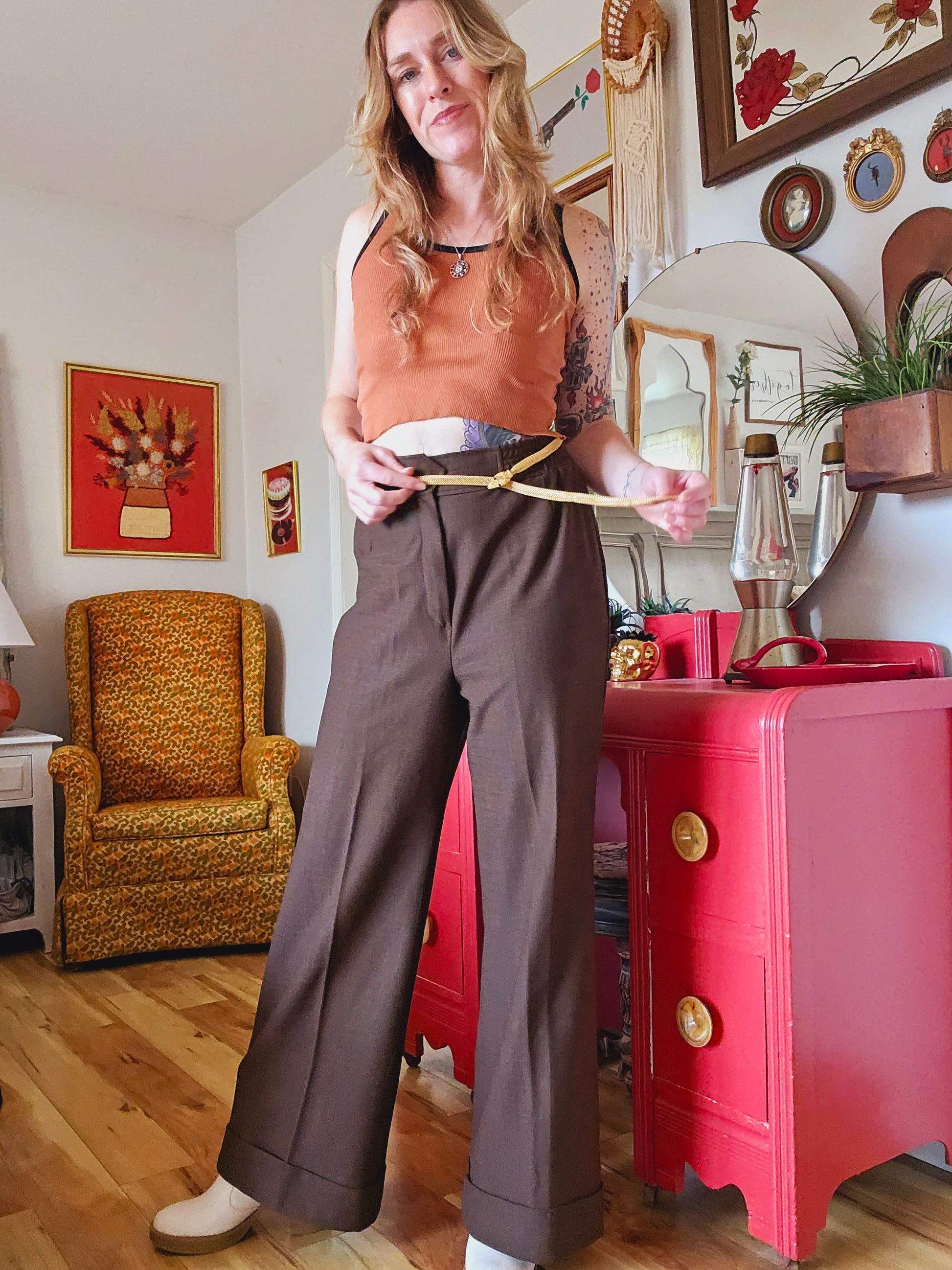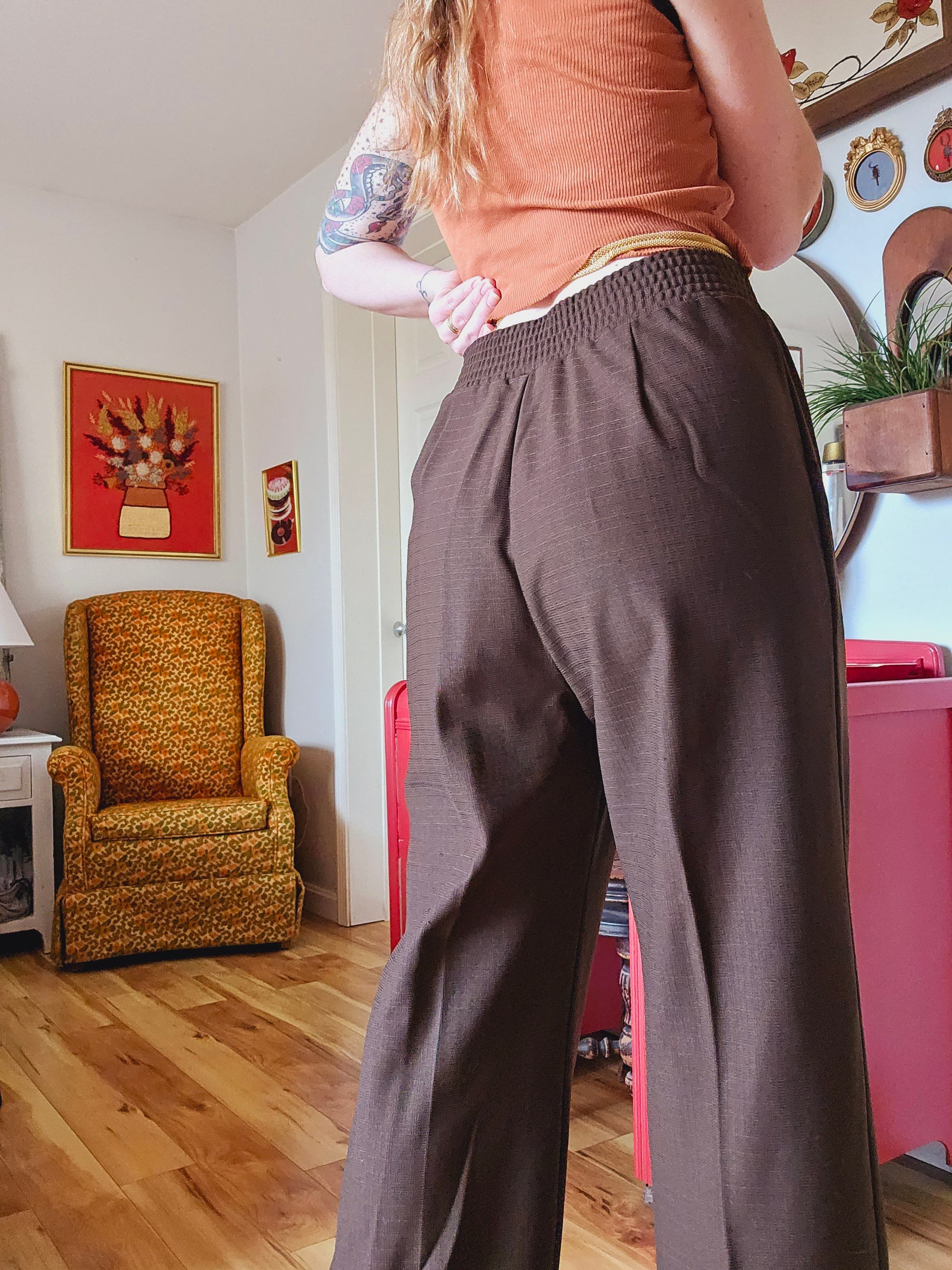 Measurements below taken laid flat, please double as necessary. Modeled here on someone who typically wears a size 6/size 8, and is 5'8" tall.