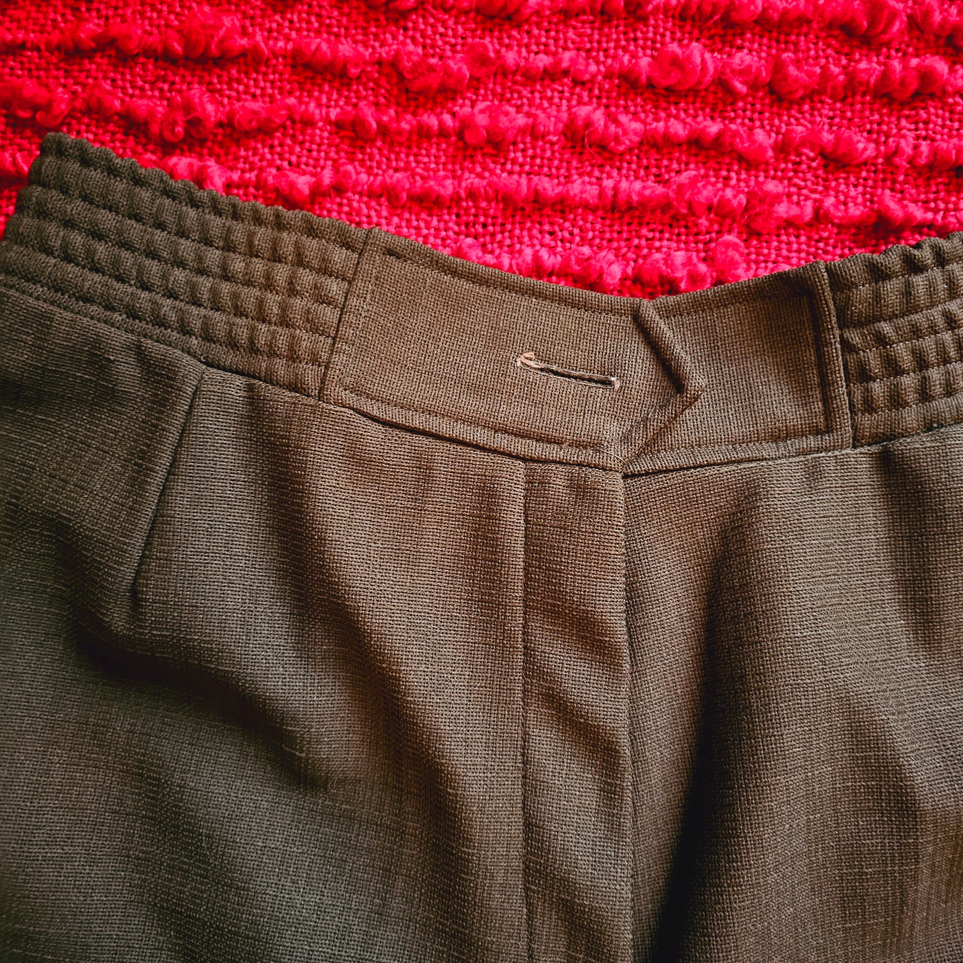 Button & zip elastic waist. The button is missing though--needs a replacement sewed on, but should be a very quick fix.