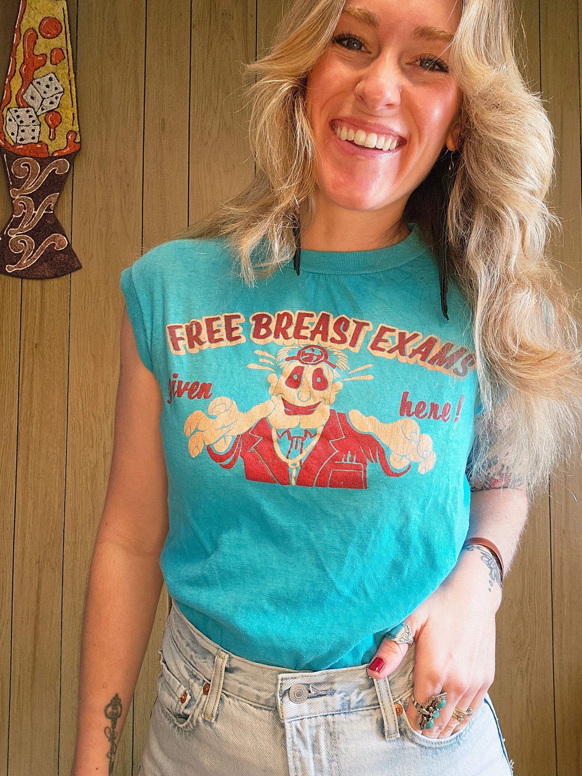 Fun 70s novelty tee! Fantasy brand. Marked a size medium, fits more like a modern day small. While laid flat it measures 20" across the chest (armpit to armpit) and 20" in length, does have some stretch.