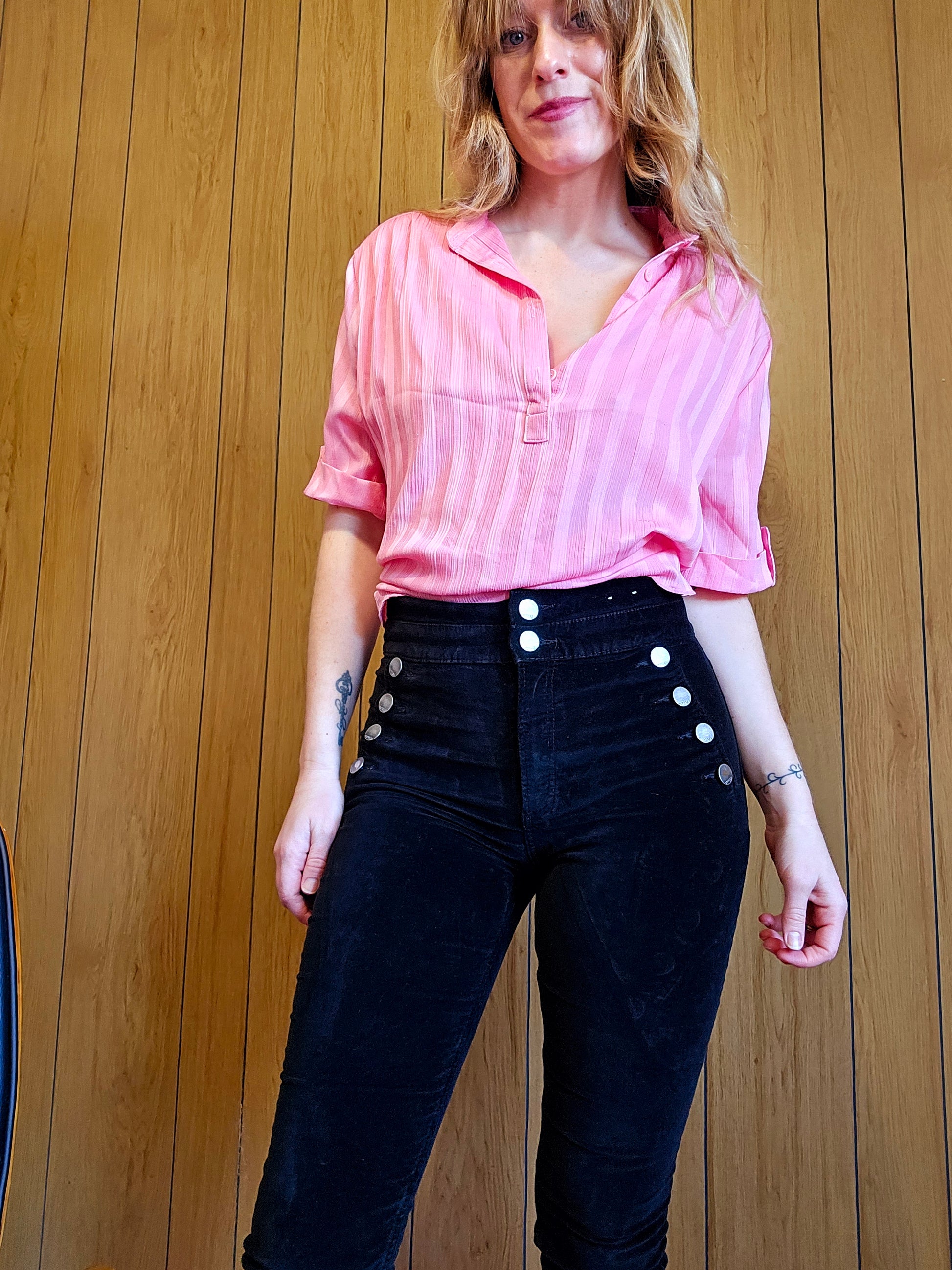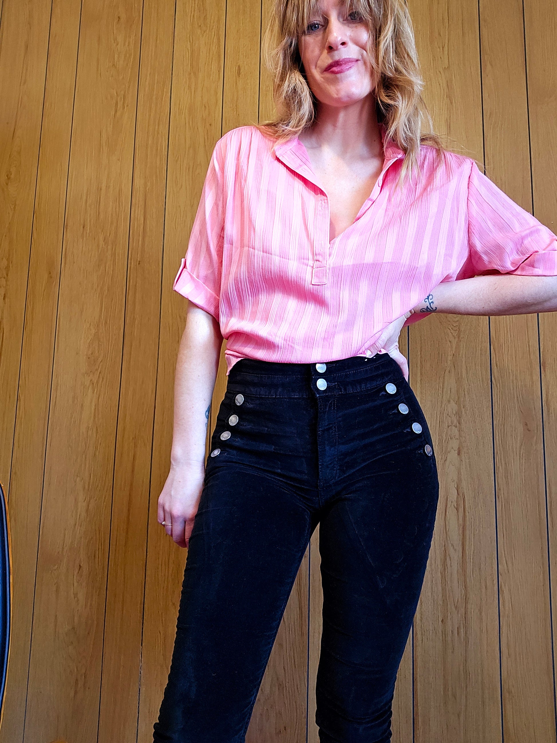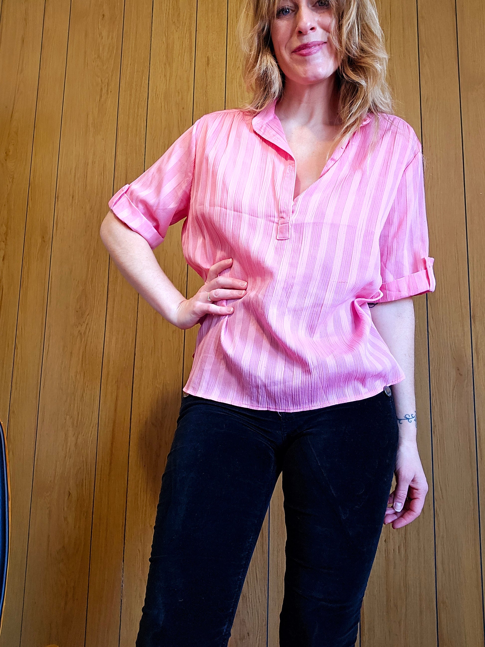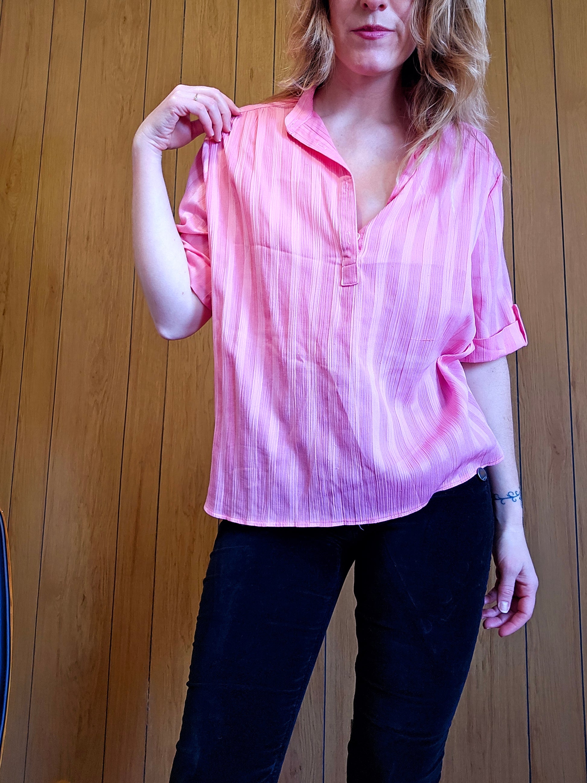 3/4 sleeve, half button down with light vertical striping. Lightweight and lovely. Slightly "tuliped" side slits. Modeled here on a medium model, best fit estimated as L-XL depending on desired fit. Does have some light signs of wear, a pull on the front left. Measurements below taken laid flat - chest (armpit to armpit) 24" , Length 24"