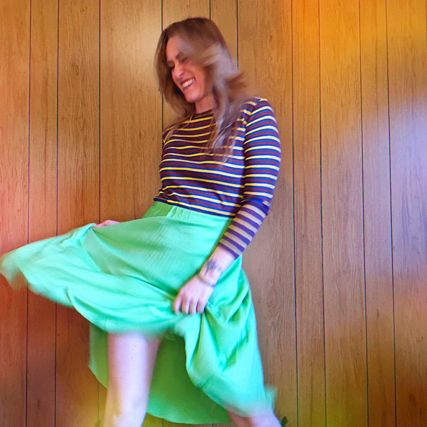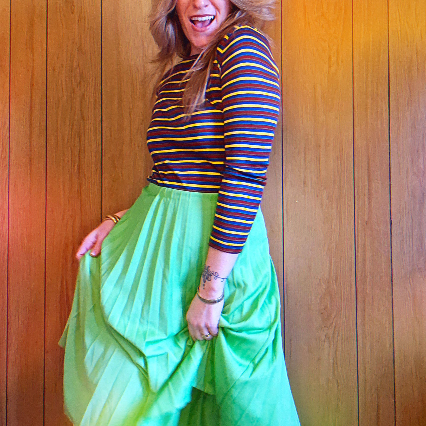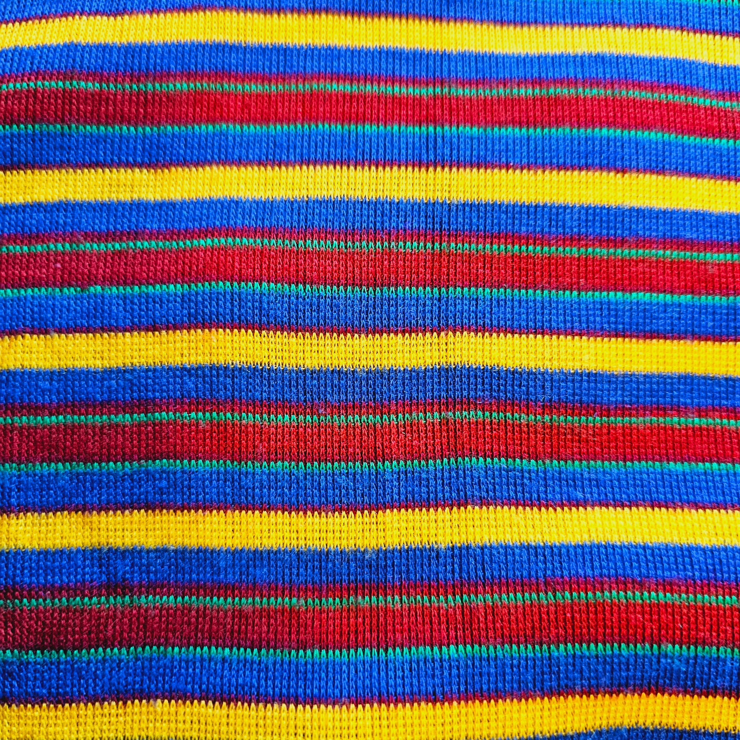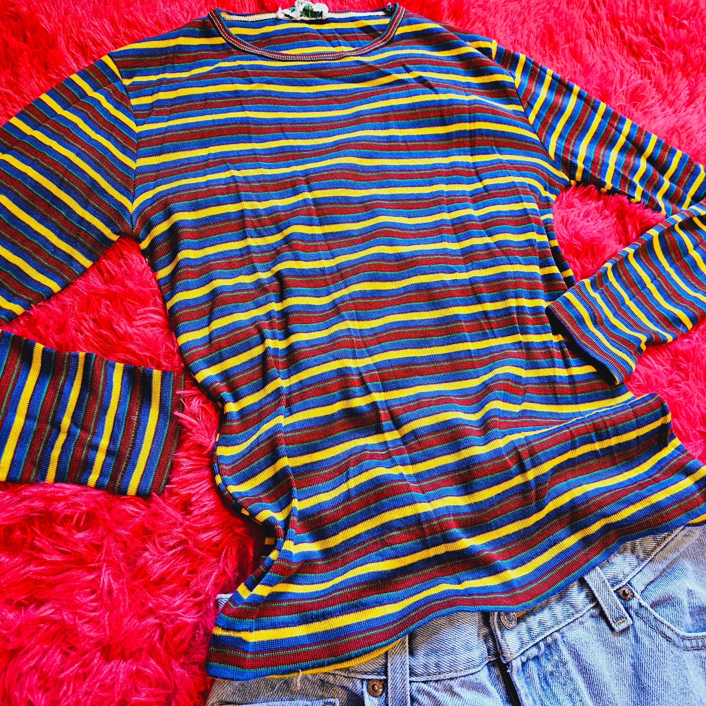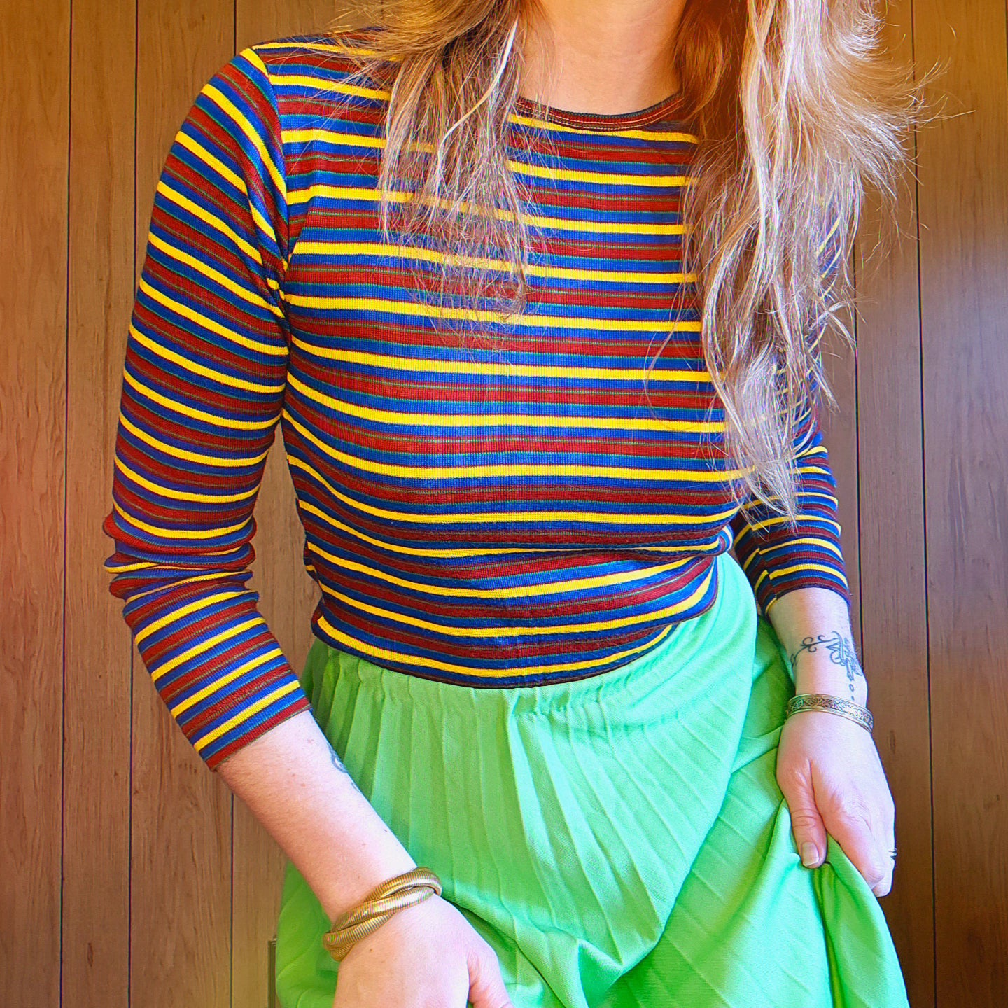 70s striped top! Buttery soft! Blue, yellow, green, and brownish/red.