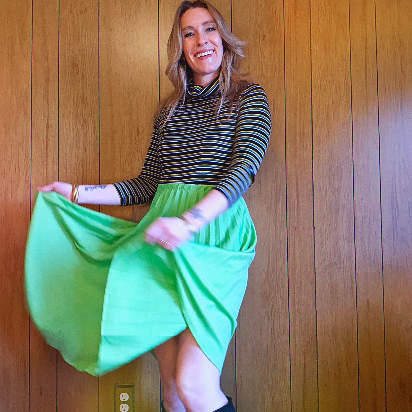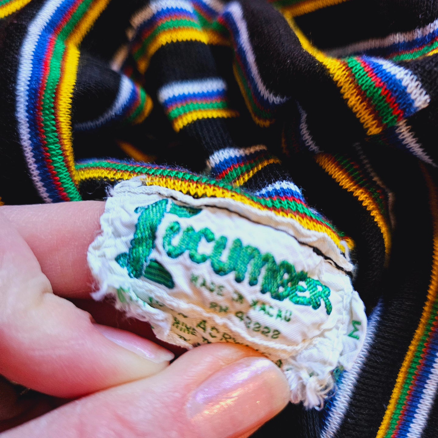 Another 70s striped top! This one has black, yellow, green, white, and red. "Cucumber" brand, buttery soft. Labeled size medium, best fit S/M. Measurements below taken laid flat: