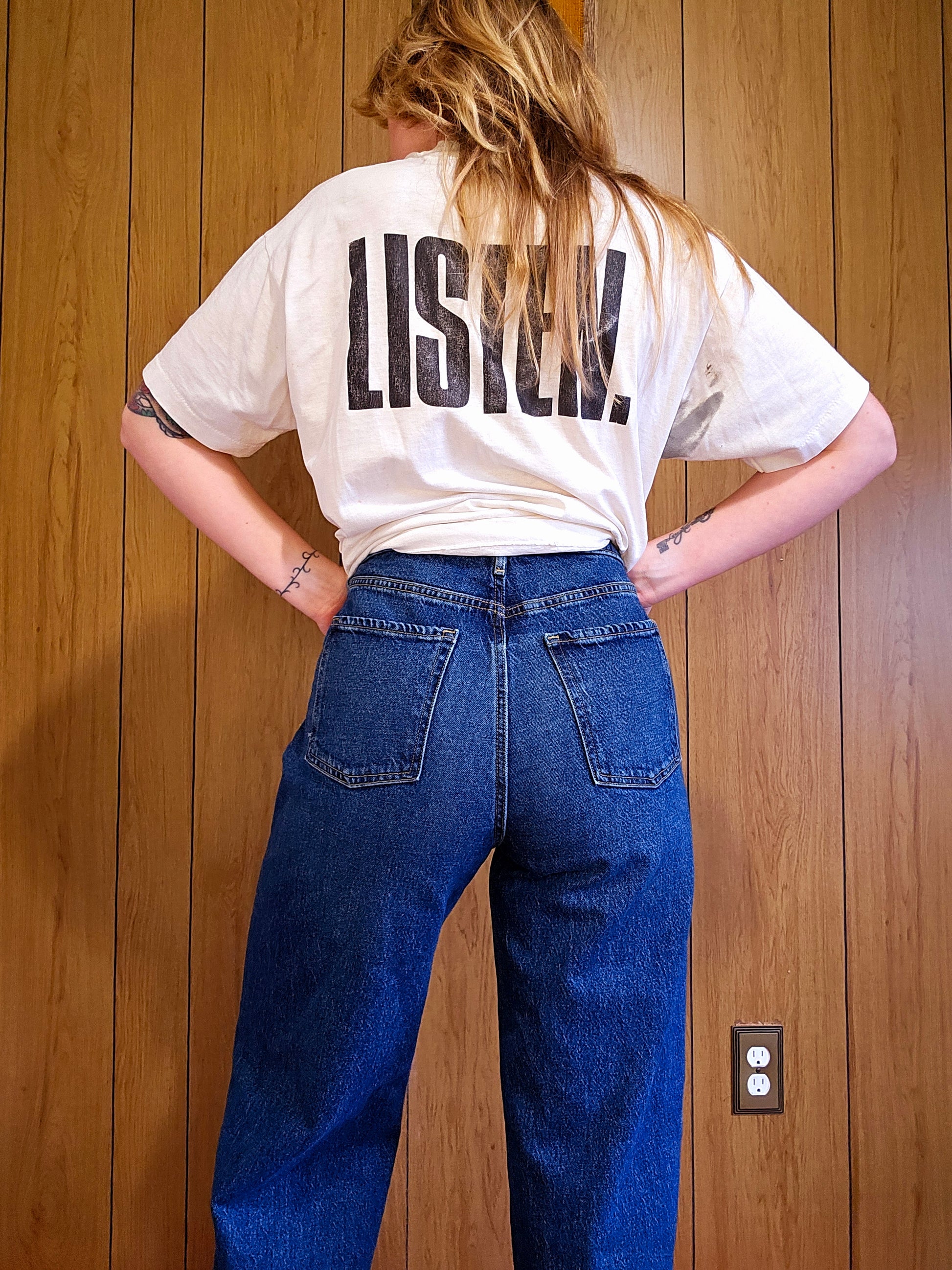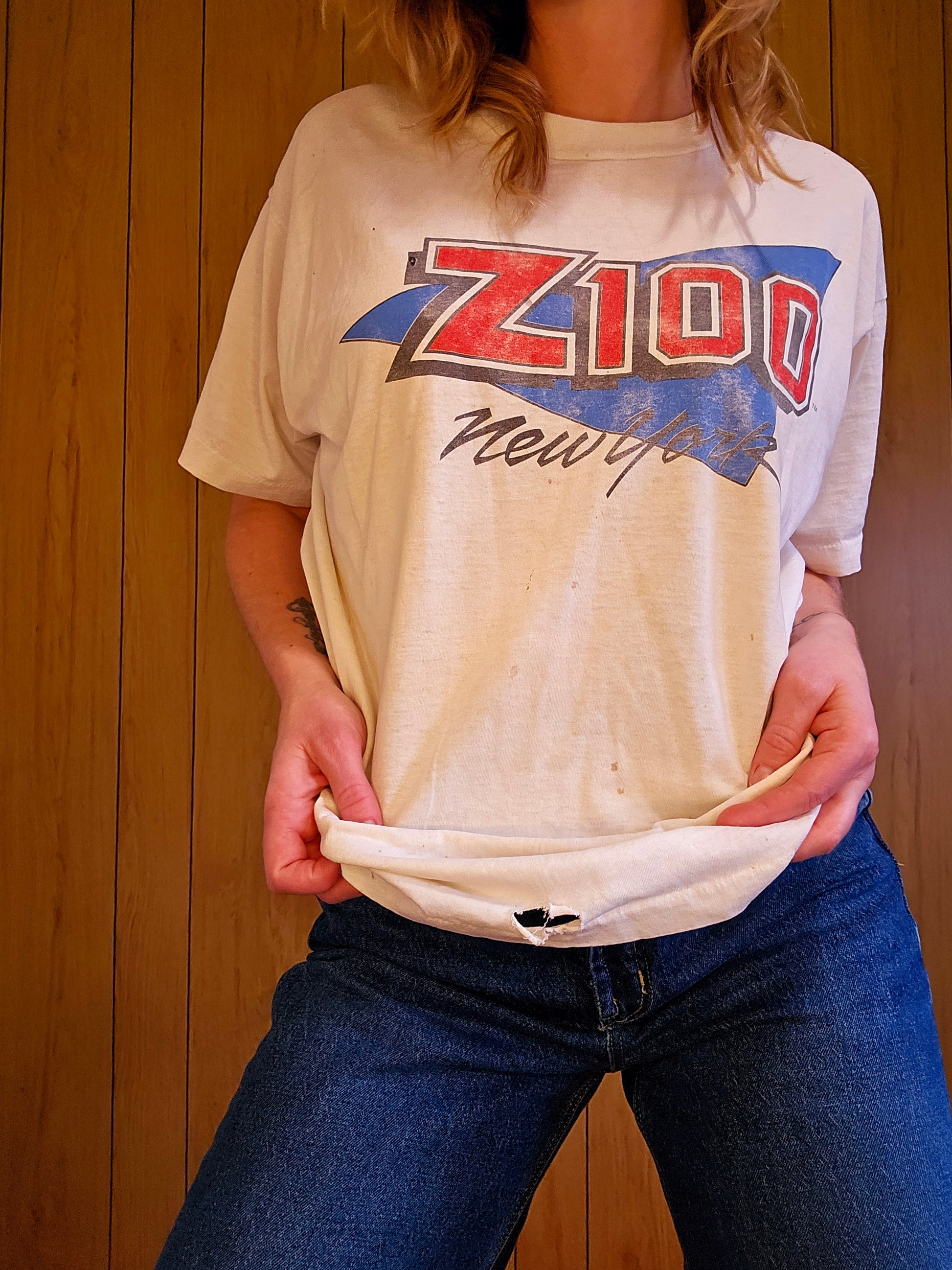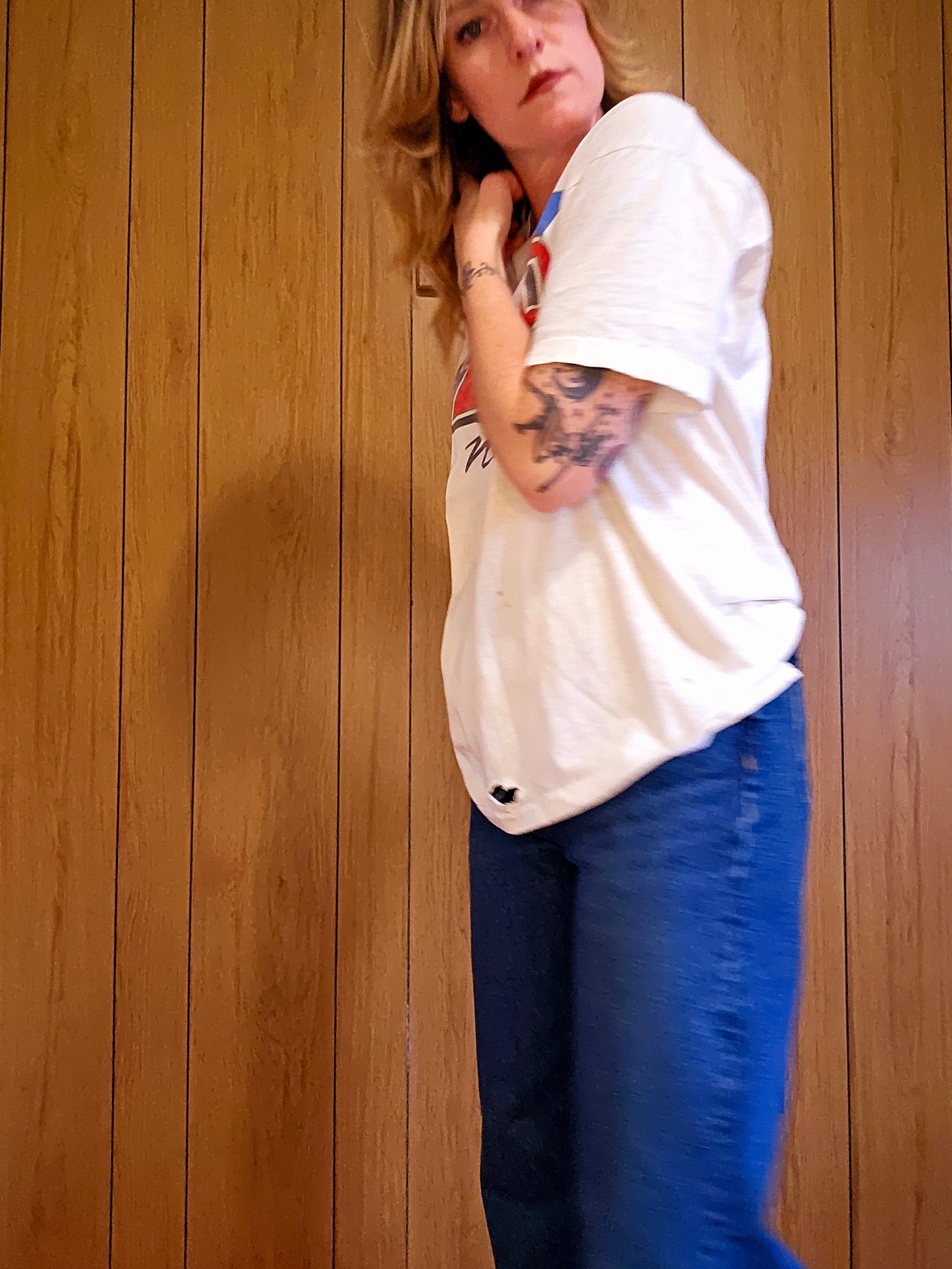Single stitch. Shoulders 22" across. Chest 24" across. 28" length. This tee is perfectly thinned and thrashed (holes, markings, stains).