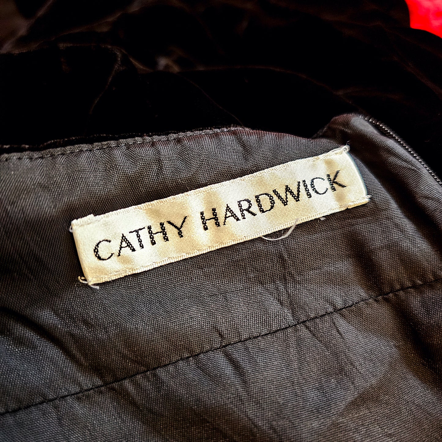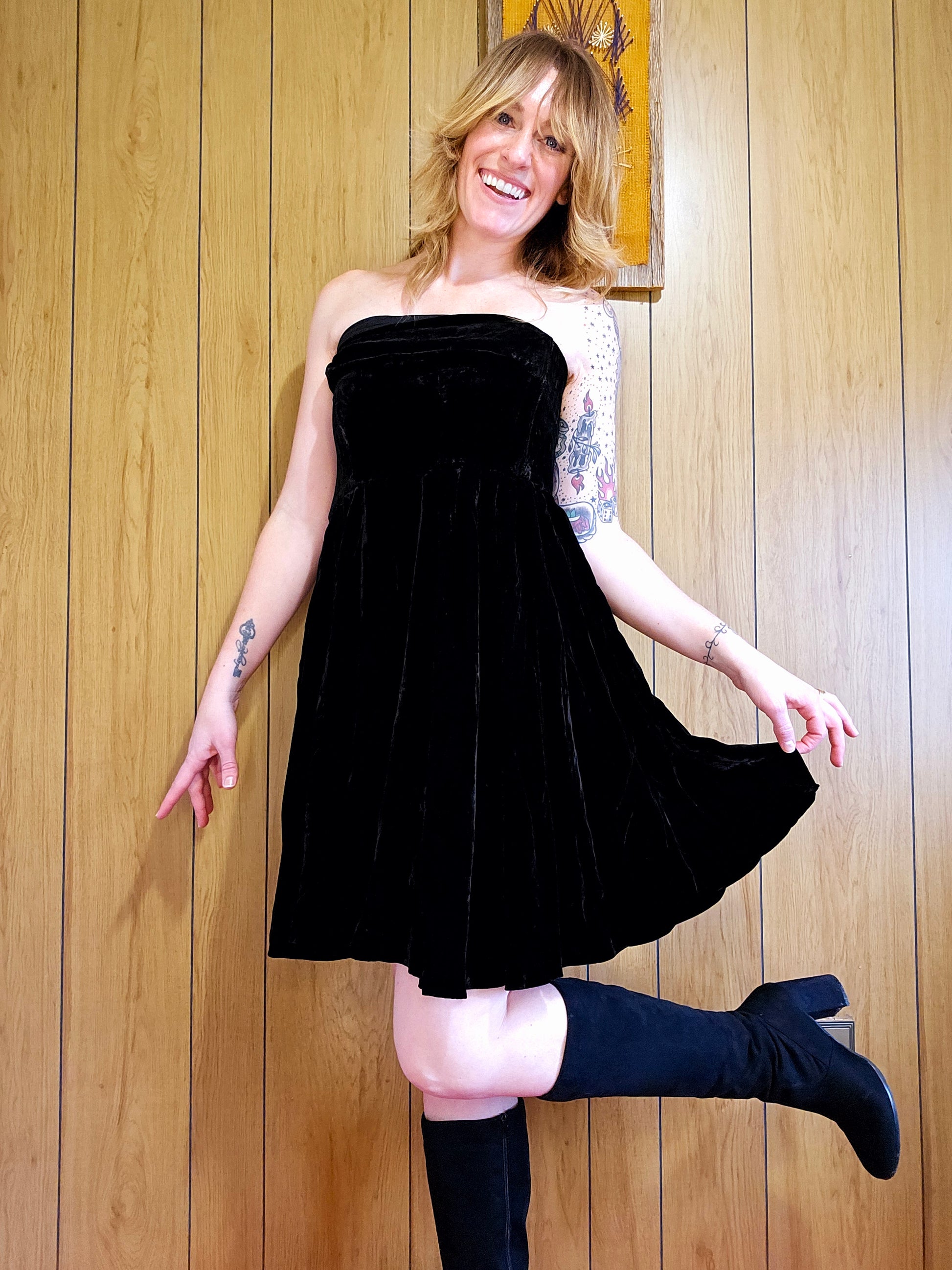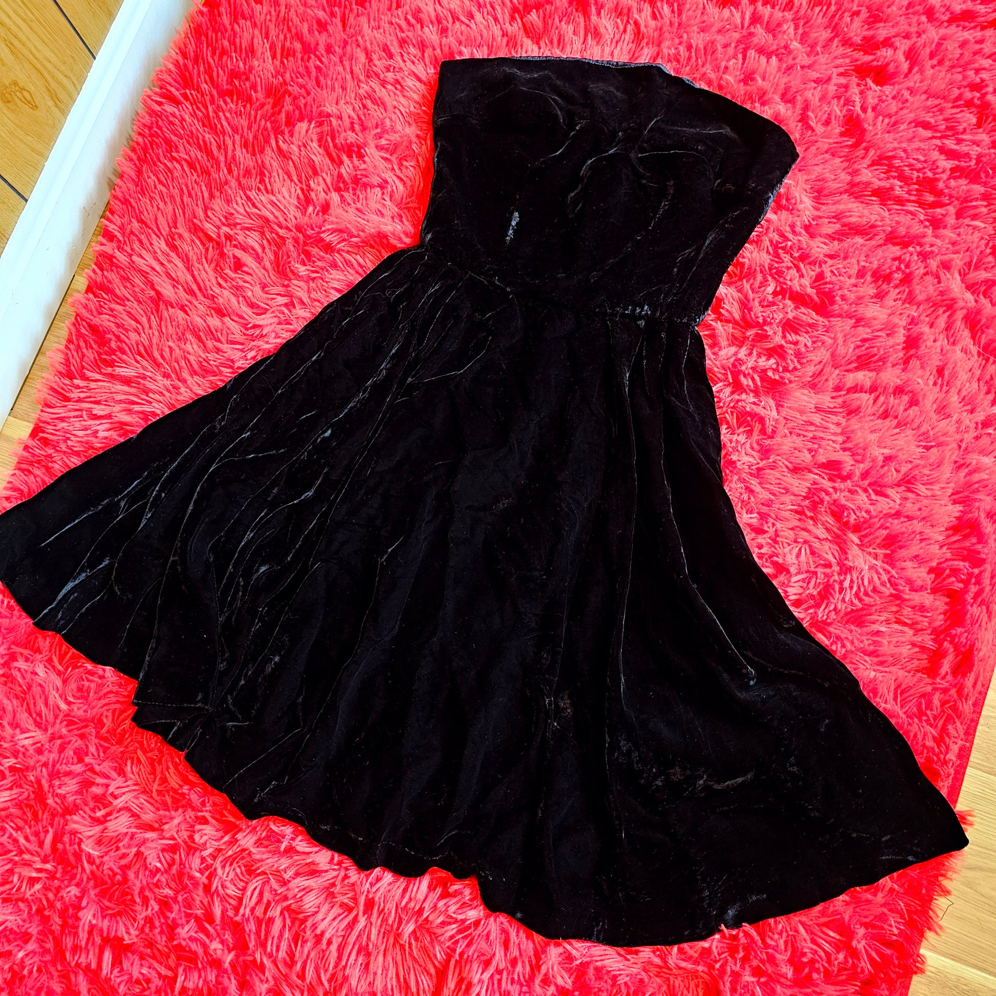 80s/90s Cathy Hardwick black velvet strapless dress! Buttery velvet with a beautiful weight to the material. Model typically wears a size 6-8 and could not fully zip this dress.