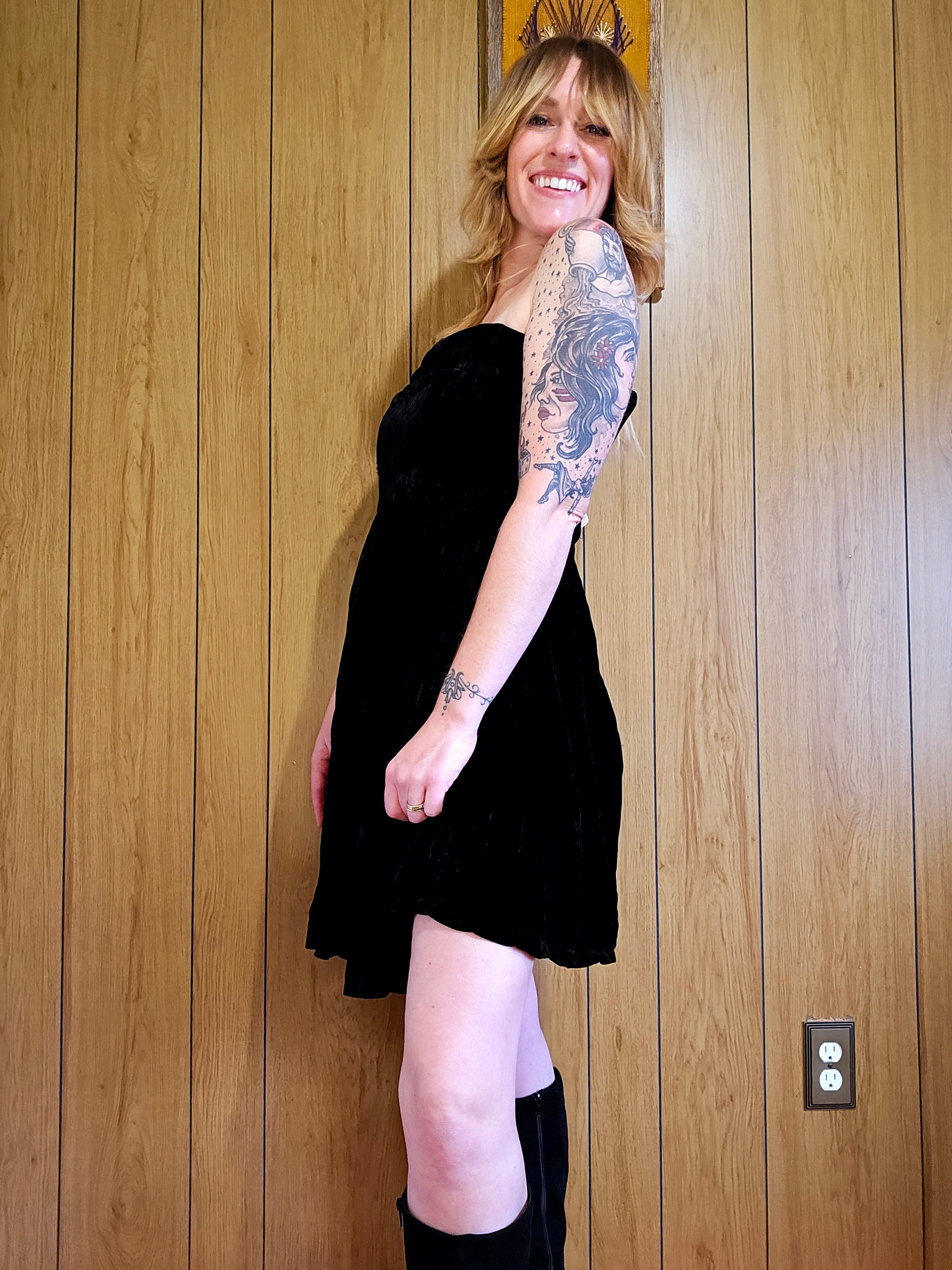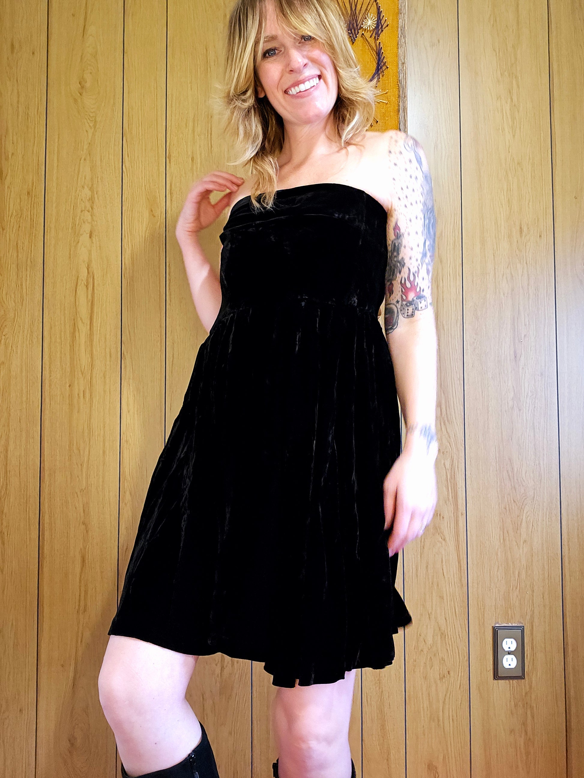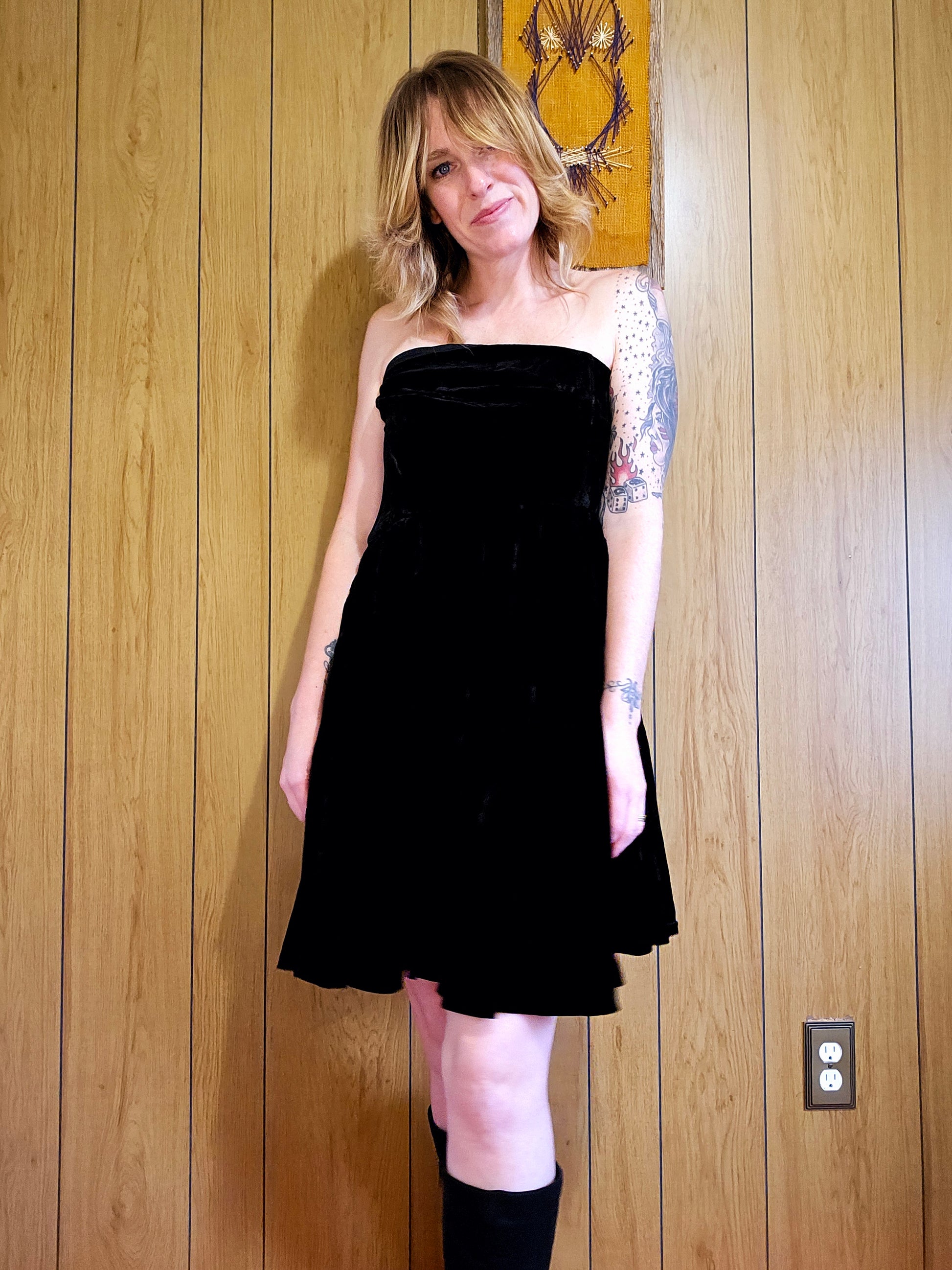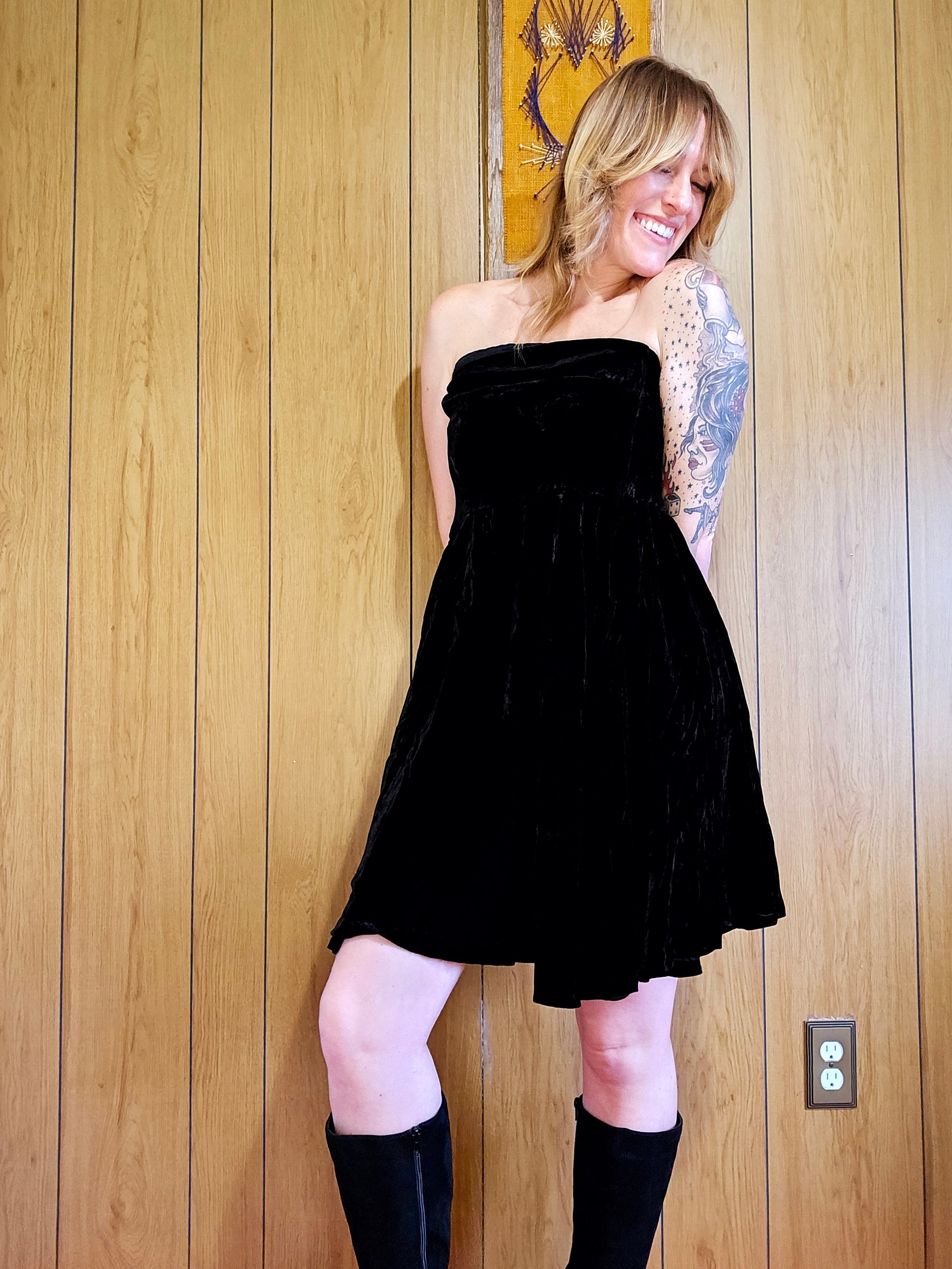 80s/90s Cathy Hardwick black velvet strapless dress! Buttery velvet with a beautiful weight to the material. Model typically wears a size 6-8 and could not fully zip this dress.