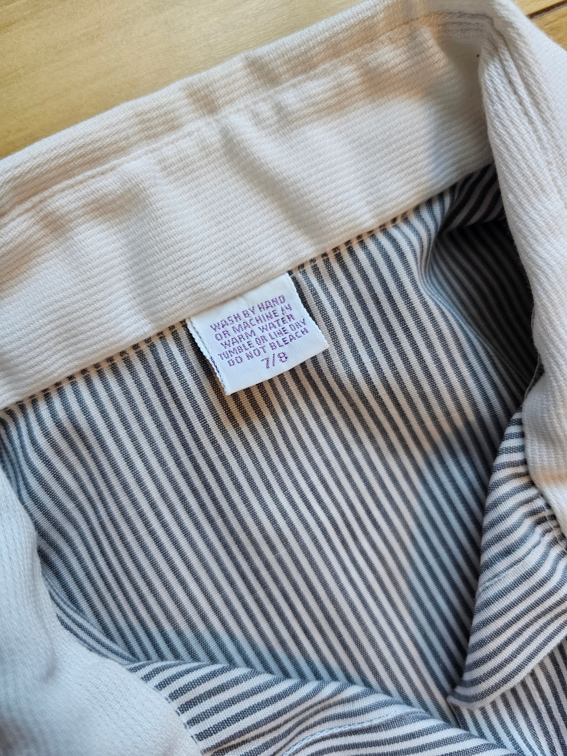 Versatile striped button down. Bluish stripes on white with solid white collar and cuffs. Labeled size 7/8, fits like a modern medium. Measurements below taken laid flat: