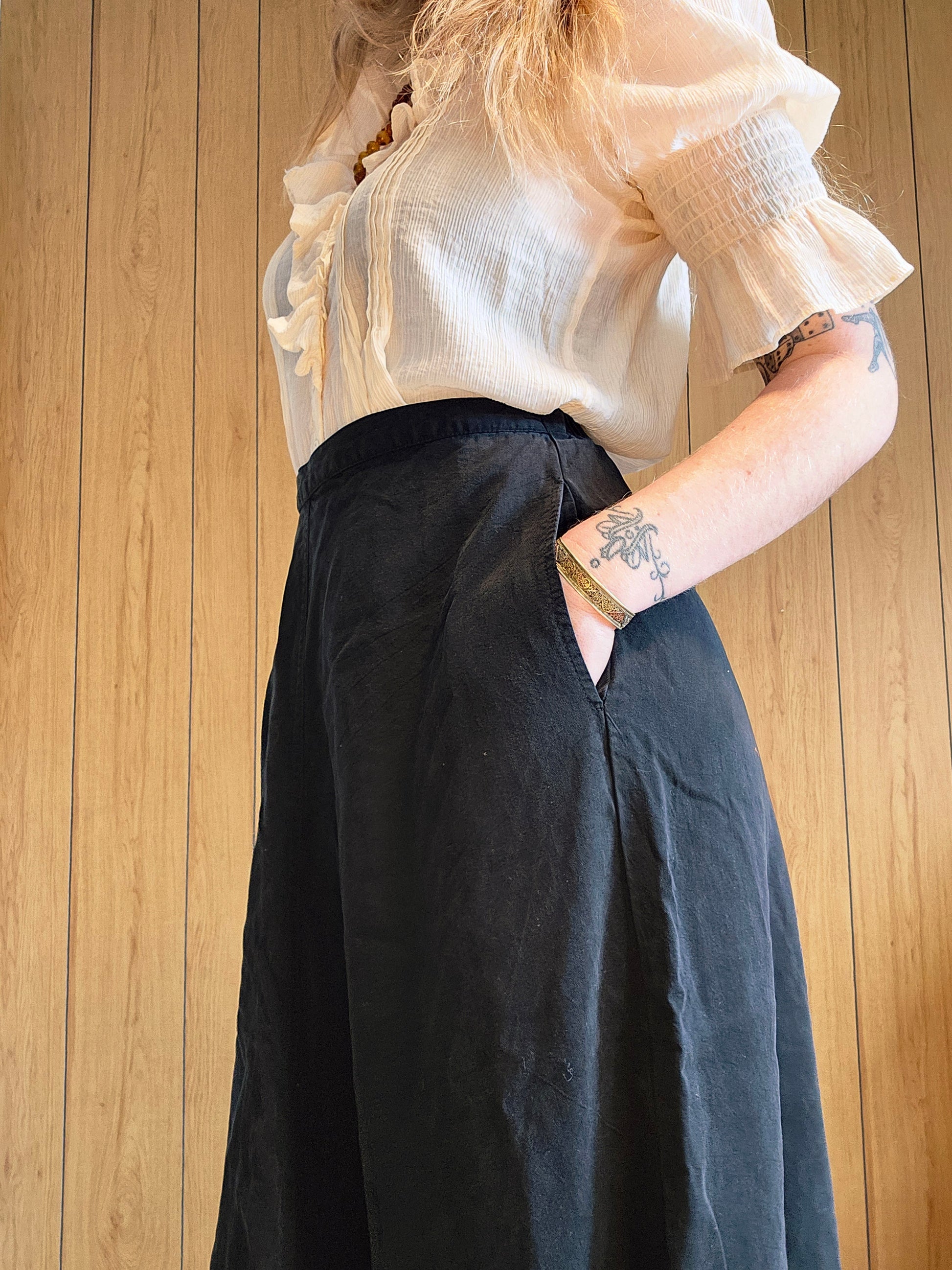 1980s Carol Anderson Collection skirt! Perfectly worn in black that moves and flows with you. Labeled size large, fits true. 100% tencel material. Has pockets! Elastic waist! Measurements taken laid flat: