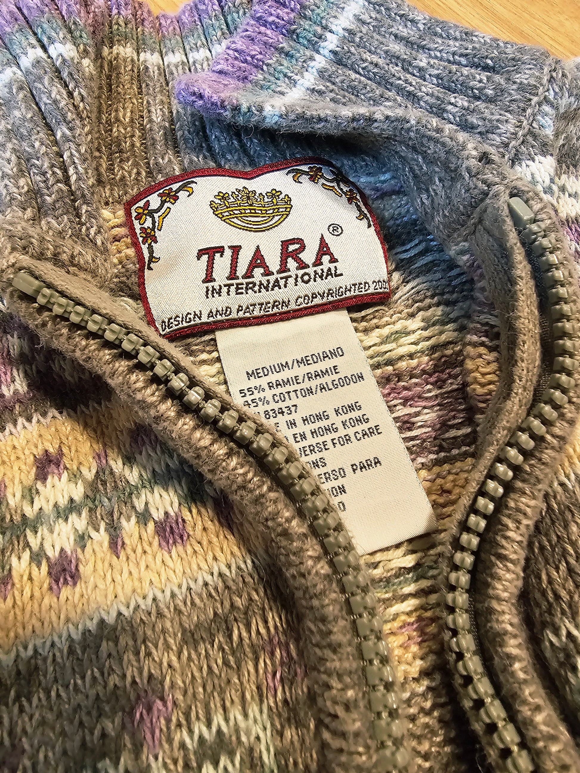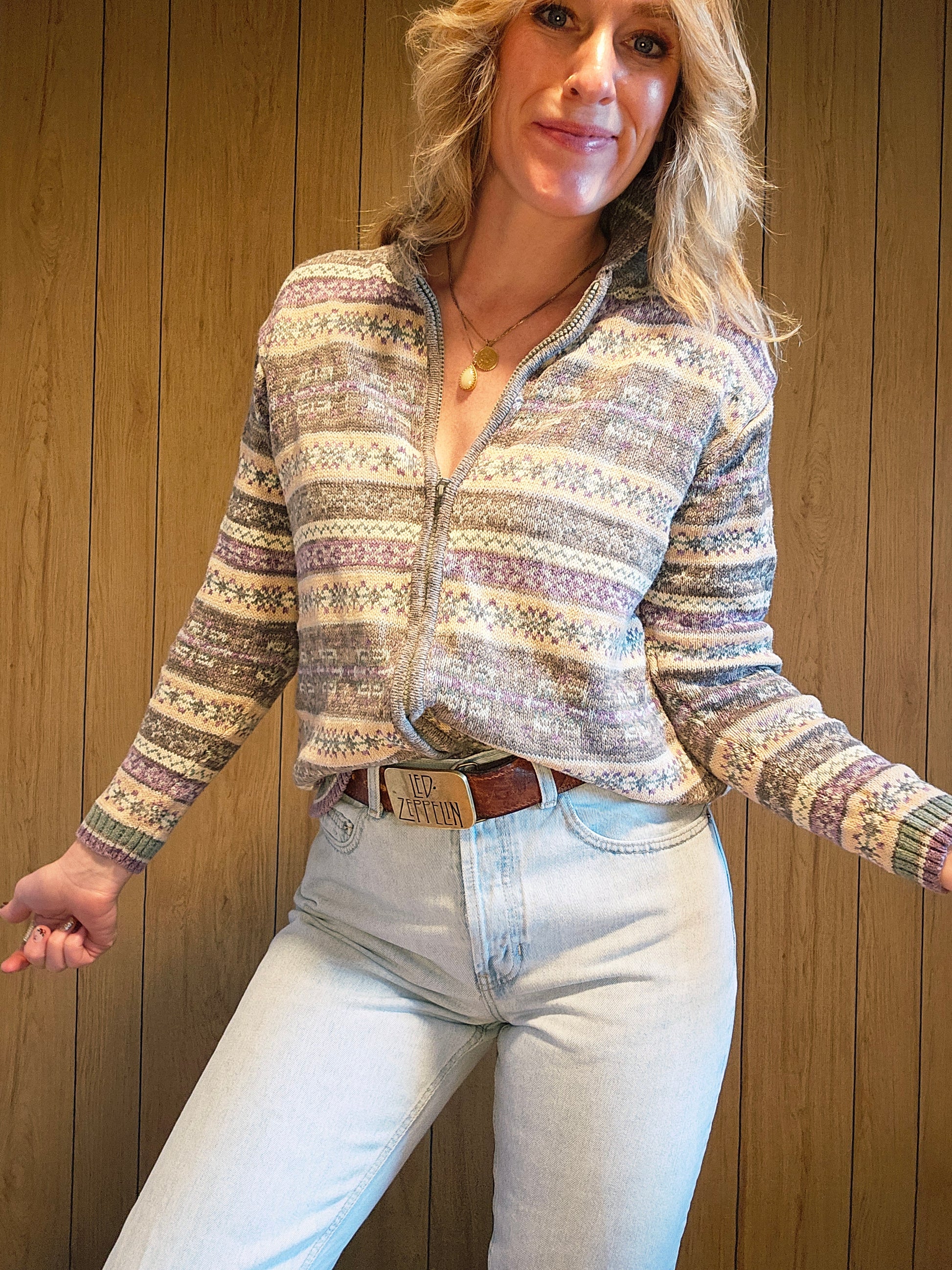 90s full zip Tiara International sweater in a grey, purple, tan, and white colorway. Size medium, fits true. Measurements taken with garment laid flat, so please double where applicable: Chest 21". Shoulders 16". Length 22".