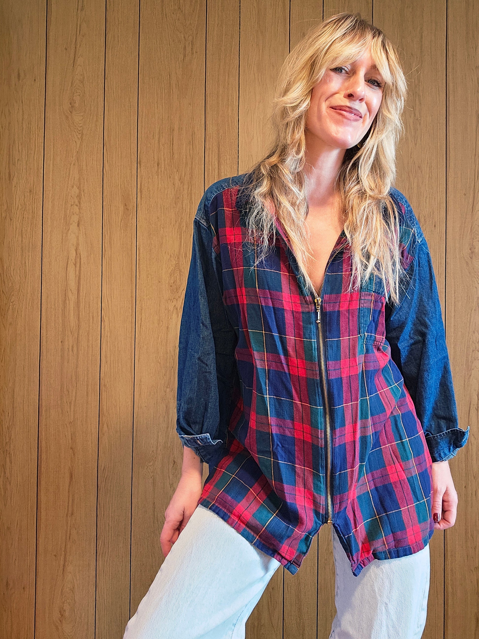 This one is SO comfy, I didnt want to take it off 😂 90s/Y2K "Just For Women" plaid & soft denim top with full front zip. Labeled 18W. Modeled here on a medium, sporting an oversized look. Estimated XL but measurements below taken laid flat so please double where applicable: