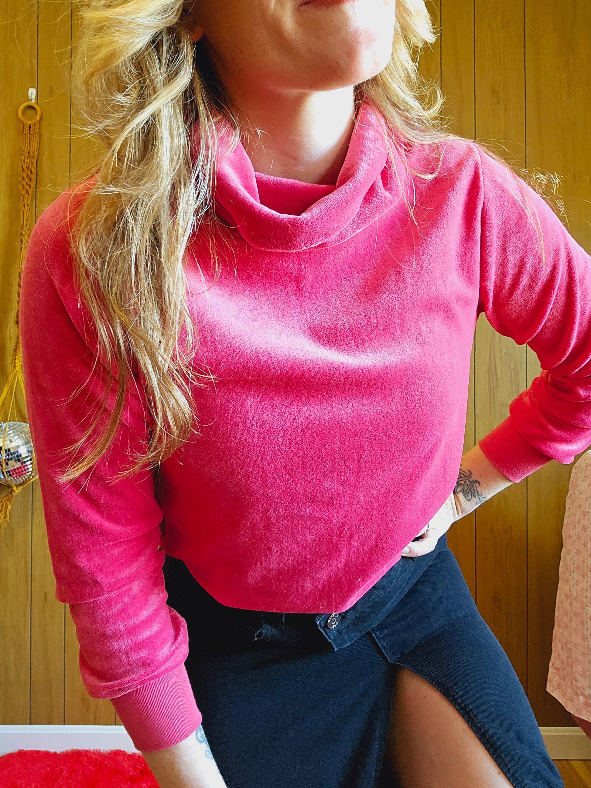 Velvety pink cowl neck top! As comfy as your favorite worn in sweatshirt!