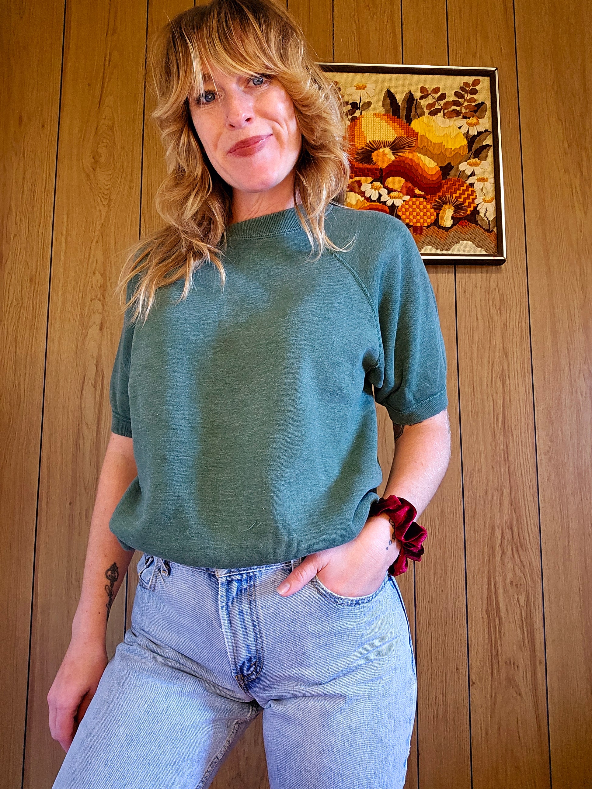 80s short sleeve pullover sweatshirt! Fit up to size large depending on desired fit. Worn in to be perfectly soft. Does have small stains. Laying flat it measures 22" at the chest and 23" long.