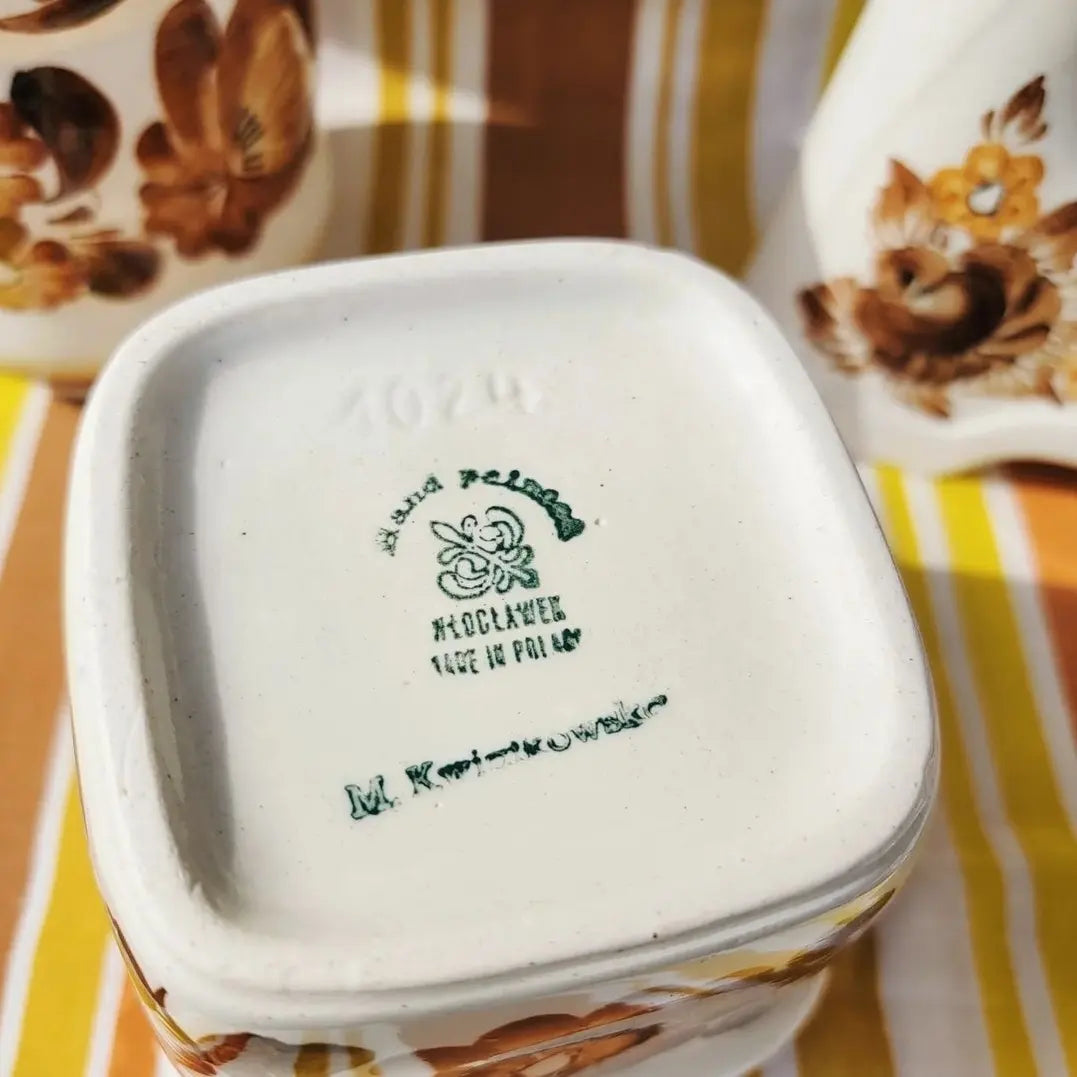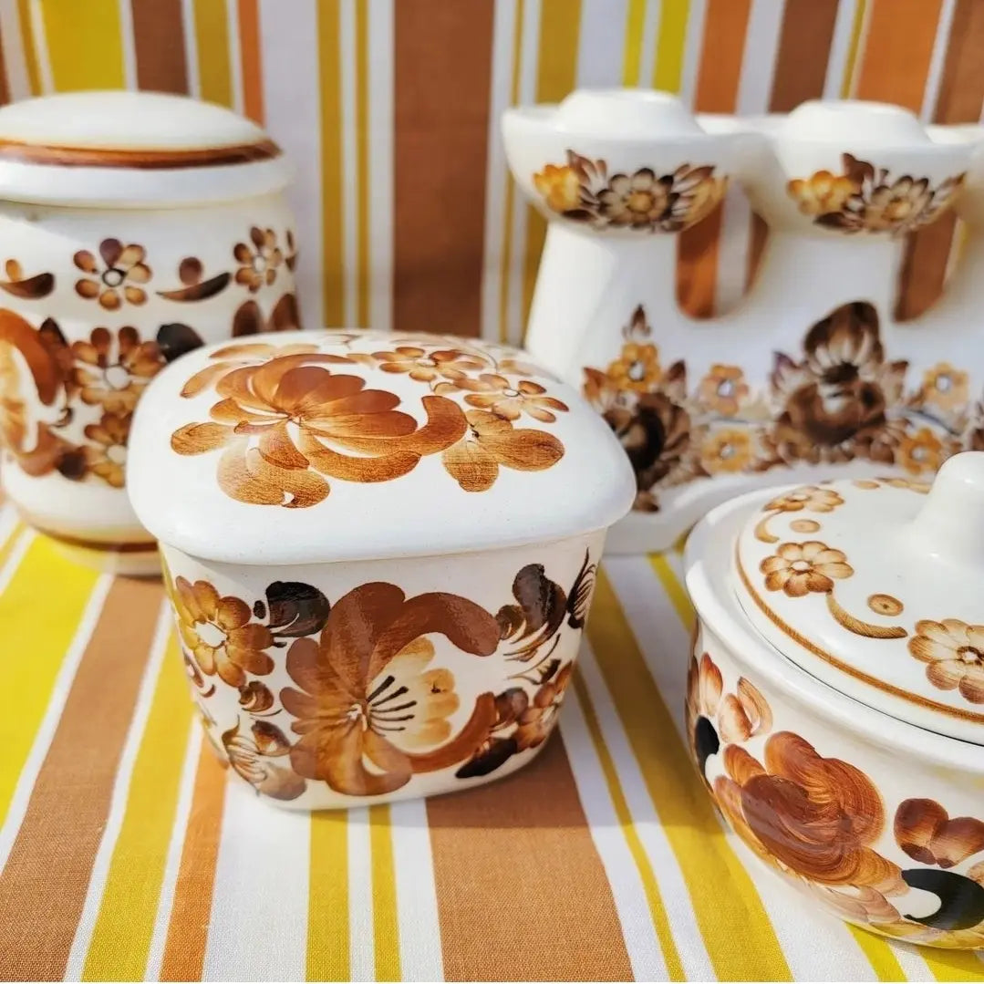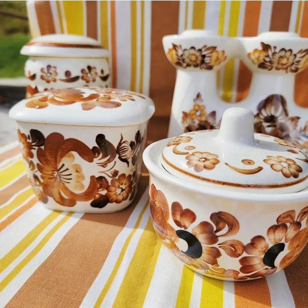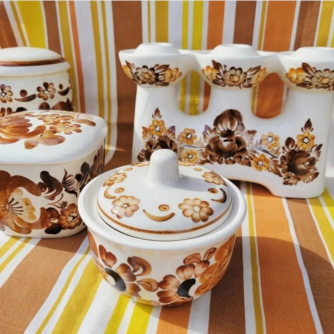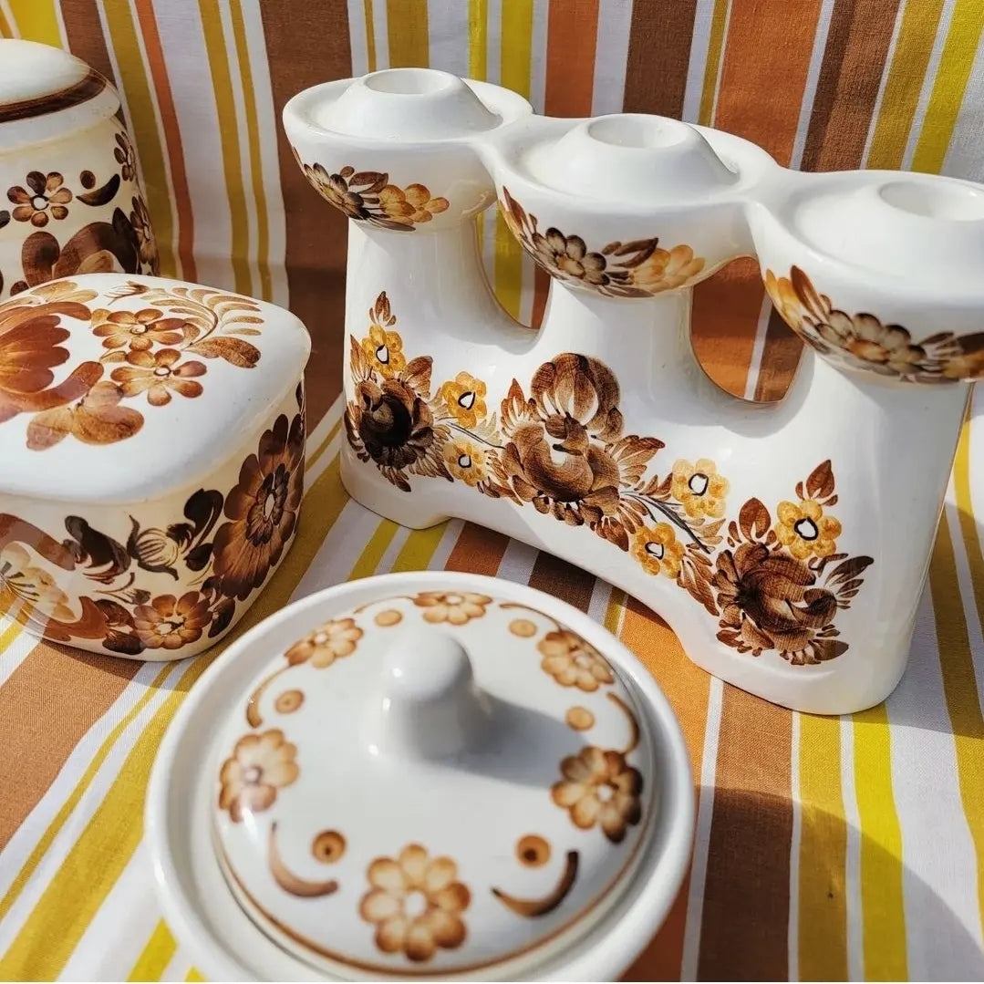 A stunning set! ๐ค๐งก๐๐ค hand painted, made in Poland. A candlestick display and variety of lidded containers in the prettiest colors and floral design. The candelabra stands about 9.5" tall for reference.