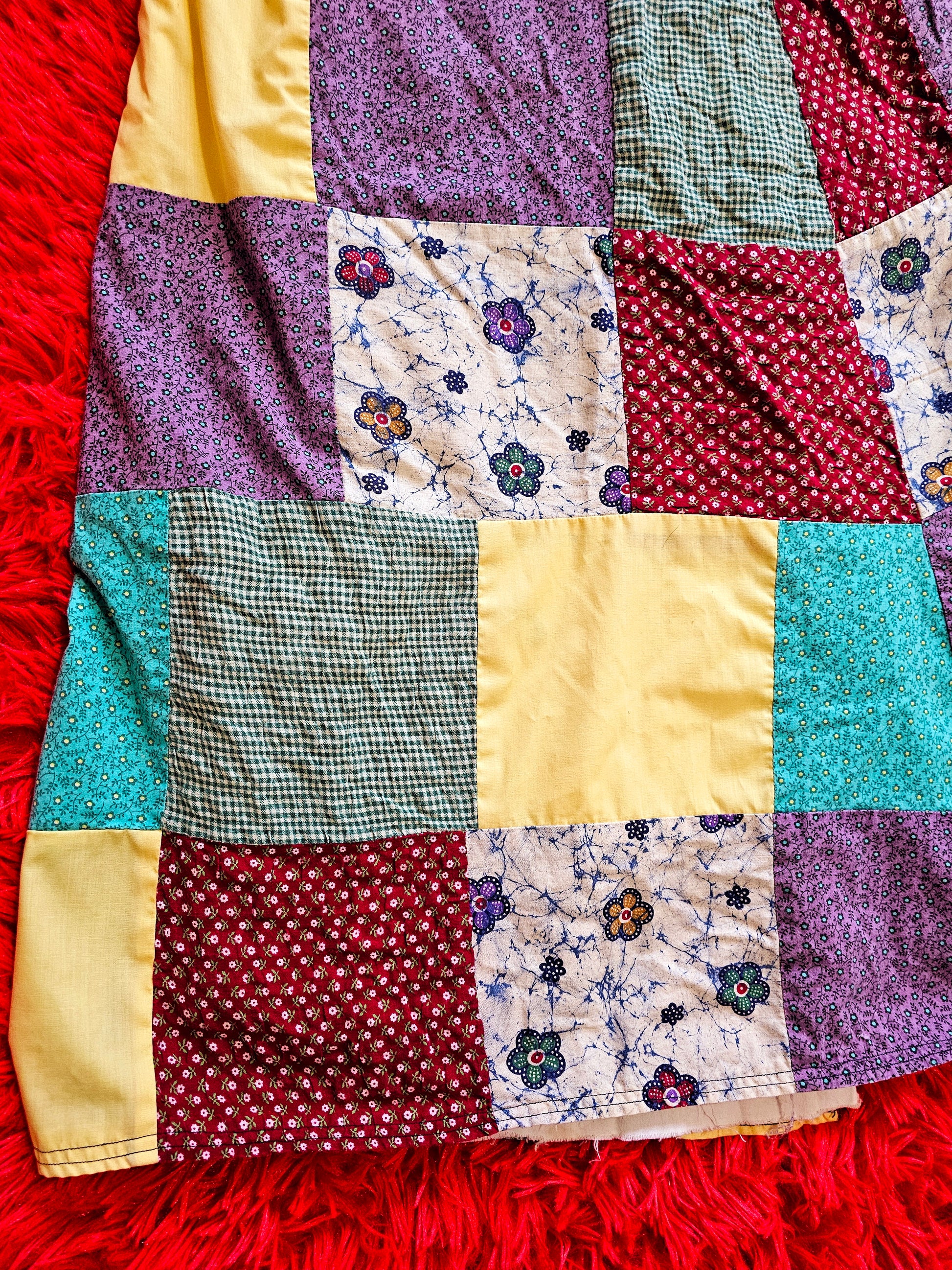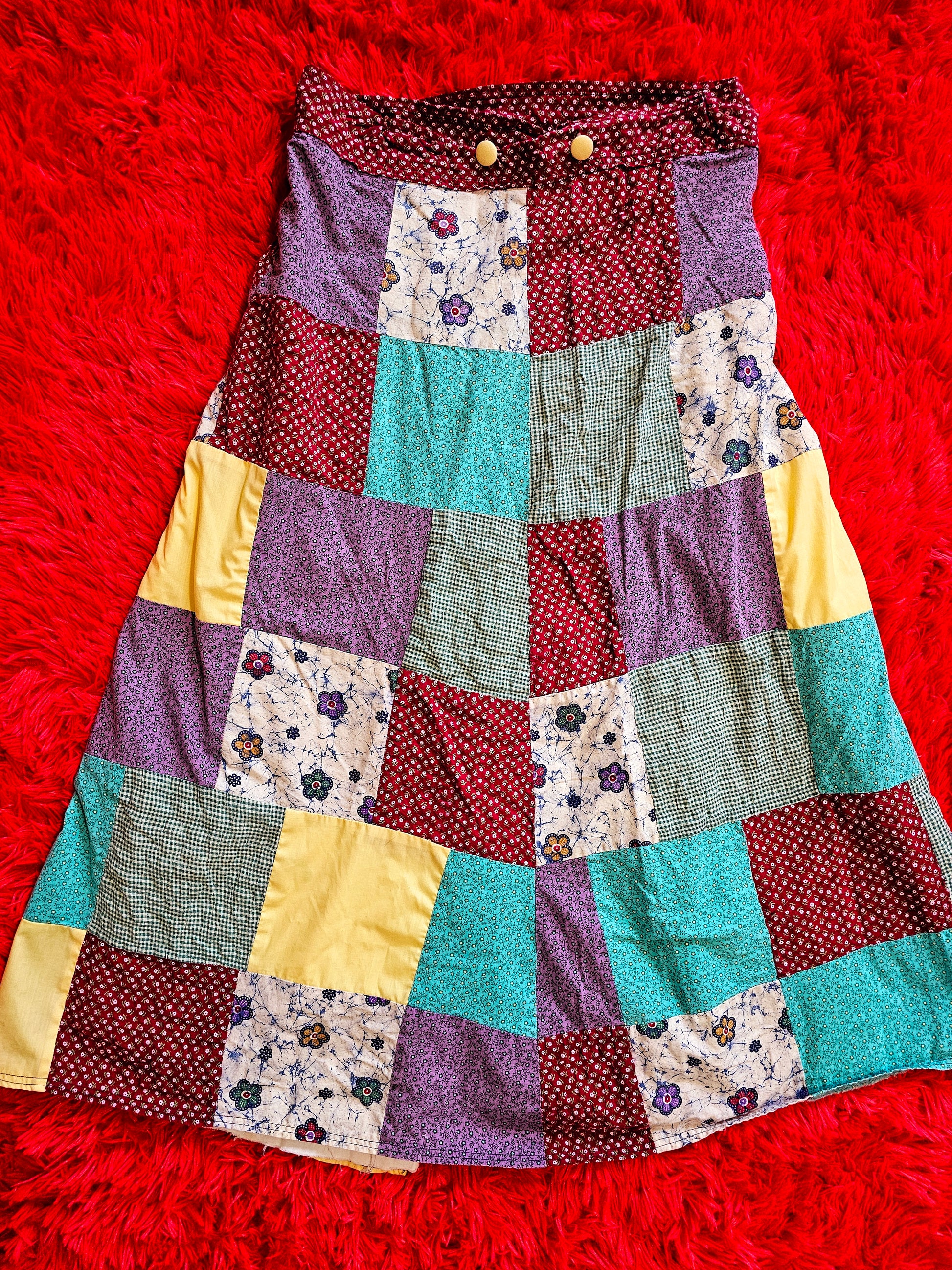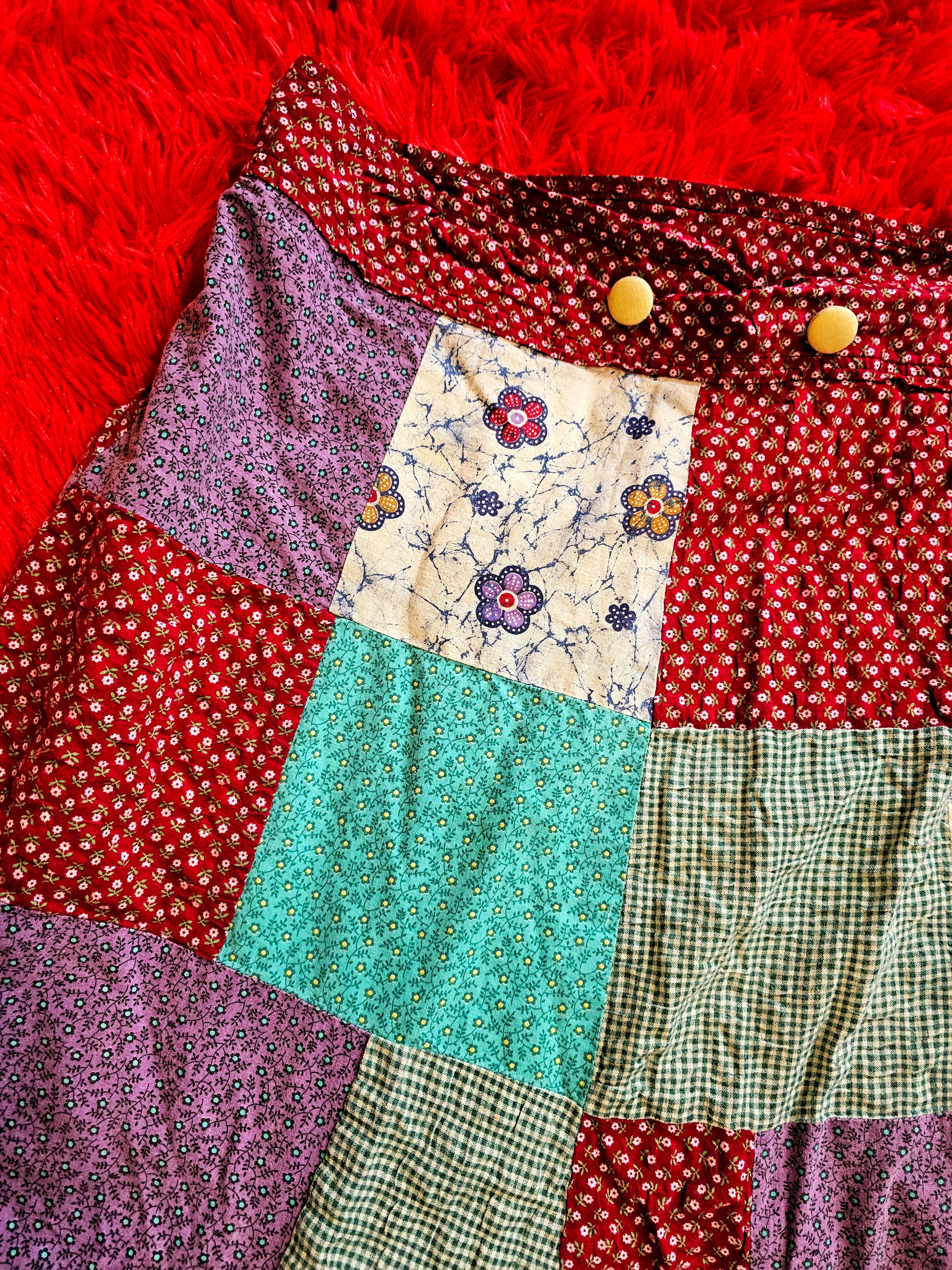 I wish I understood how this 60s patchwork skirt fastened so that it could be modeled but I can't seam to figure it out lol. It appears it's supposed to be a wrap skirt that's adjustable. It's 35" long. If the buttons and supposed to work the way they appear it would be for someone in the XS sizing. Could also alter this to fit your way!