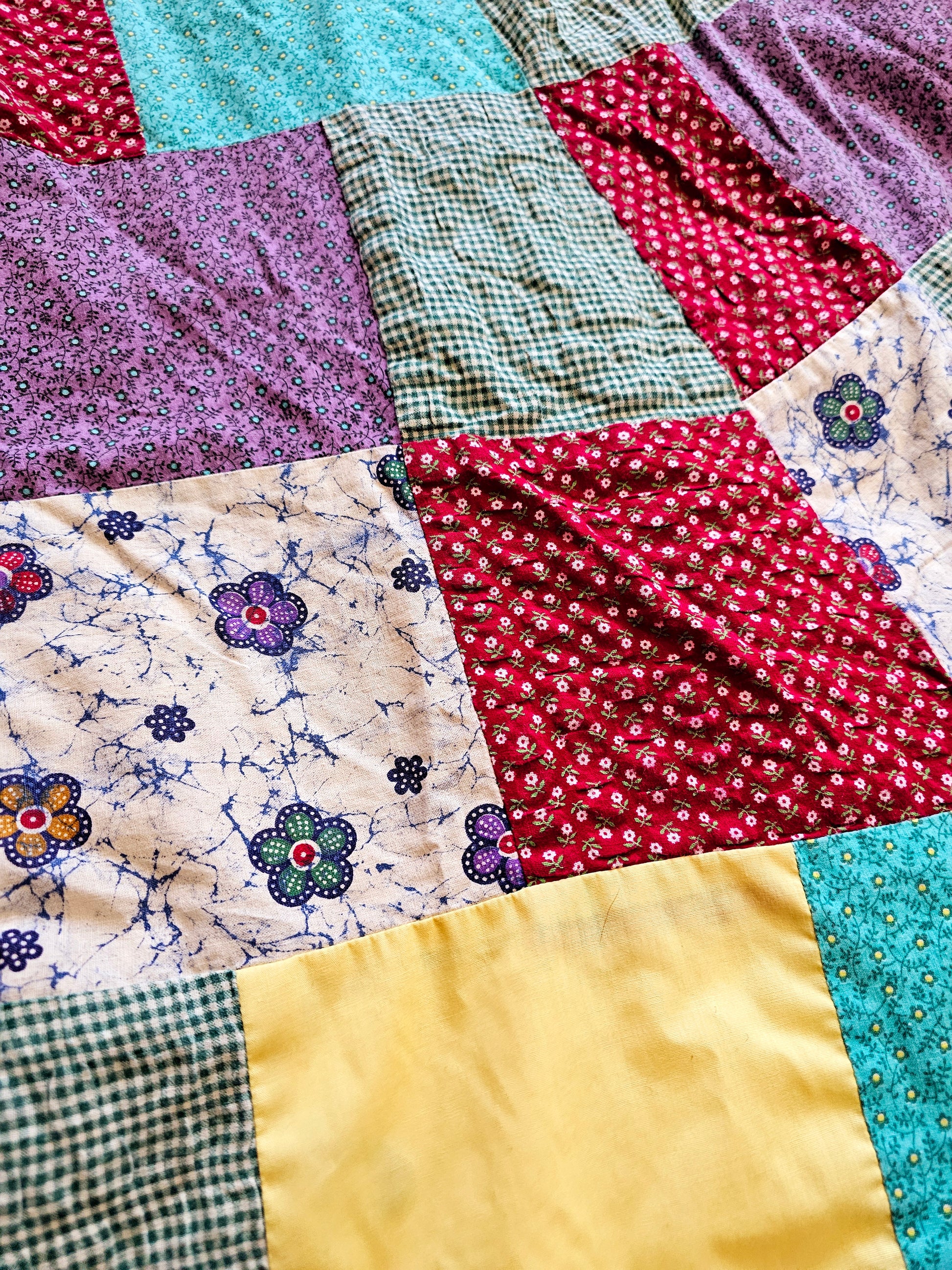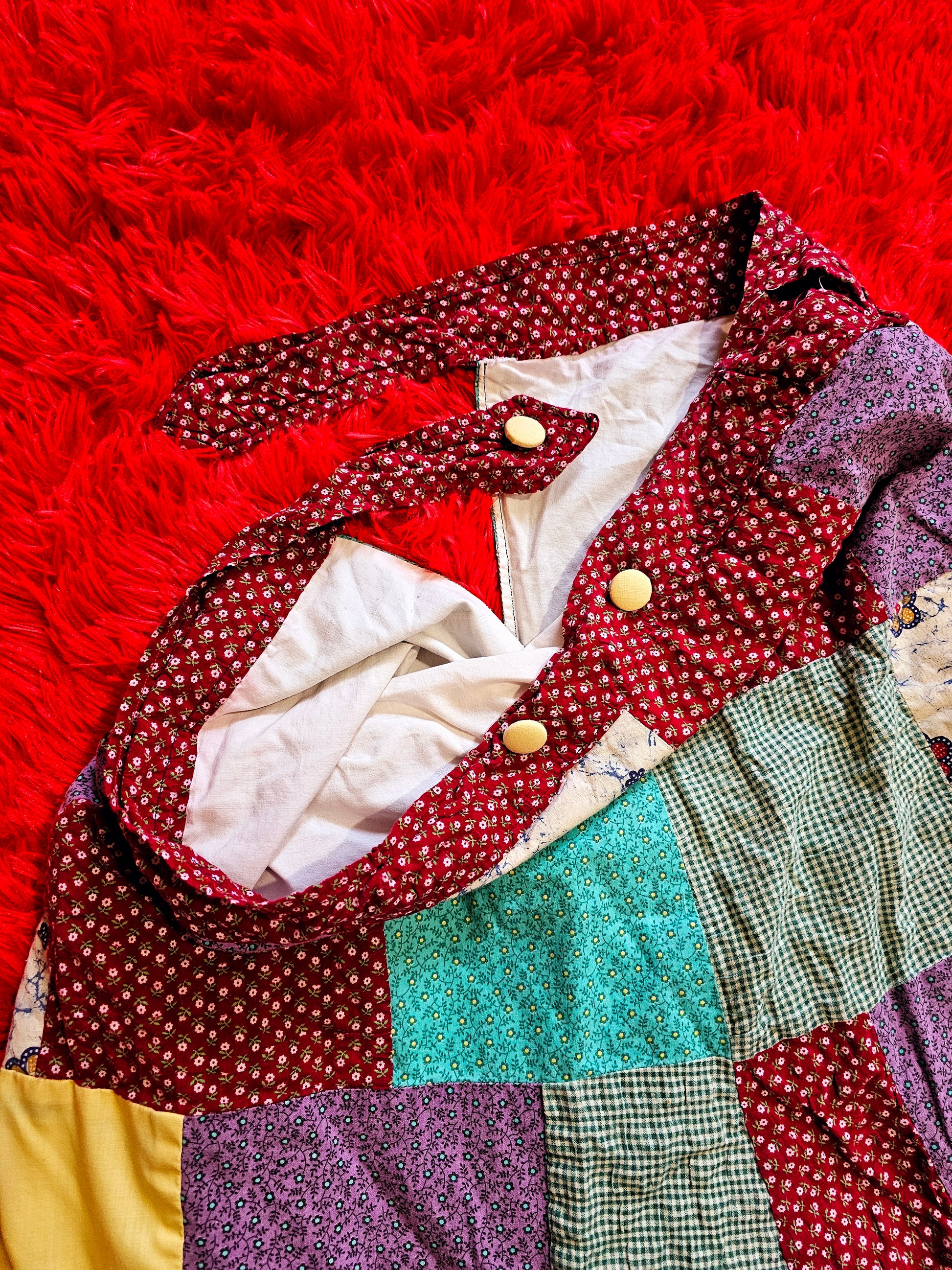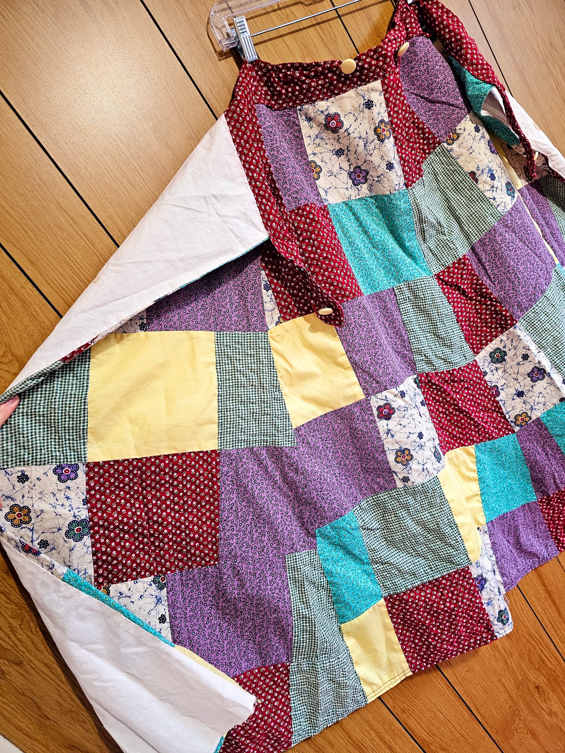 I wish I understood how this 60s patchwork skirt fastened so that it could be modeled but I can't seam to figure it out lol. It appears it's supposed to be a wrap skirt that's adjustable. It's 35" long. If the buttons and supposed to work the way they appear it would be for someone in the XS sizing. Could also alter this to fit your way!