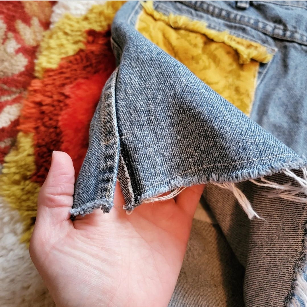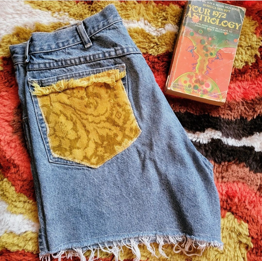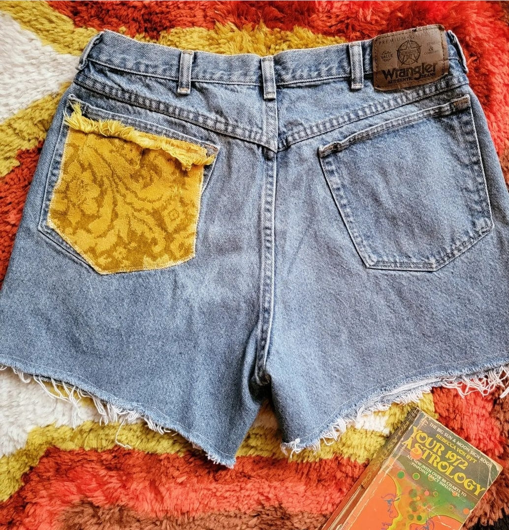 🥲🥲🥲 These reworked vintage Wranglers tho! These pants have been made into shorts, the perfect cut too! The pocket features a golden yellow vintage towel. Cute little side slits have been sewn in. Measurements are 34" waist |12" rise | 5" inseam | 15" across the waist when laid flat