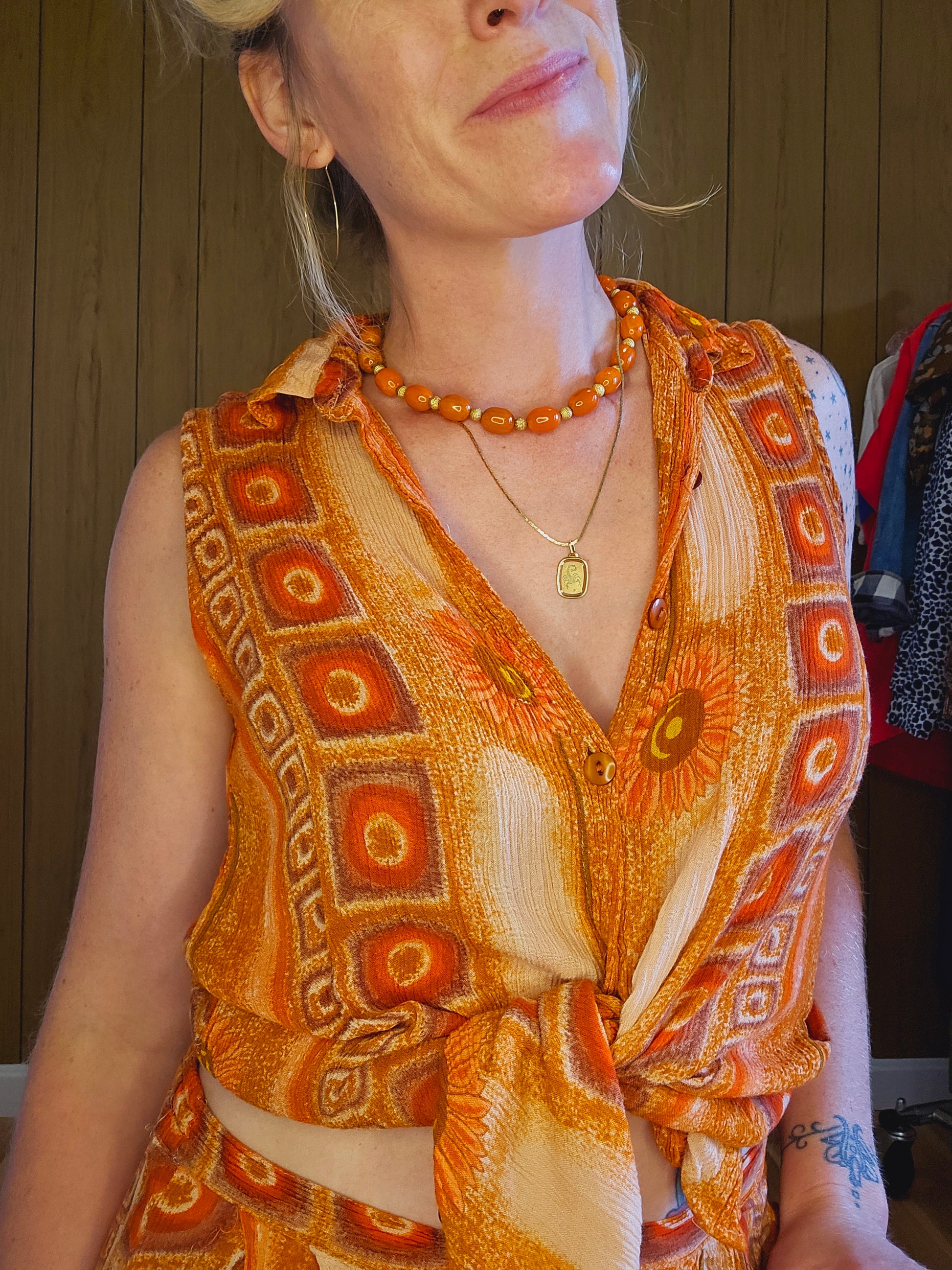 100% rayon. Sleeveless button down top. Thin beachy material (not sheer though) with great movement. Marked a size small but was intended to fit very loose, so fits up to size large depending on desired fit.