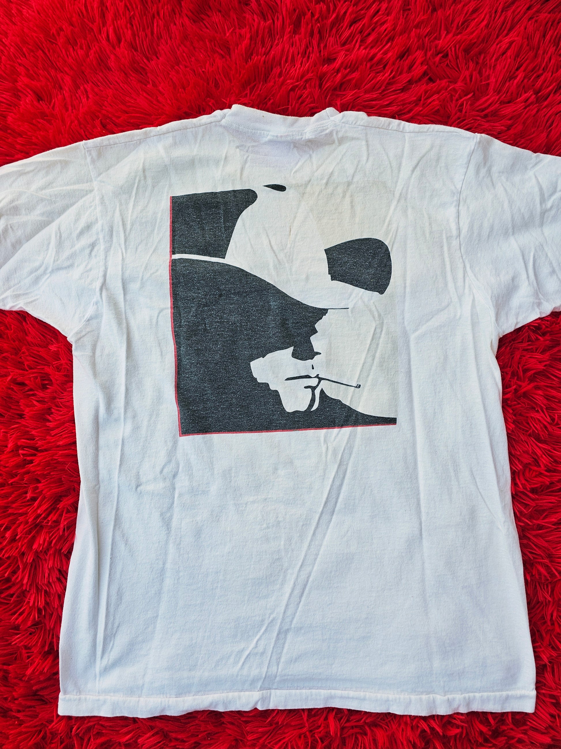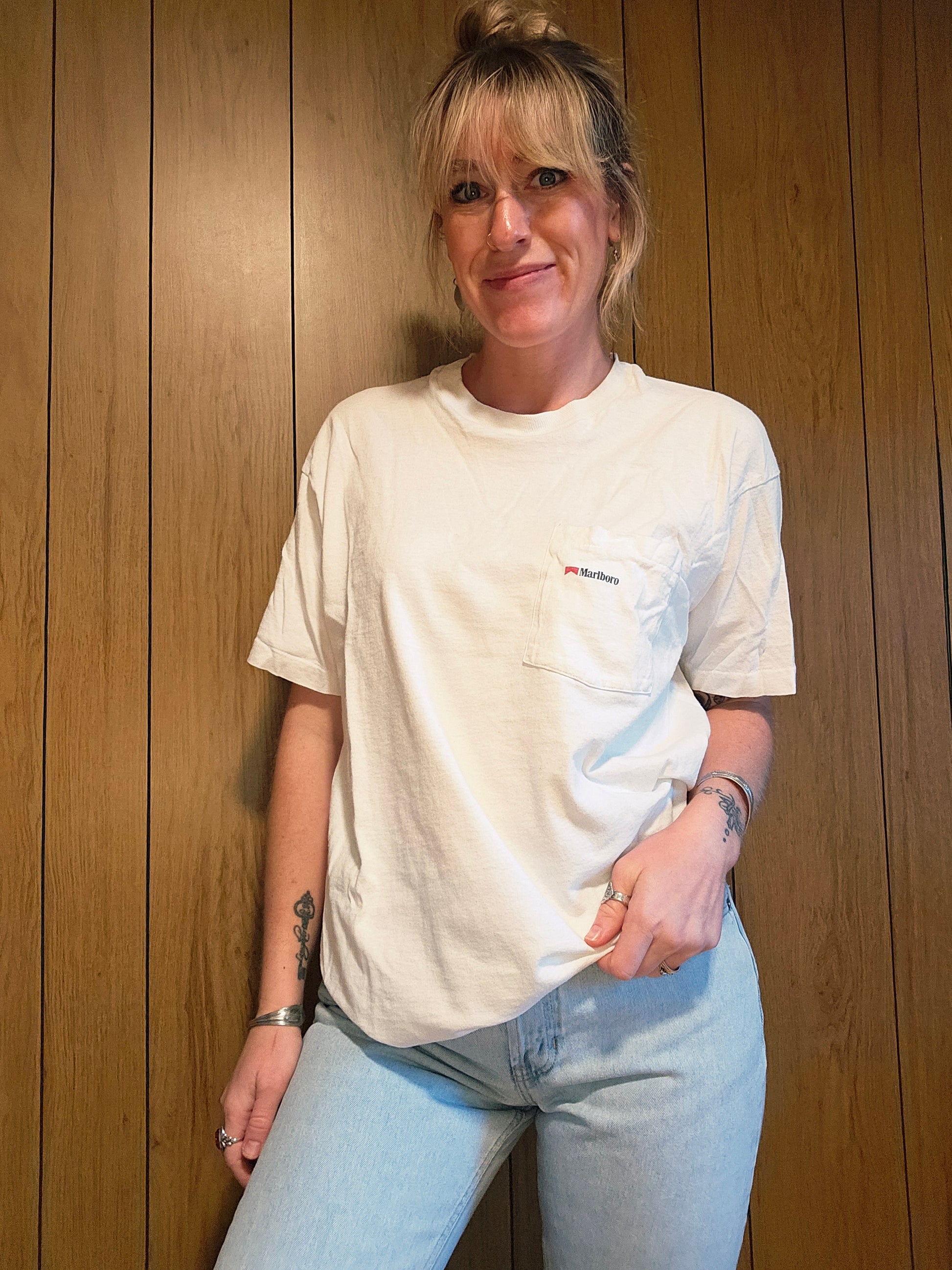 1990s Marlboro Man "Wild West Collection" t-shirt featuring the iconic cowboy silhouette graphic on the back! There are two of these available. Each does have yellowing around the neckline and lightly within the logo on the back--and has general fading throughout the logo. Measurements taken laid flat: chest (armpit to armpit) 23", length 26".