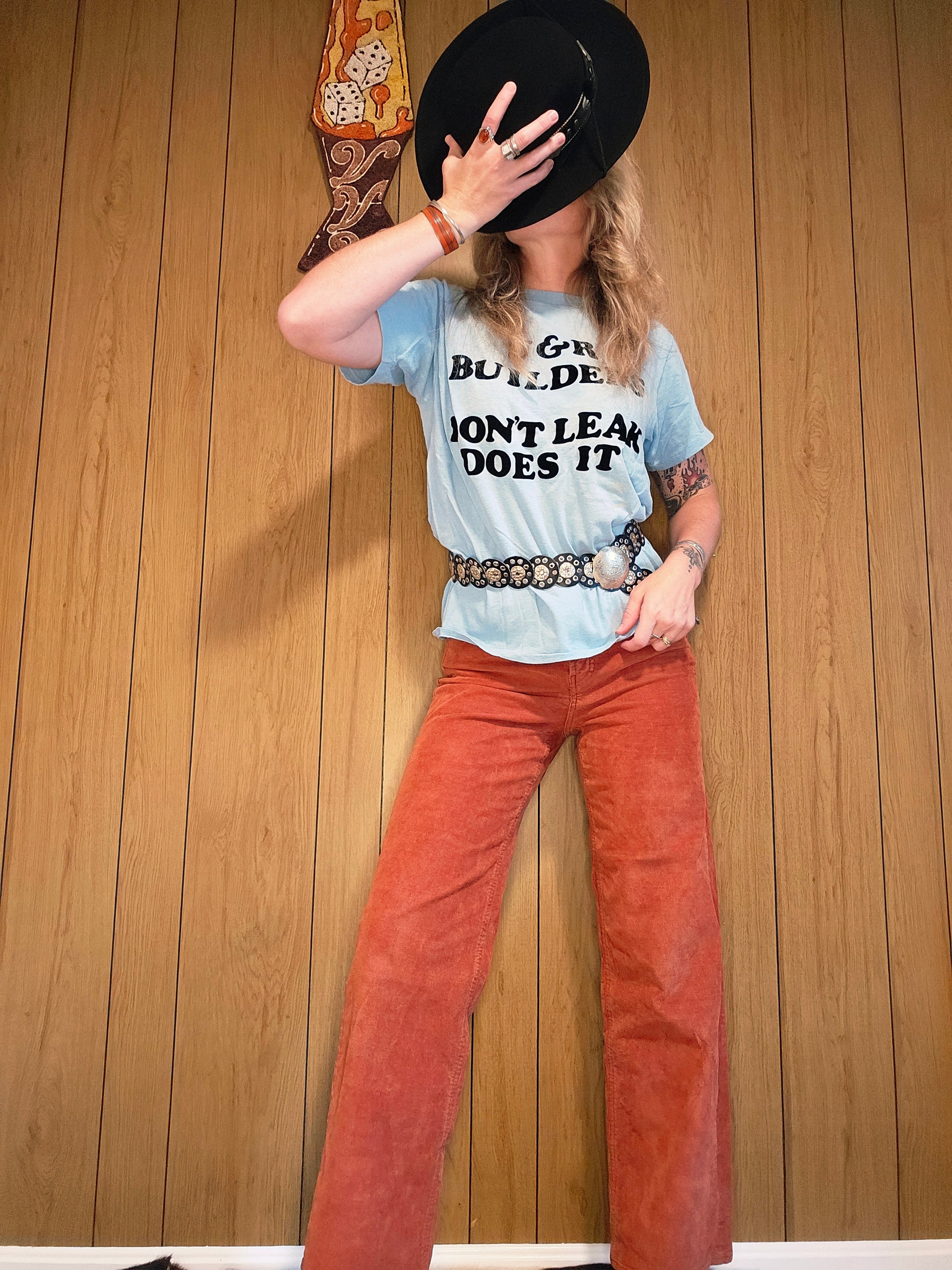 Dont leak does it? 😂 J&R Builders got straight to the point with their slogan! I live for these vintage DIY transfer tees. This 1970s tee is light blue with black lettering and is soft and perfectly thinnned. It's marked size XL but appears to be closer to a modern L. Please refer to measurements below, taken laid flat. Generally great condition. Some piling and there is a small dime sized stain on the front bottom right as pictured. Chest 21"●Shoulders 17"●Length 23"