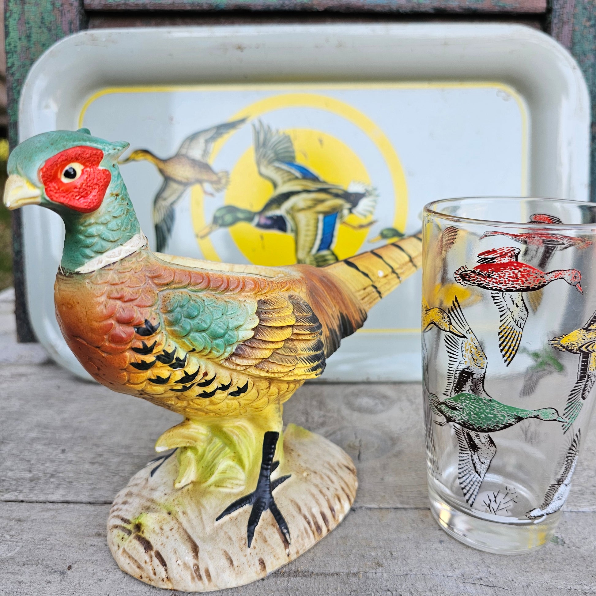 Bird bundle! Great gift for the fowl hunter, man caver, or bird watcher in your life. Vintage tumbler glass, tin and planter! Planter measures 10.5" long beak to tail. The glass is 6.5" tall. The tray measures 9" X 14".
