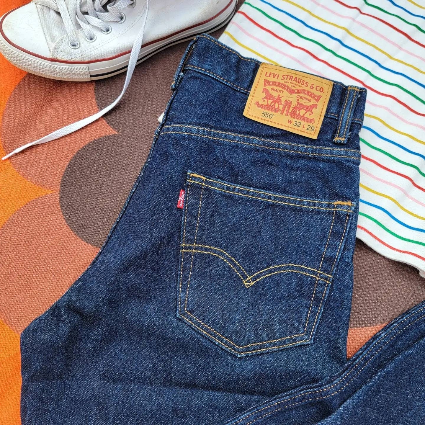 Vintage Levi 550s! Deadstock condition! High waist button zip fly. Dark wash. Loose straight fit. Marked as W32 L29. Know your measurements! See below, taken laid flat (not doubled):