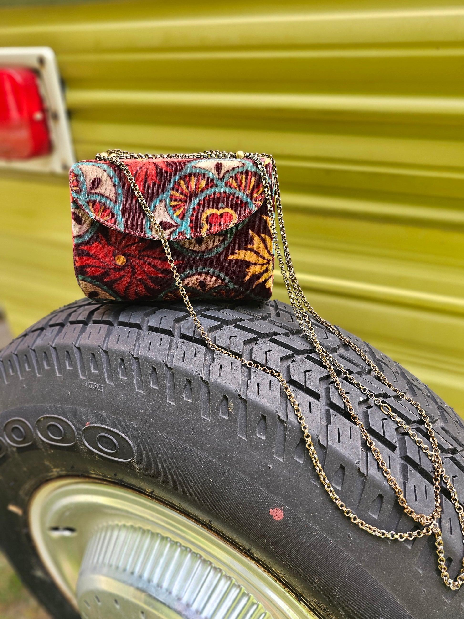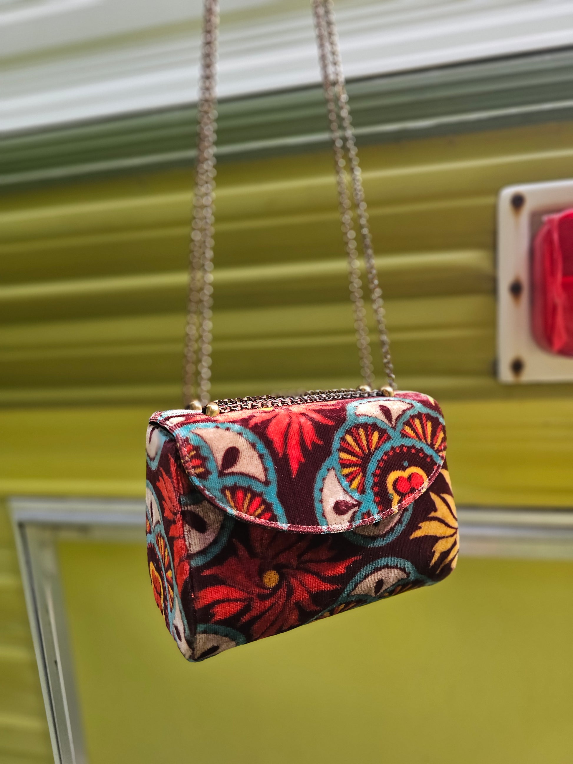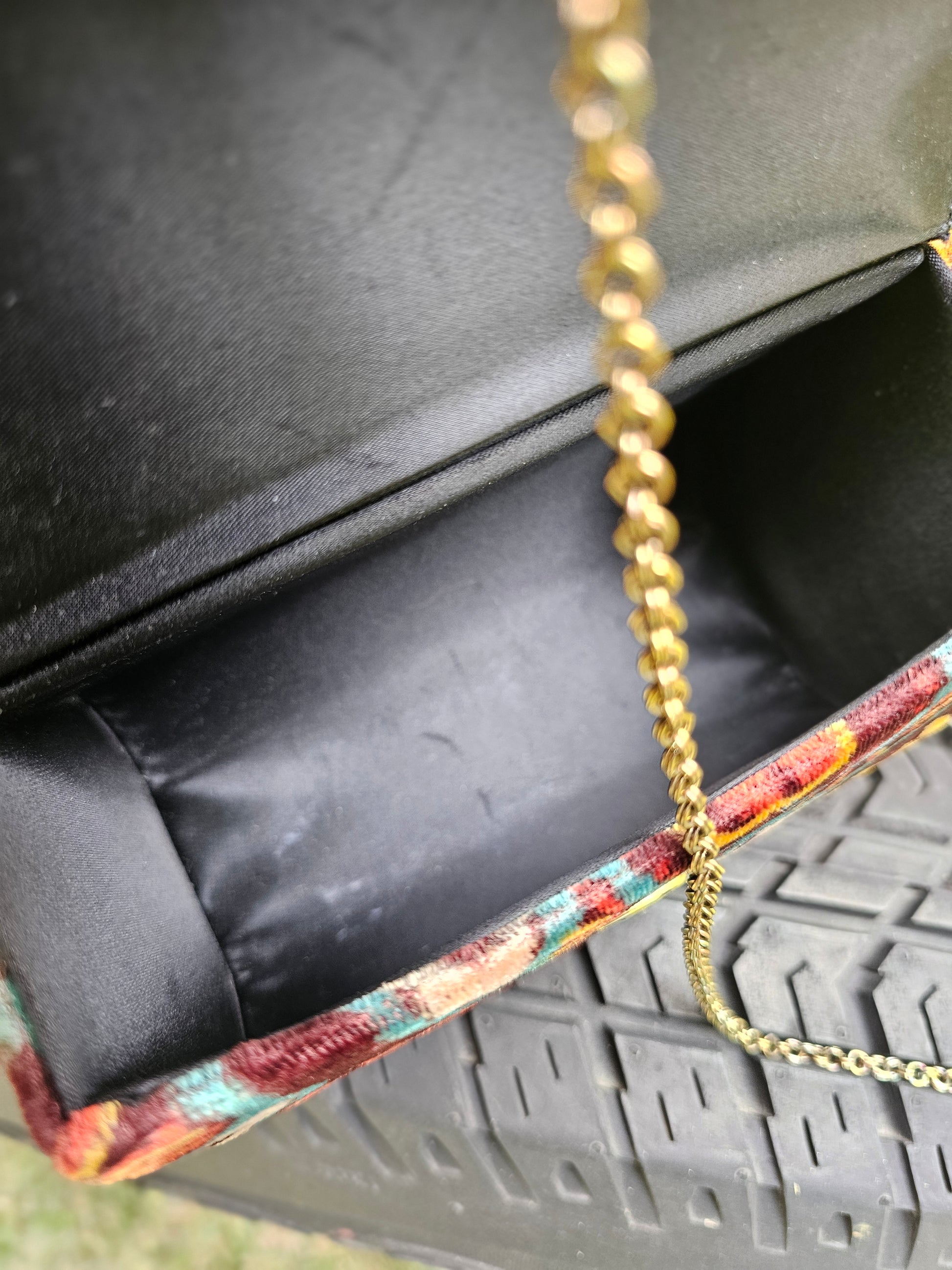 SO CUTE! This vintage small, rectangular purse is velvety, firm structured and has double metal chain straps. The fabric is bold, colorful, and has a intricate floral and paisley-inspired pattern. It's 20" long including the chain straps. The bag itself is about 6.5" wide and 4" tall. Great vintage conditon.